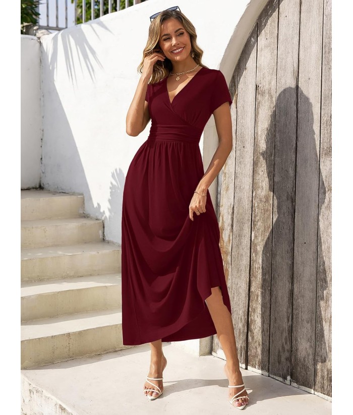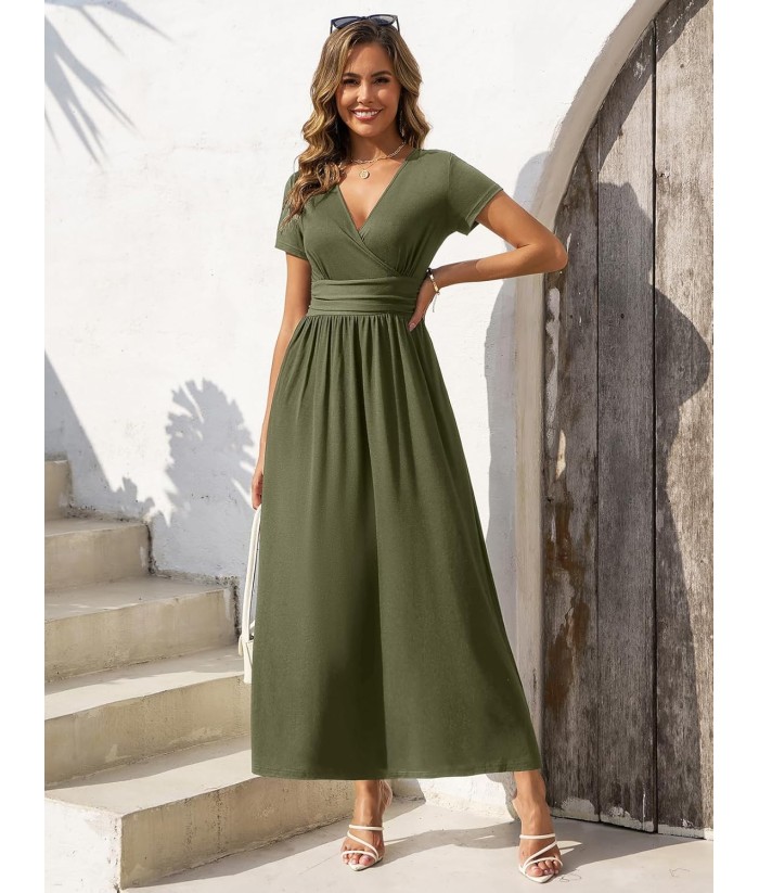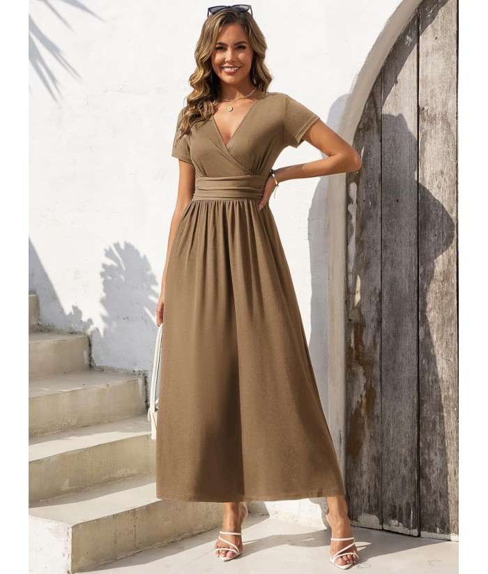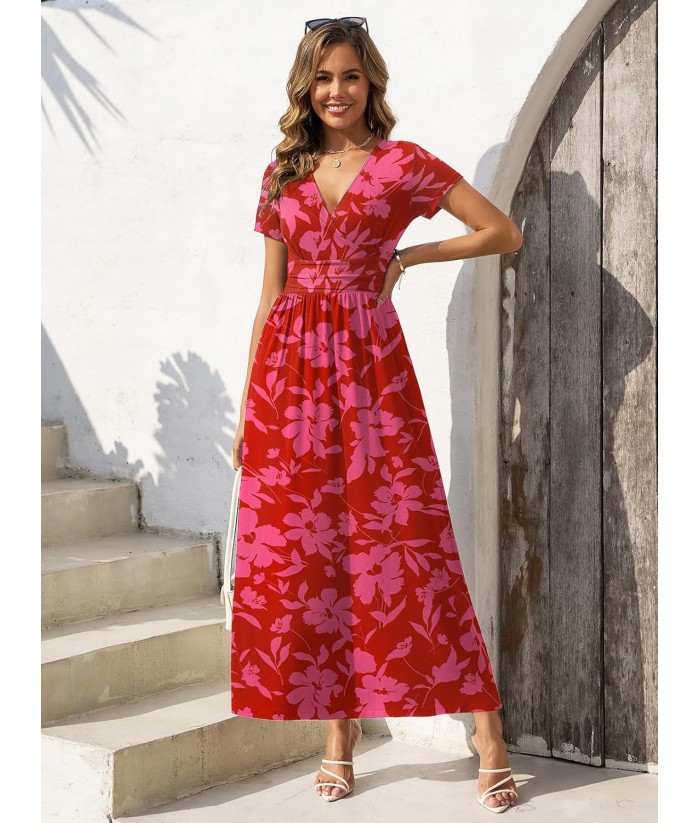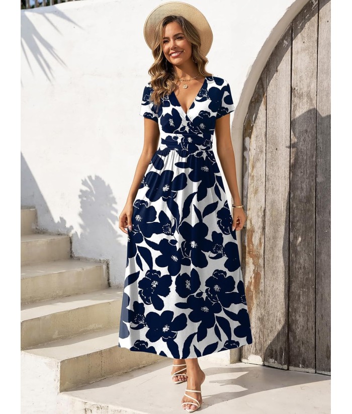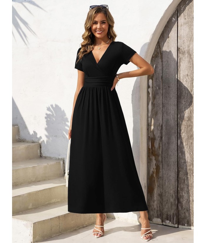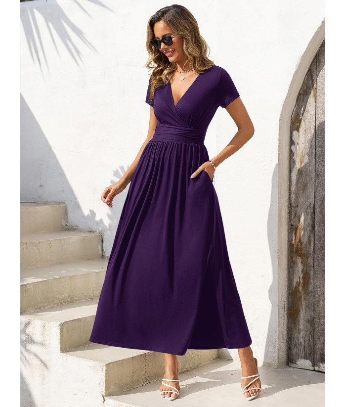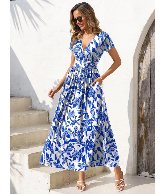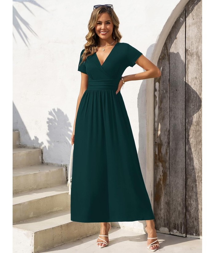 Gracyoga Women's Summer Dresses 2025 Short Sleeve Maxi Dress Casual V Neck Flowy Sundress with Pockets