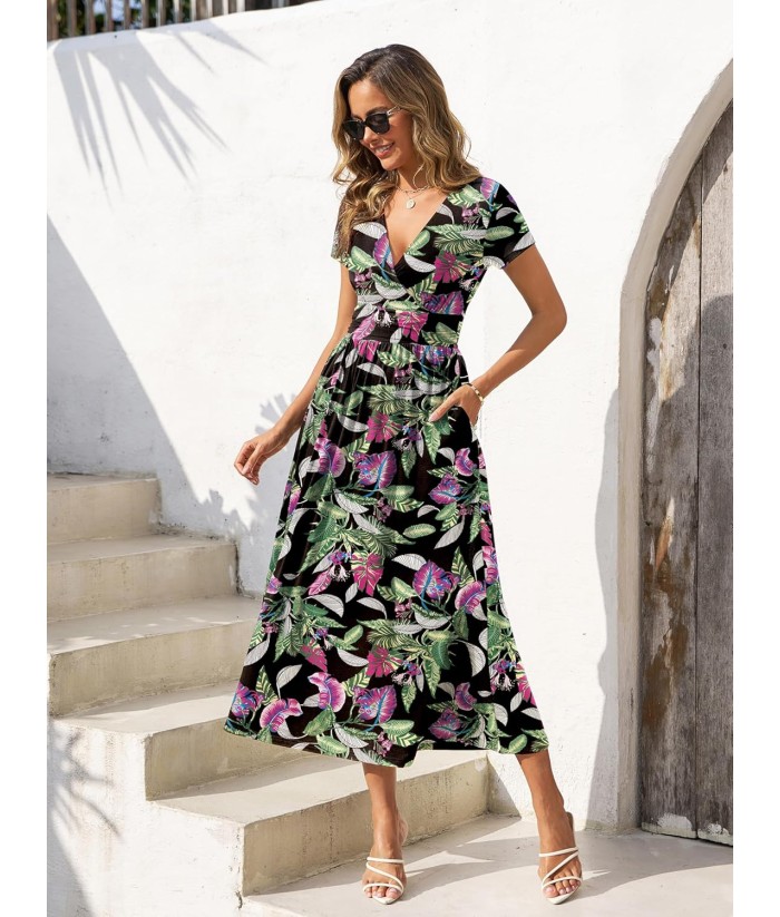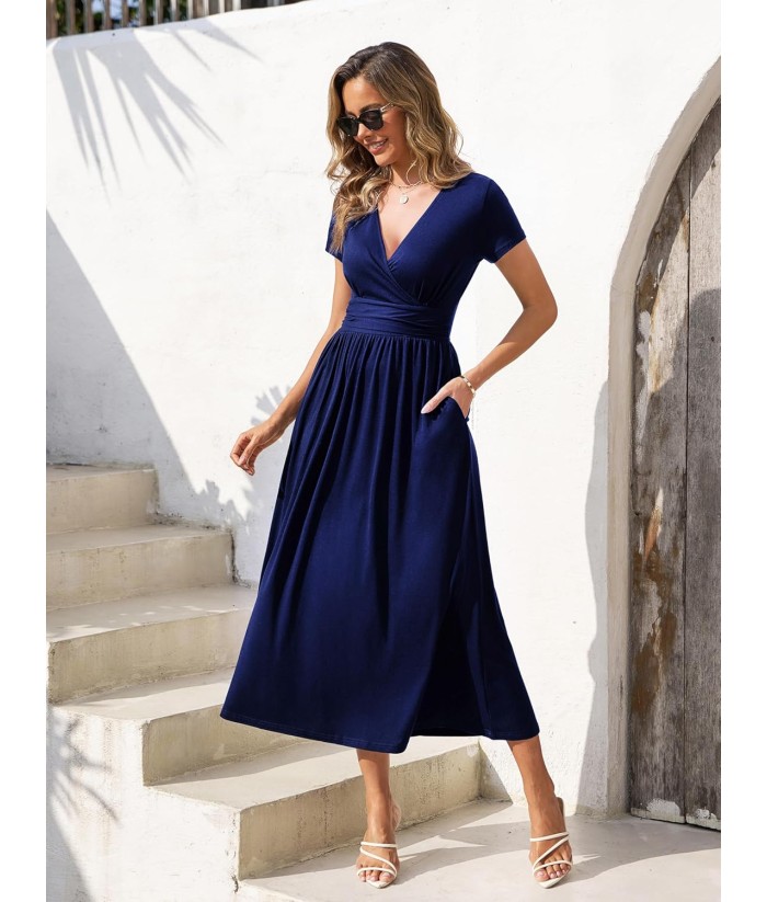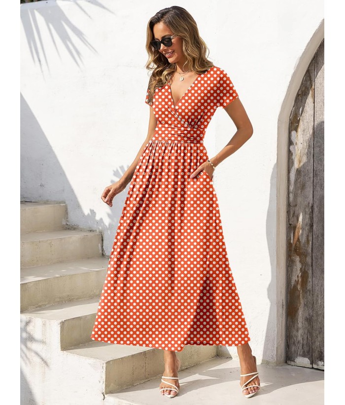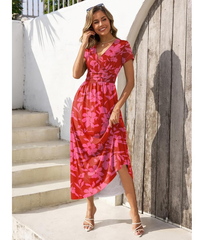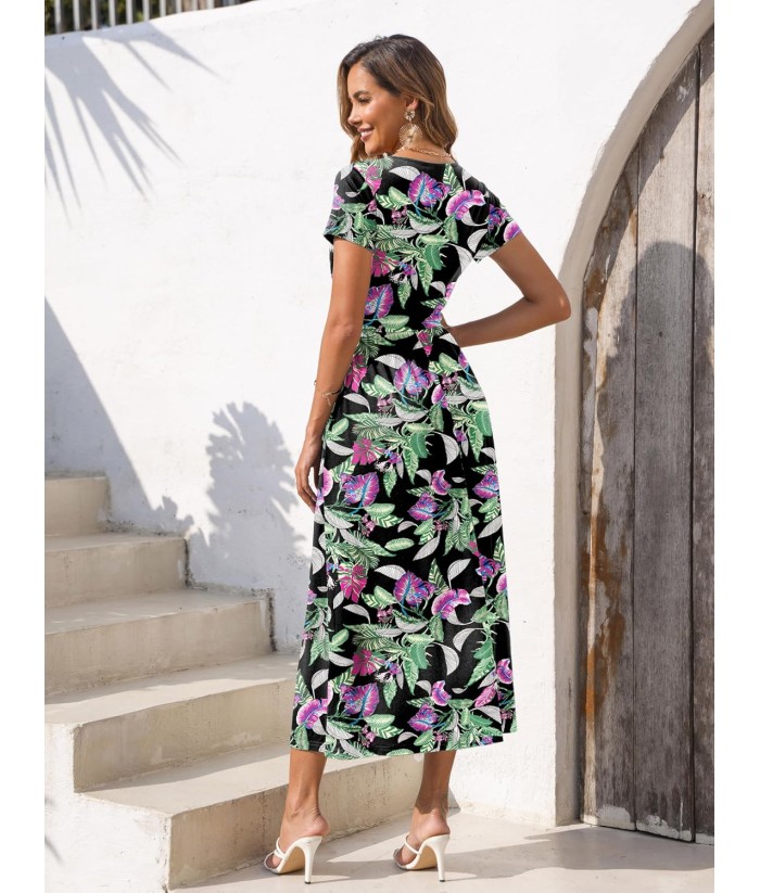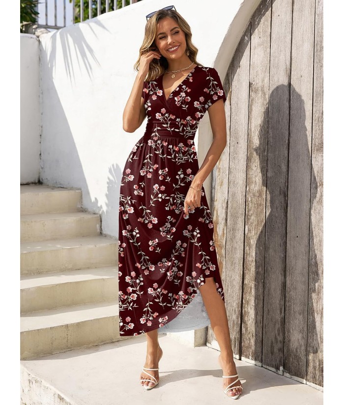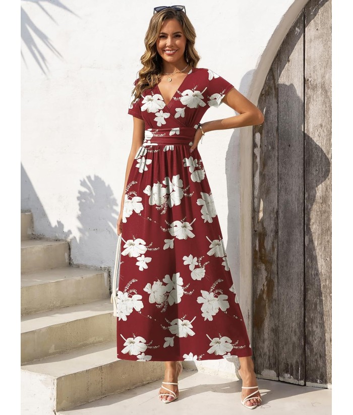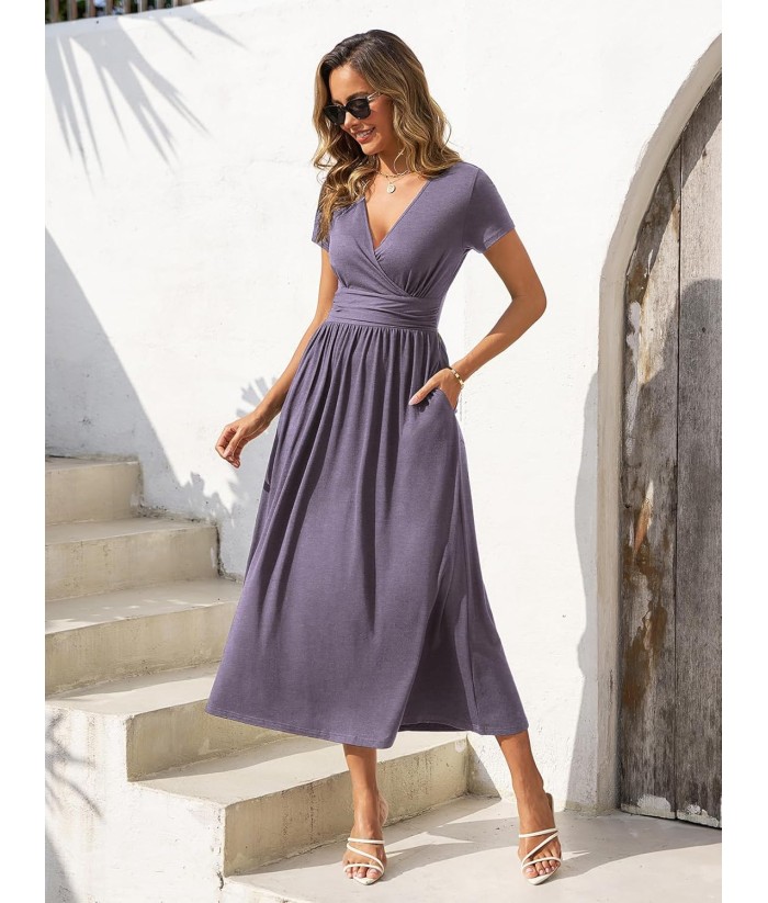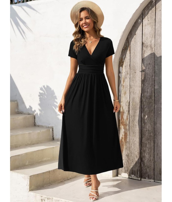 Gracyoga Women's Summer Dresses 2025 Short Sleeve Maxi Dress Casual V Neck Flowy Sundress with Pockets
