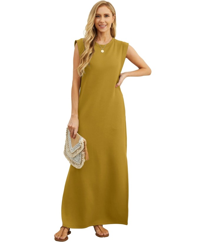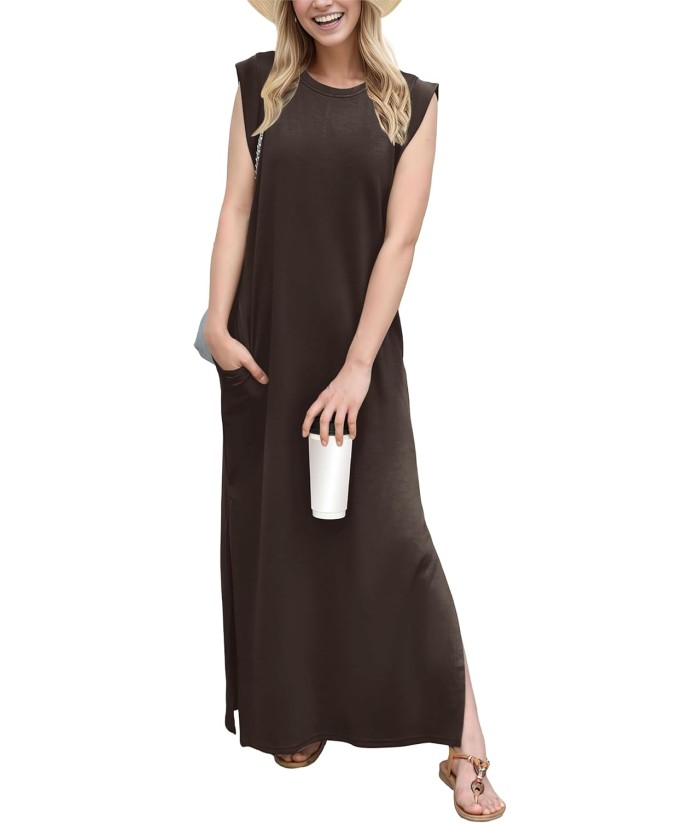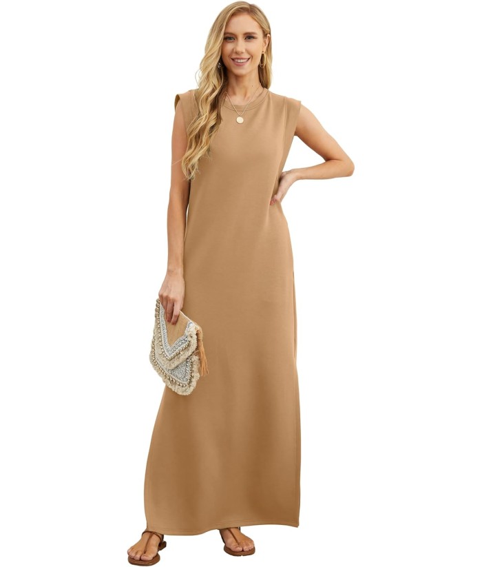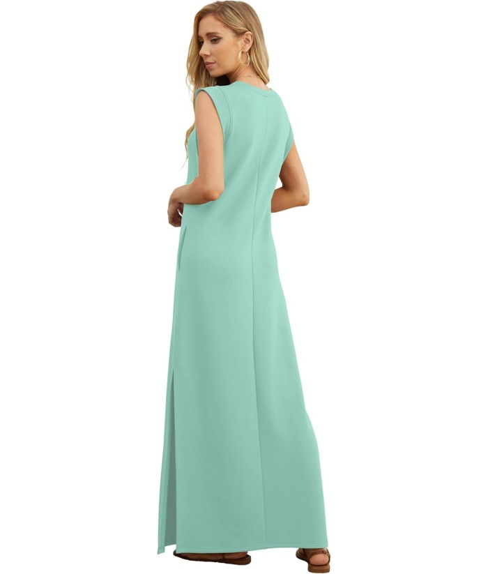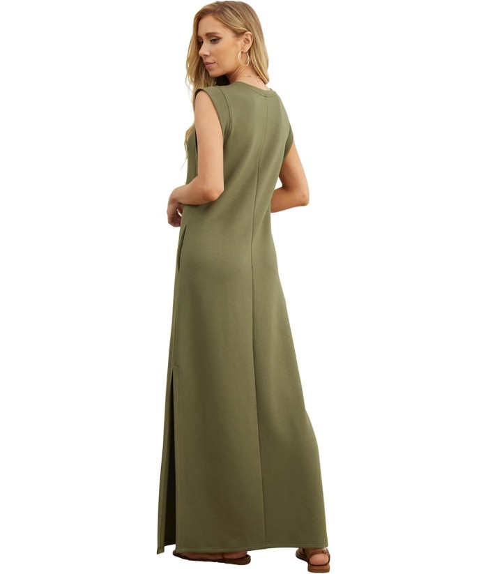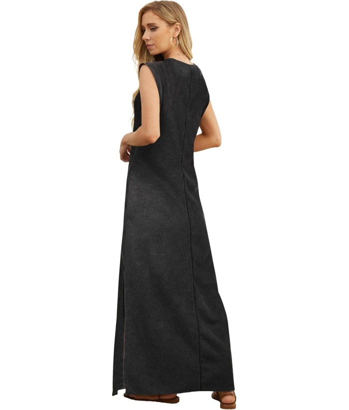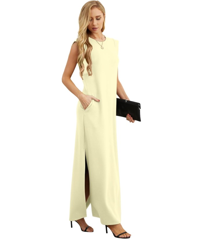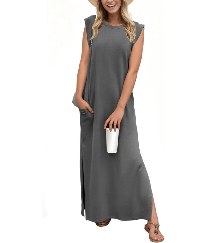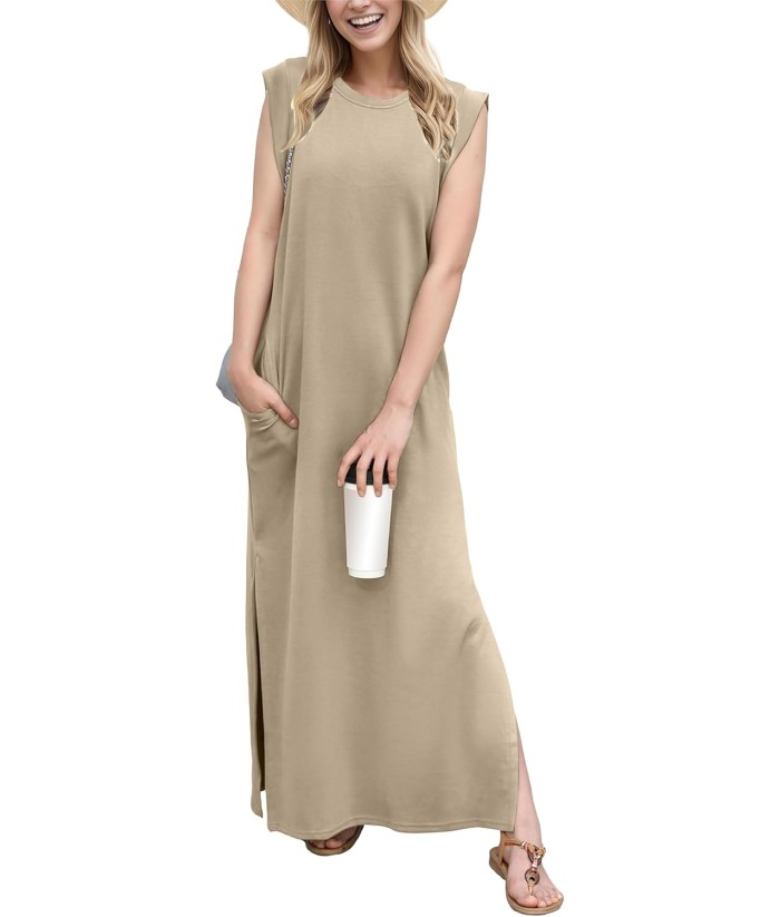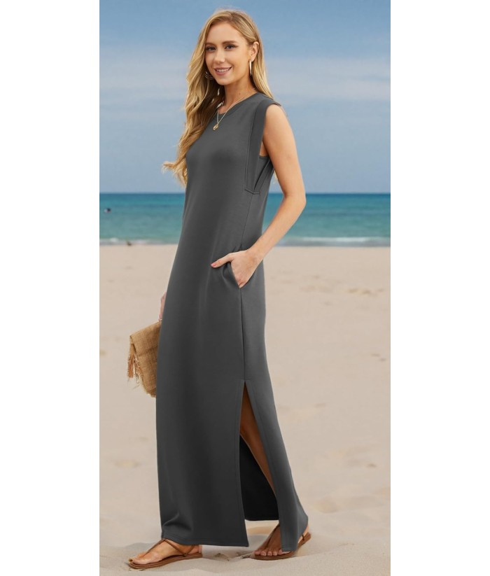 GRECERELLE 2025 Women Year-Round Casual Round Neck Loose Split Wrinkle-Free Long Maxi Vacation Dress with Pockets (XS-3XL)