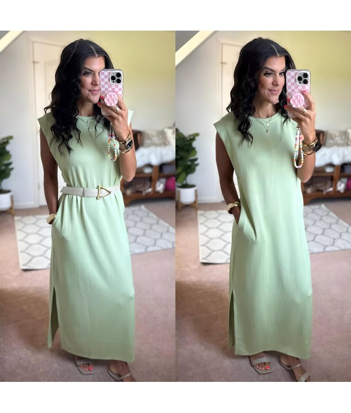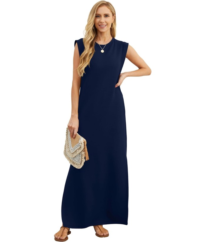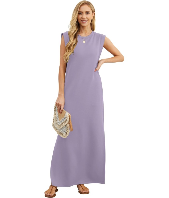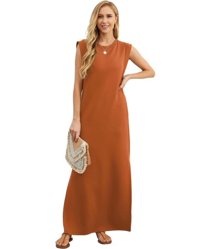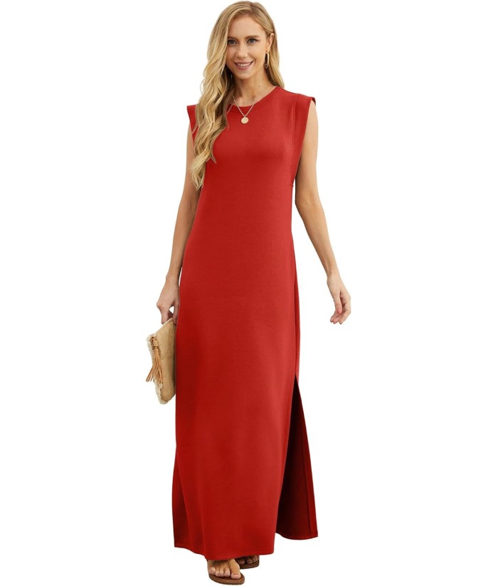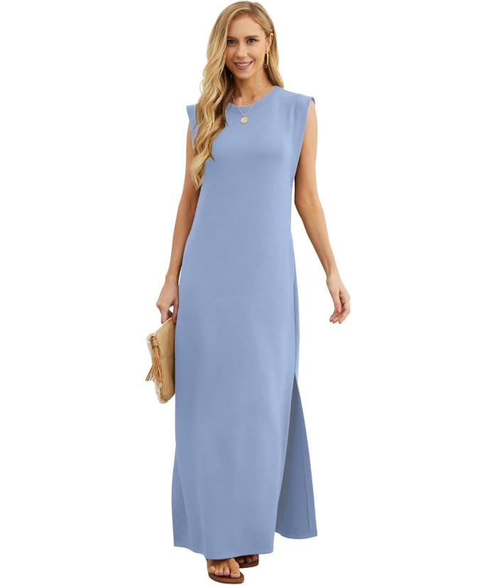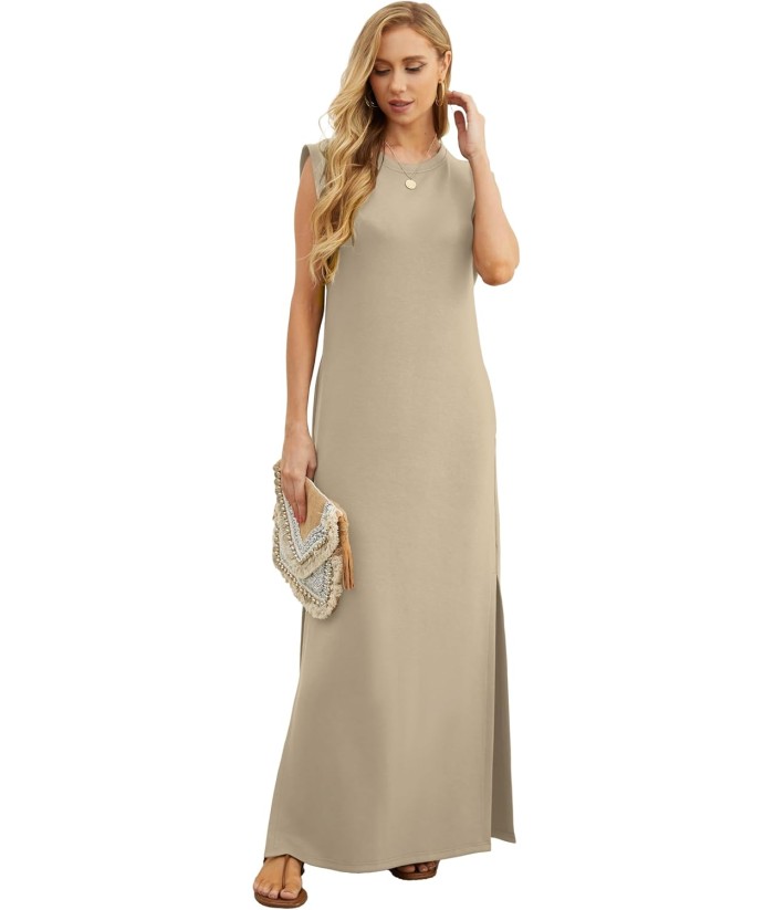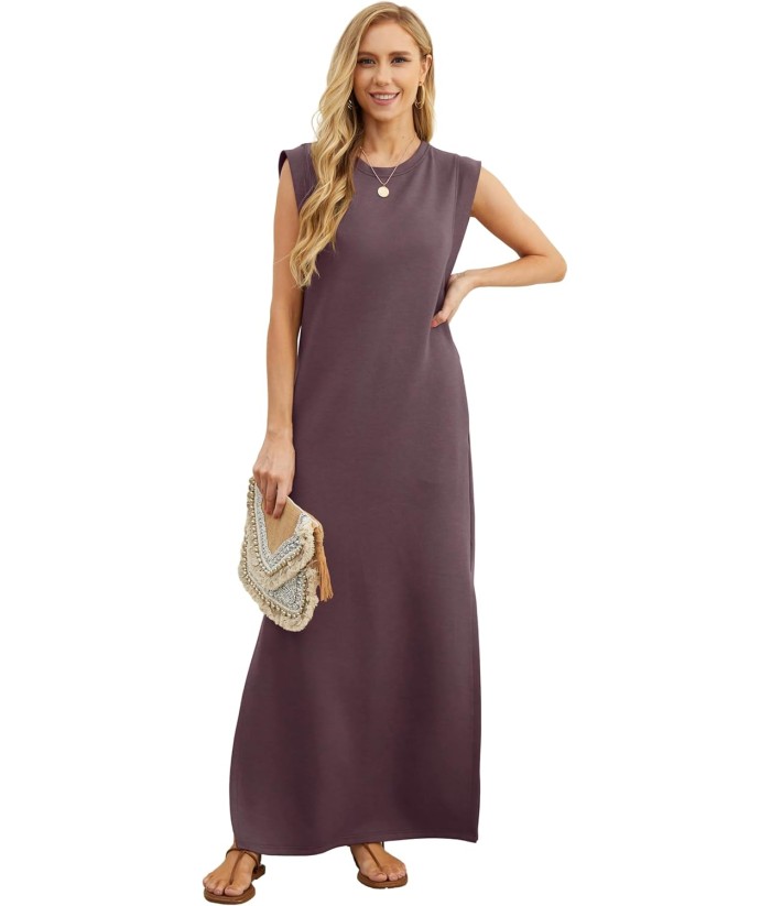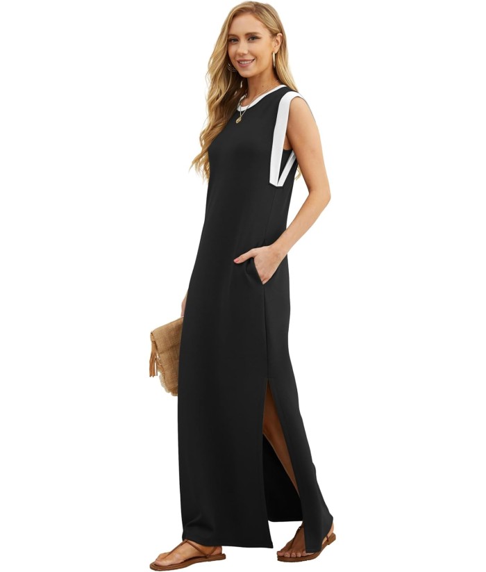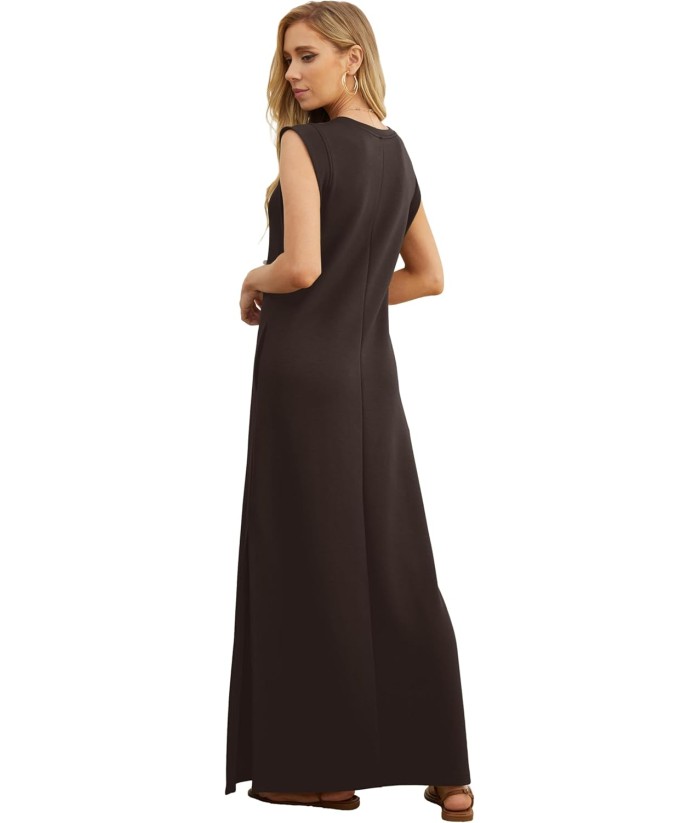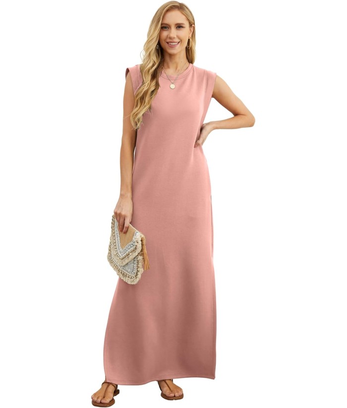 GRECERELLE 2025 Women Year-Round Casual Round Neck Loose Split Wrinkle-Free Long Maxi Vacation Dress with Pockets (XS-3XL)