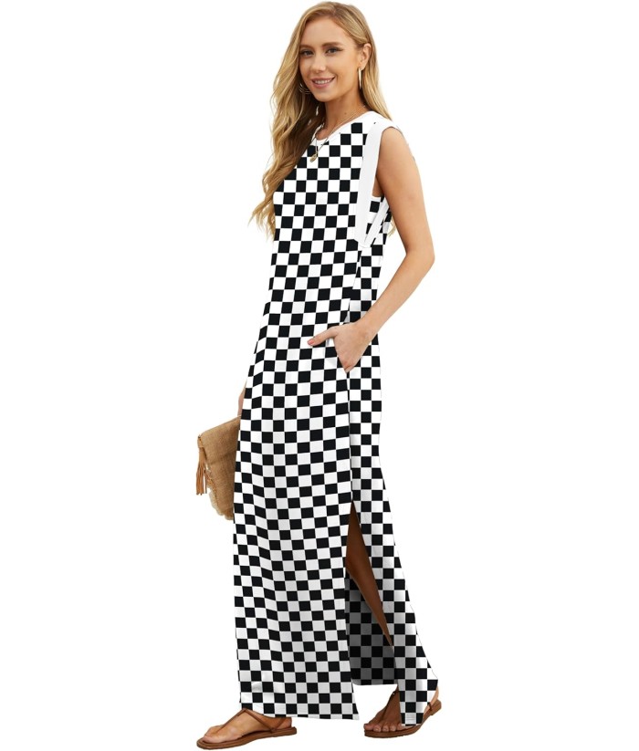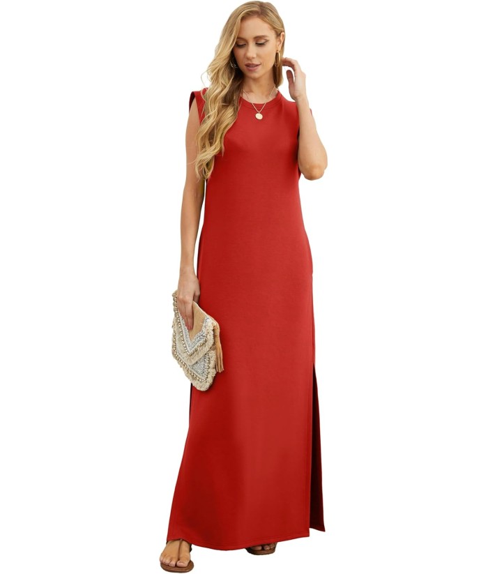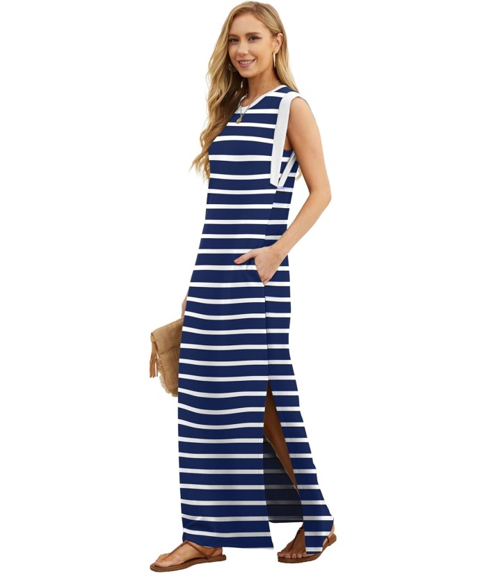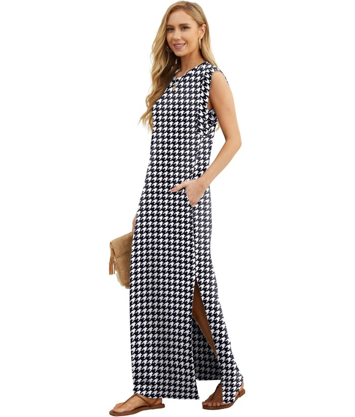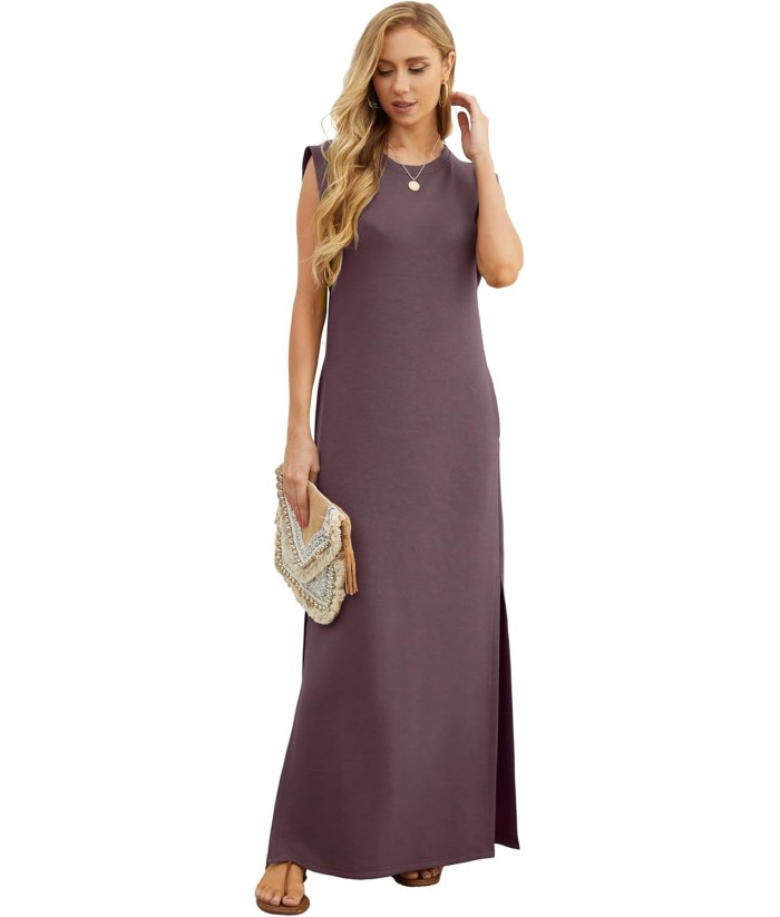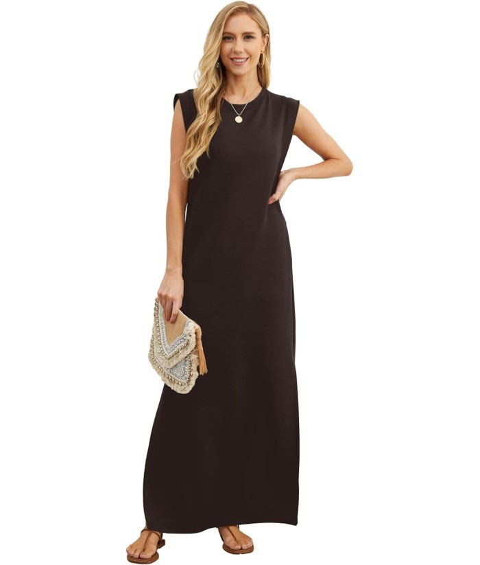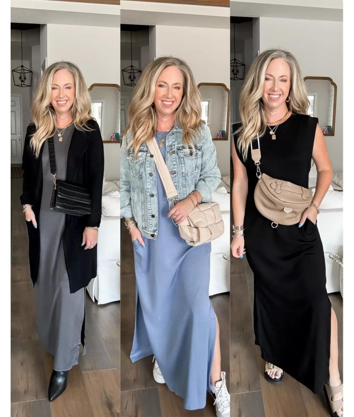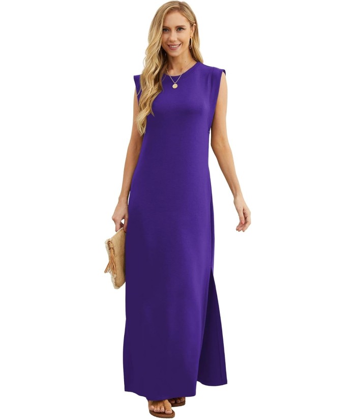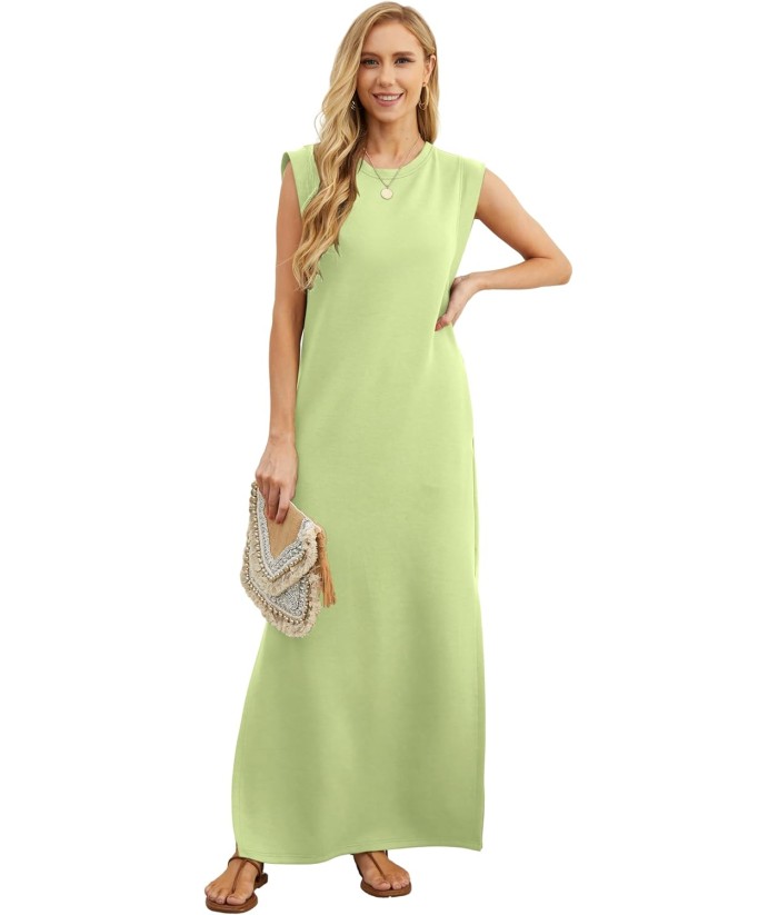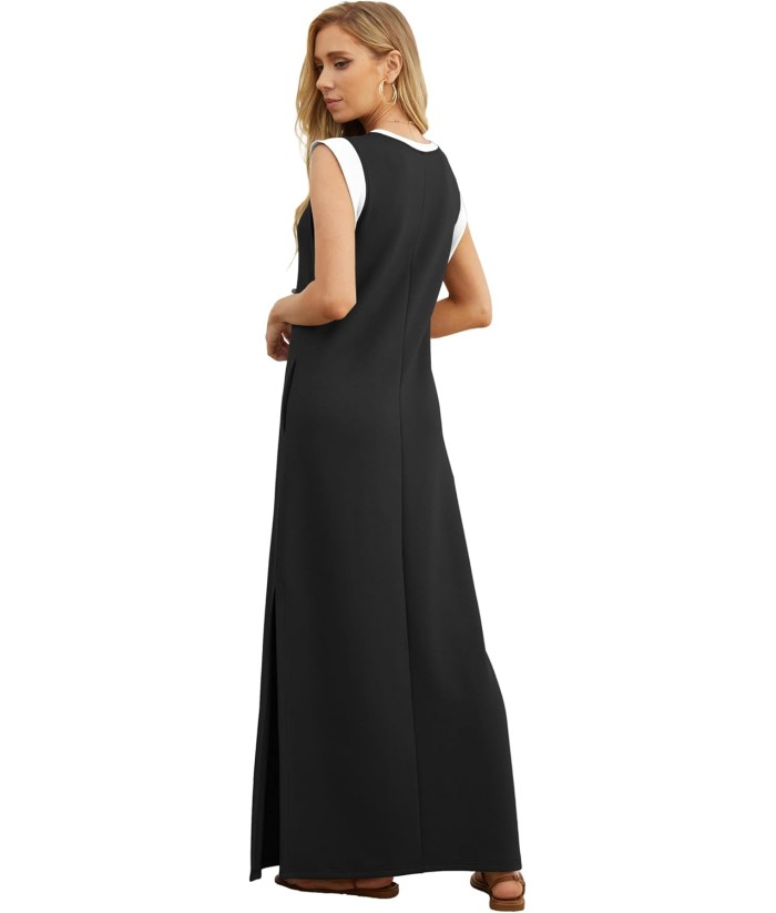 GRECERELLE 2025 Women Year-Round Casual Round Neck Loose Split Wrinkle-Free Long Maxi Vacation Dress with Pockets (XS-3XL)