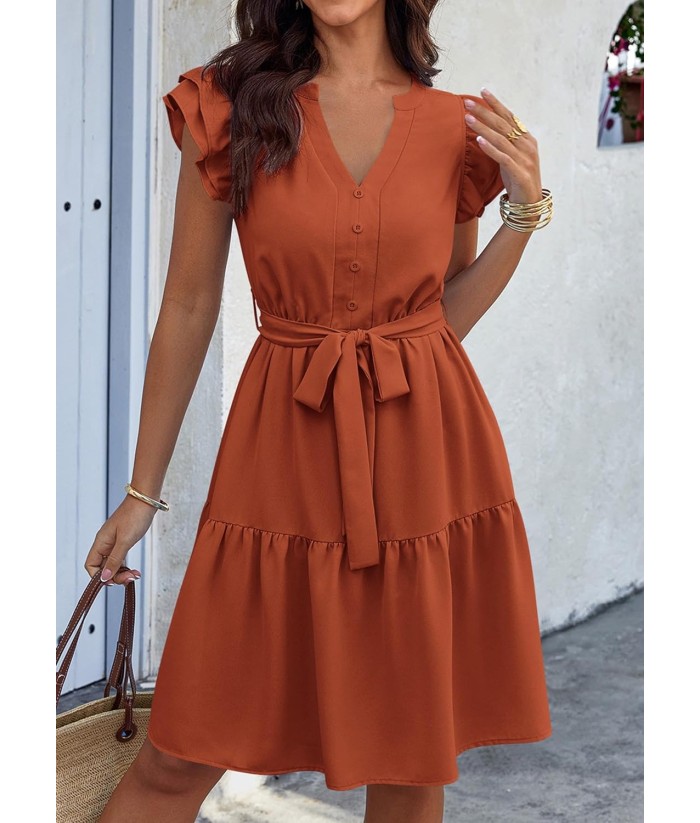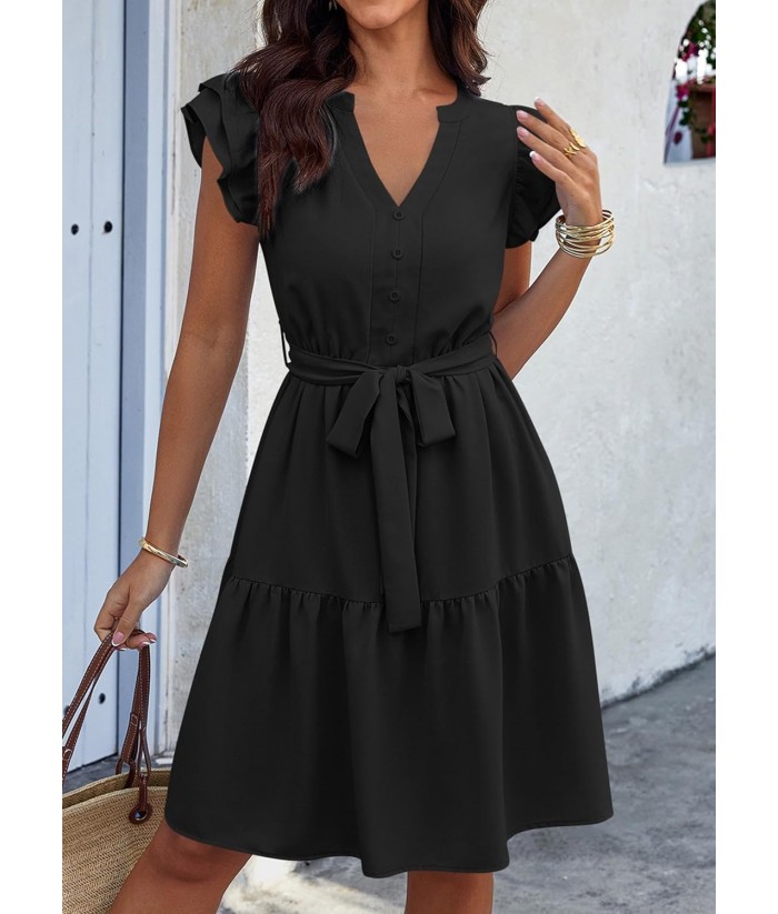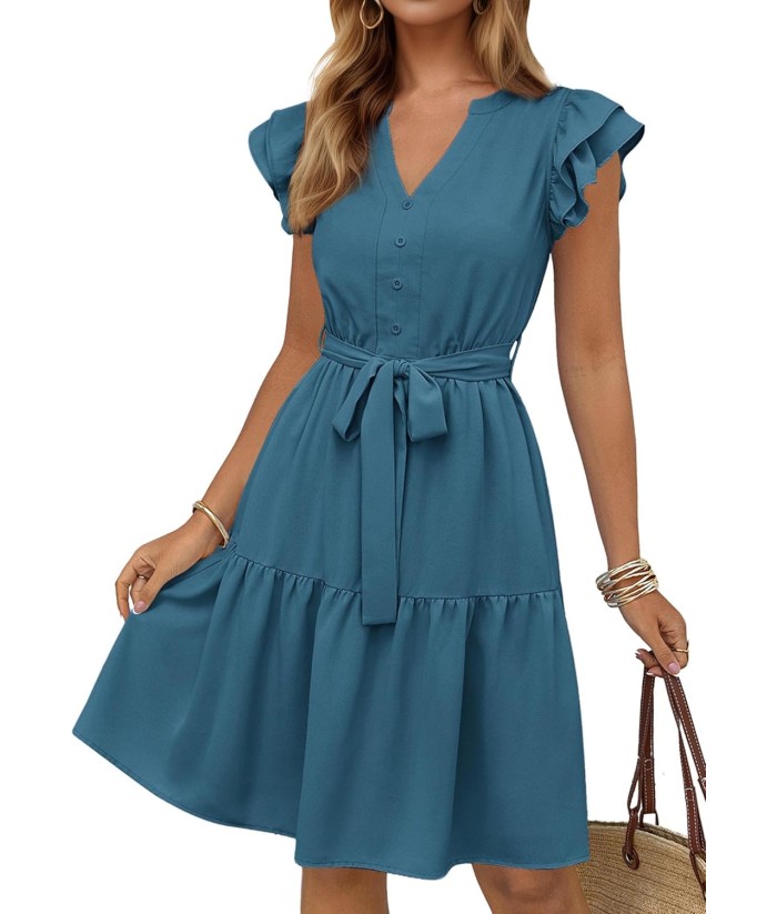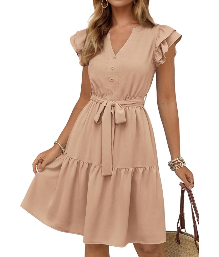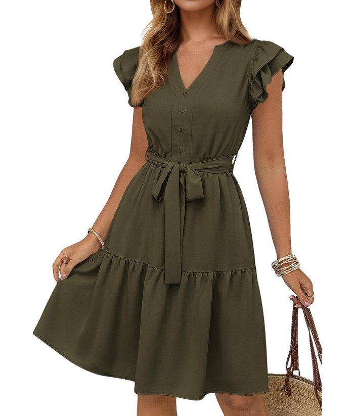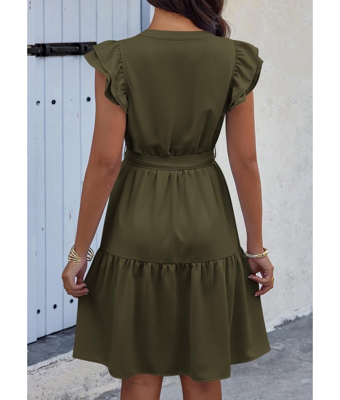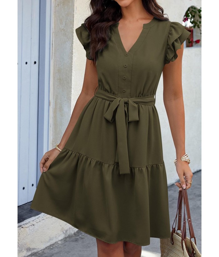 KIRUNDO Women Flutter Sleeve Summer Dress 2025 Spring V Neck Ruffle Flowy Tiered Knee Length Belted Beach Vacation Sundress