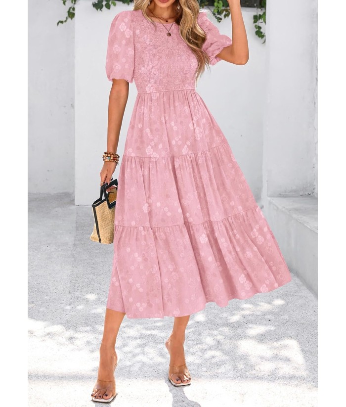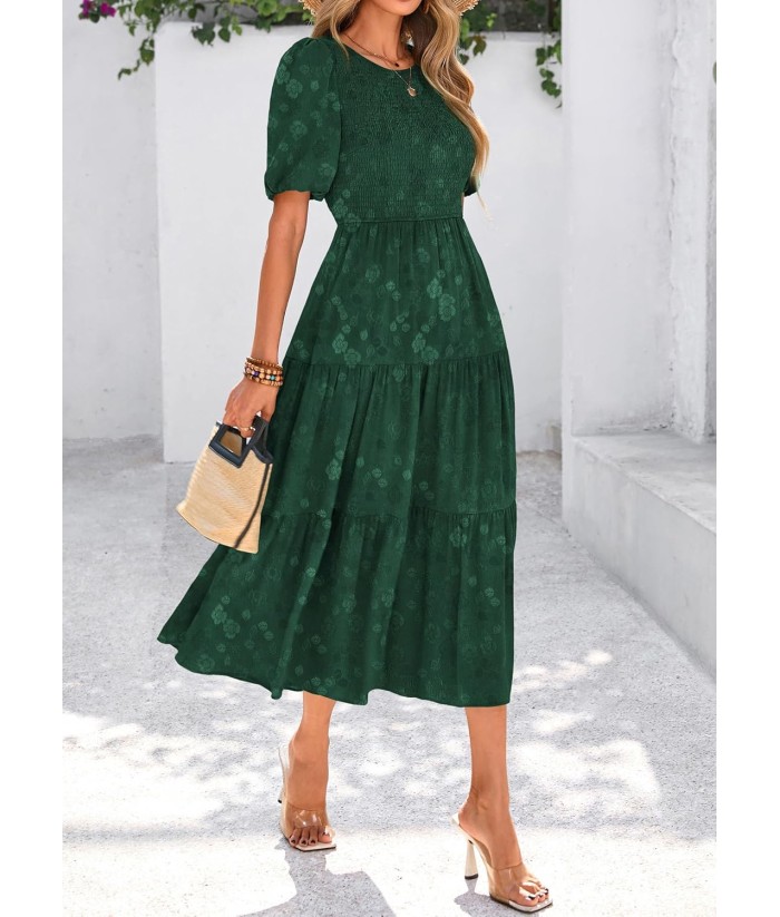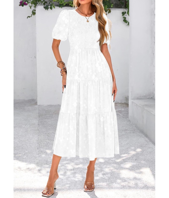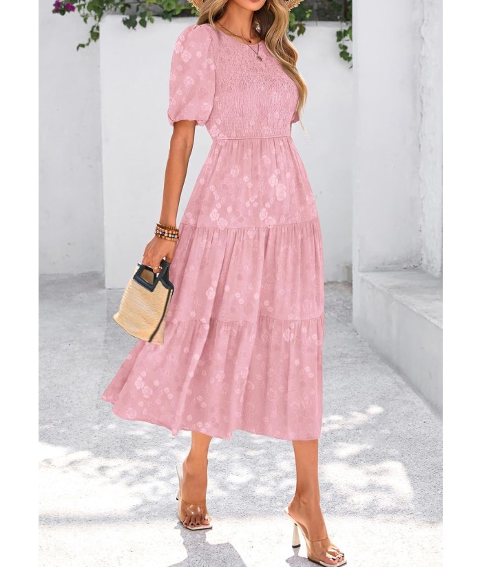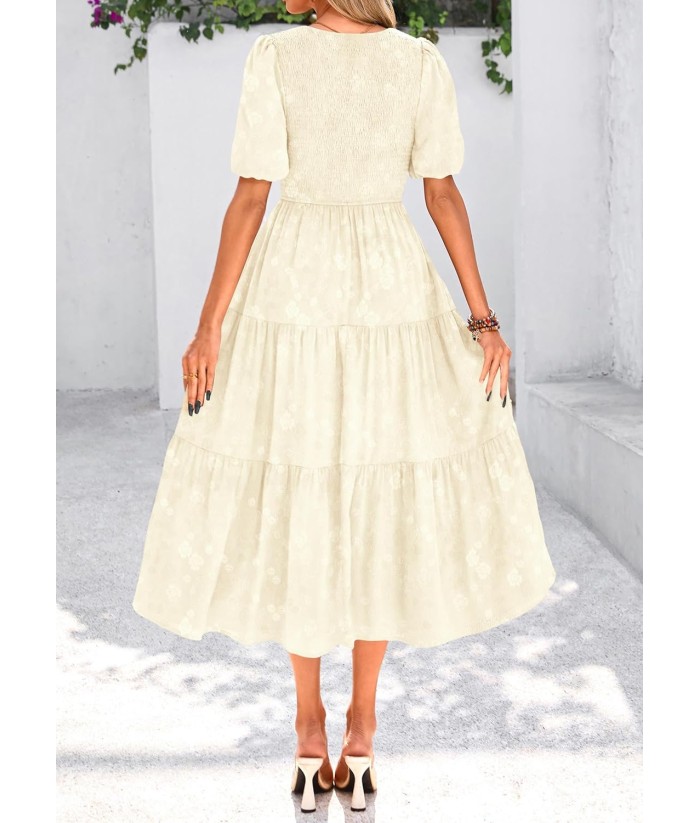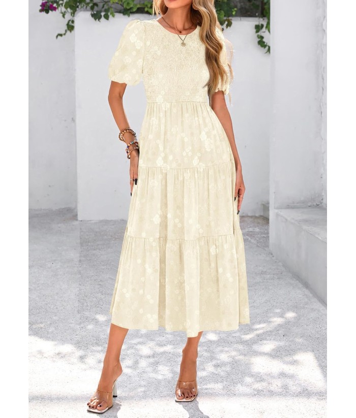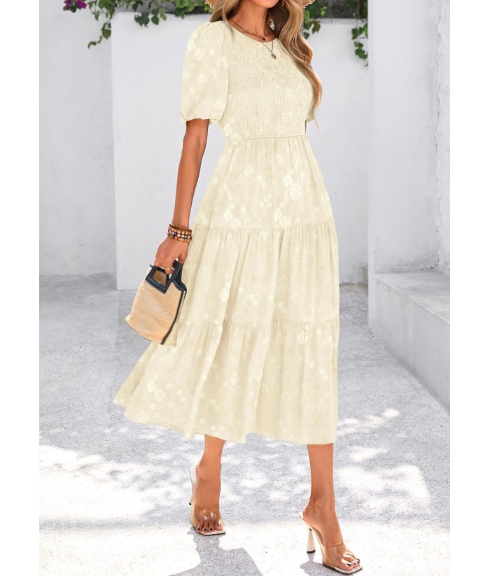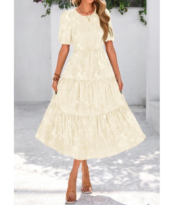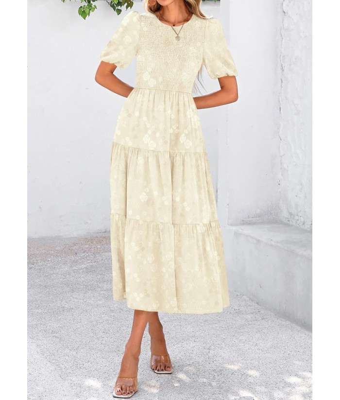 KIRUNDO Womens Summer Dresses Wedding Guest Floral Midi Sundress Short Puff Sleeve Flowy A Line Smocked Tiered Boho Dress
