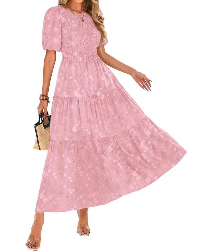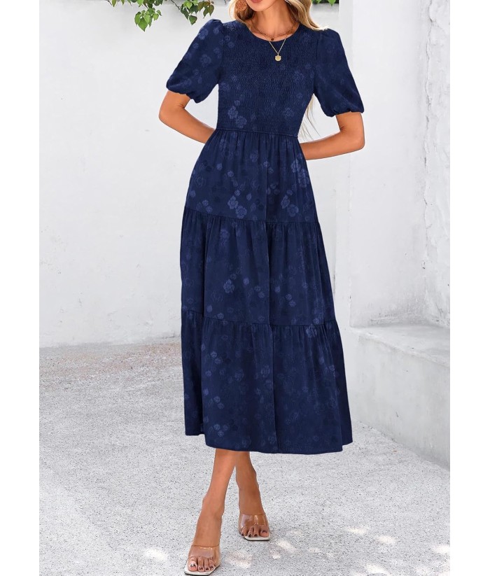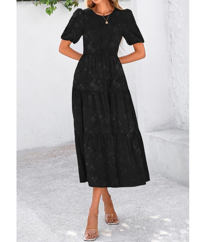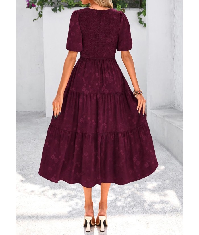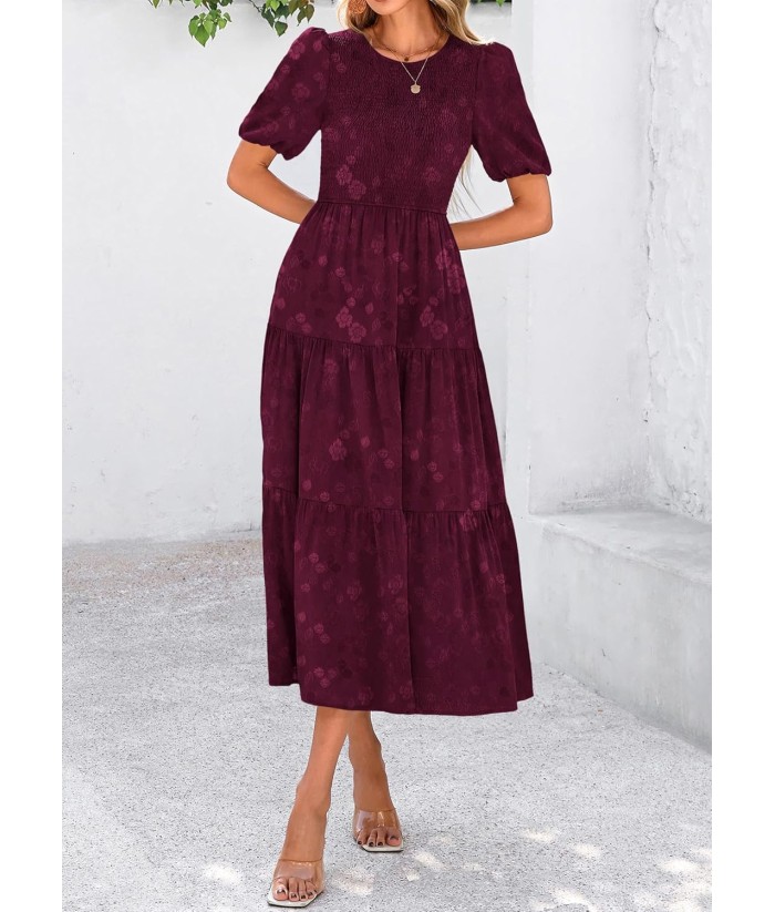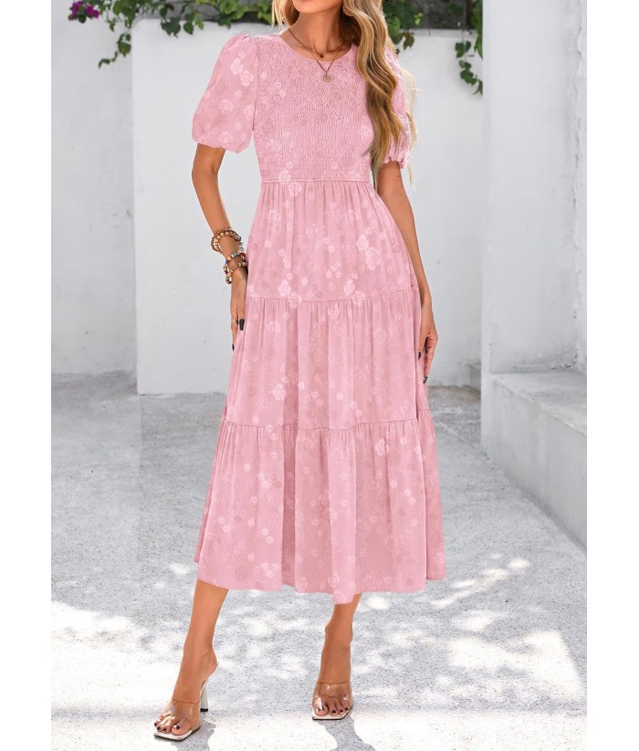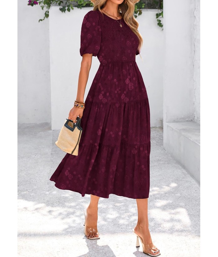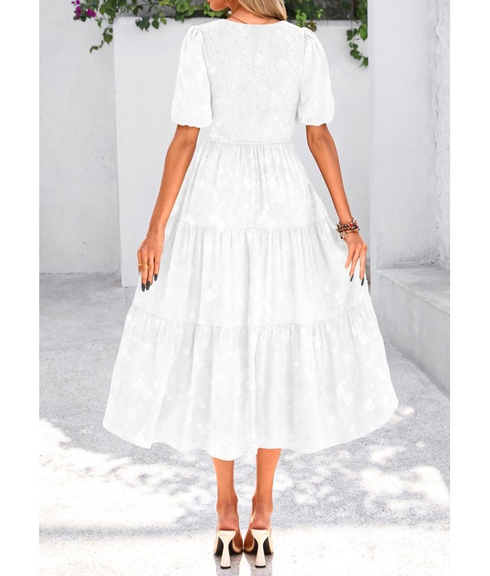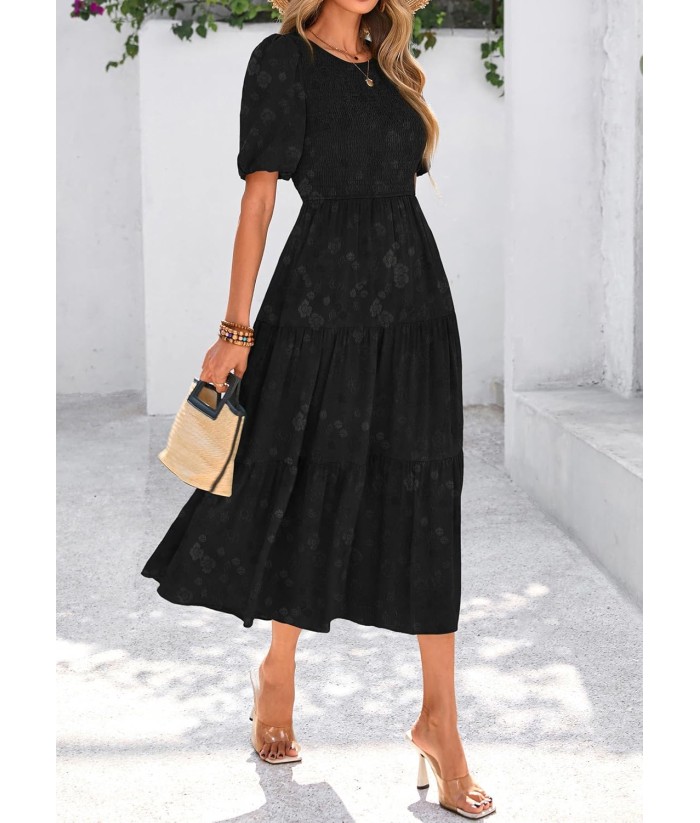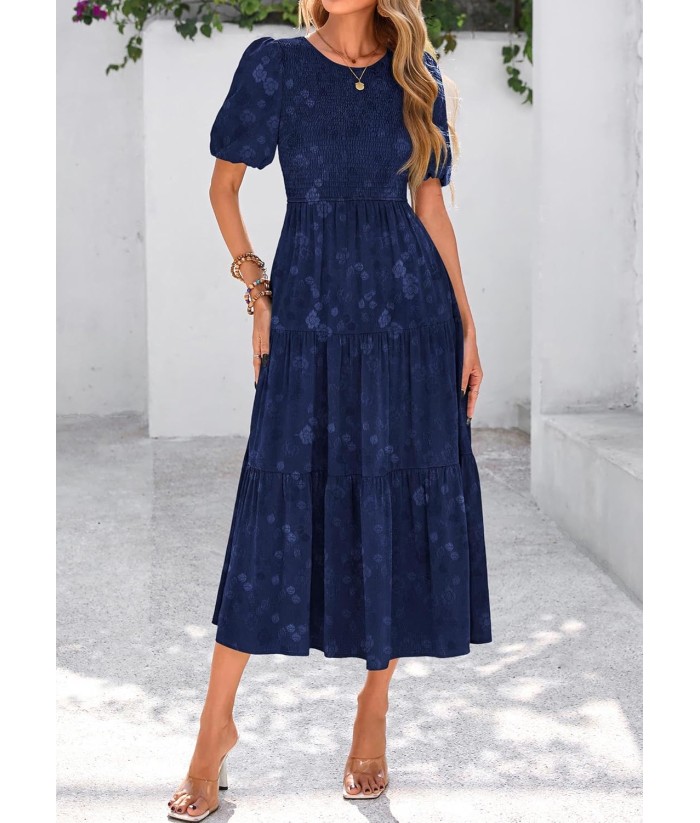 KIRUNDO Womens Summer Dresses Wedding Guest Floral Midi Sundress Short Puff Sleeve Flowy A Line Smocked Tiered Boho Dress
