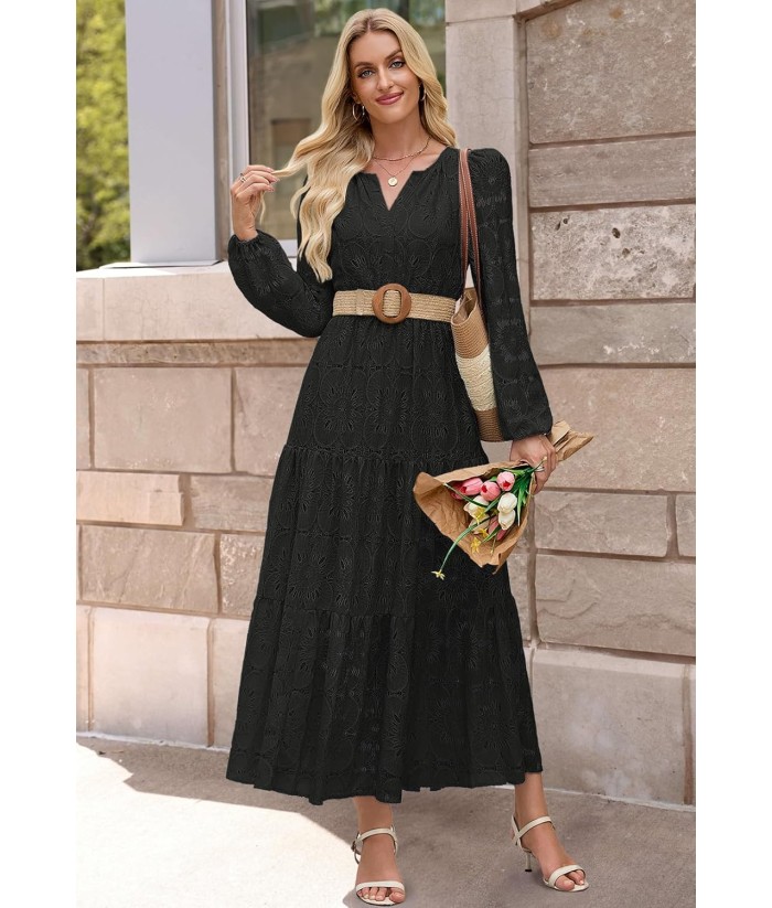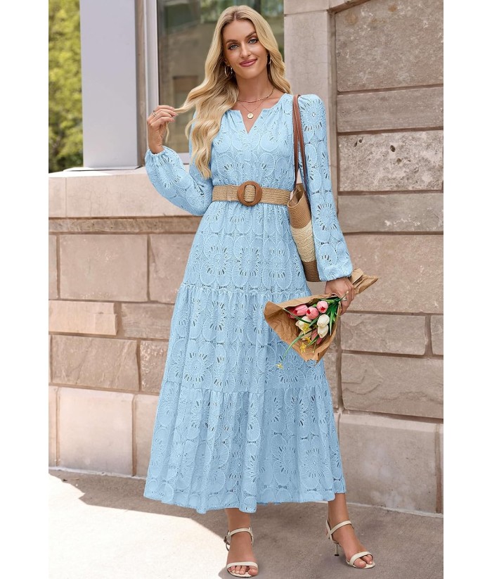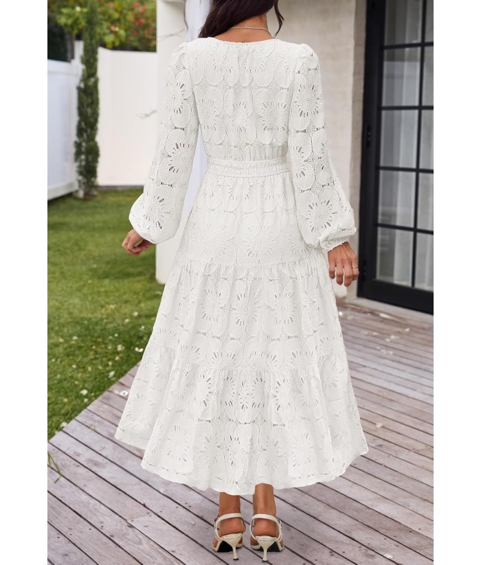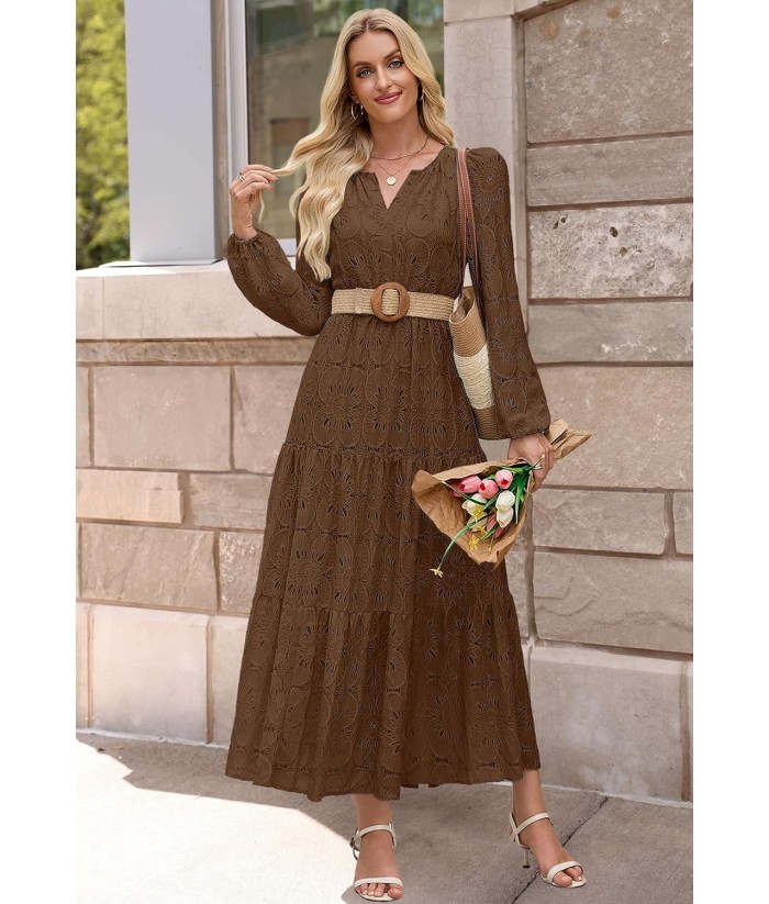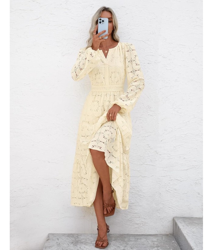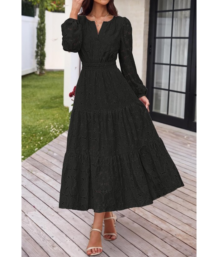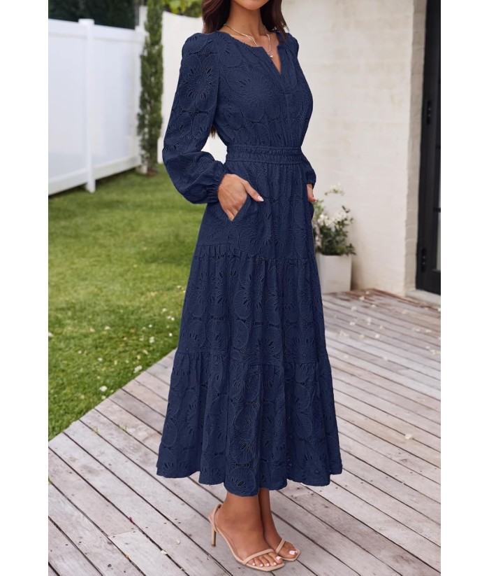 MEROKEETY Women's Fall Long Sleeve Floral Maxi Dress V Neck Lace Eyelet Hollow Out Tiered Dresses Pockets