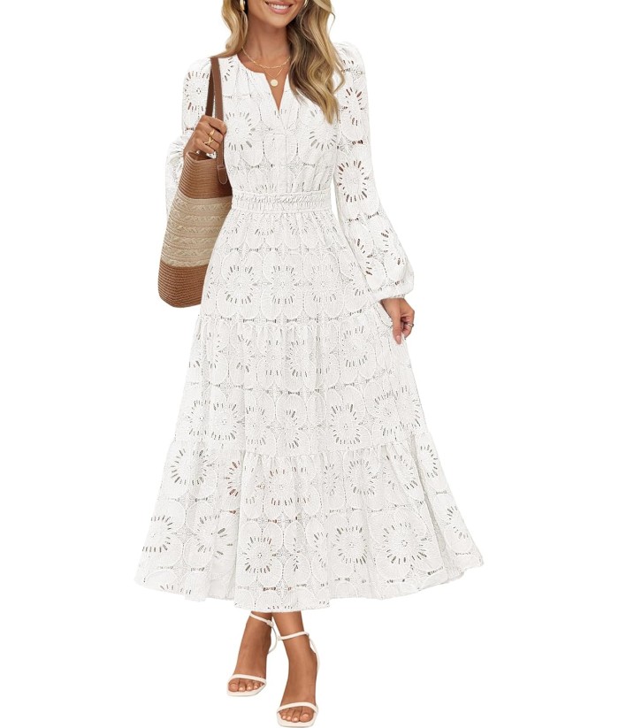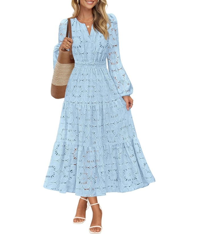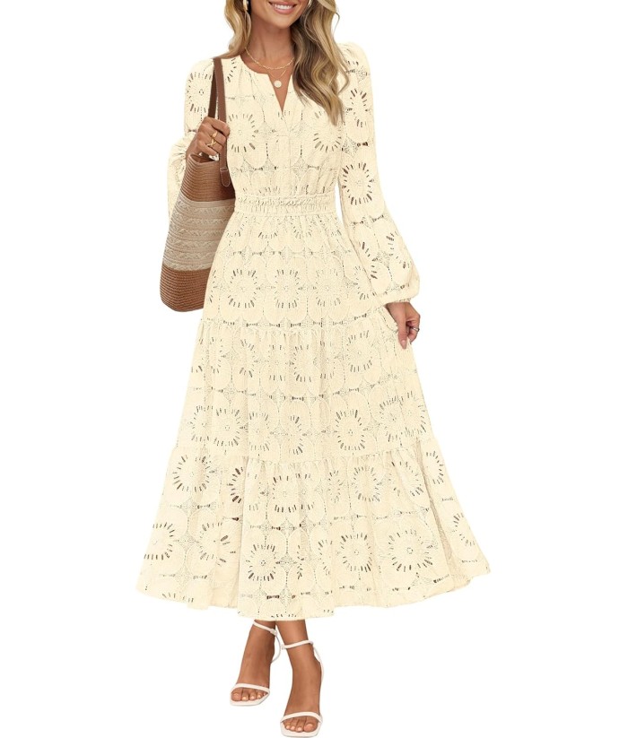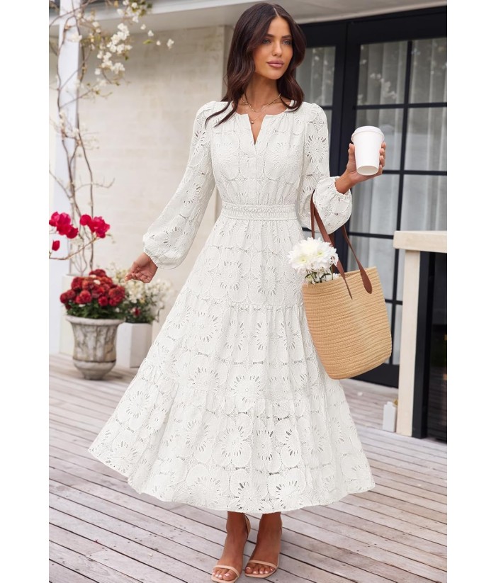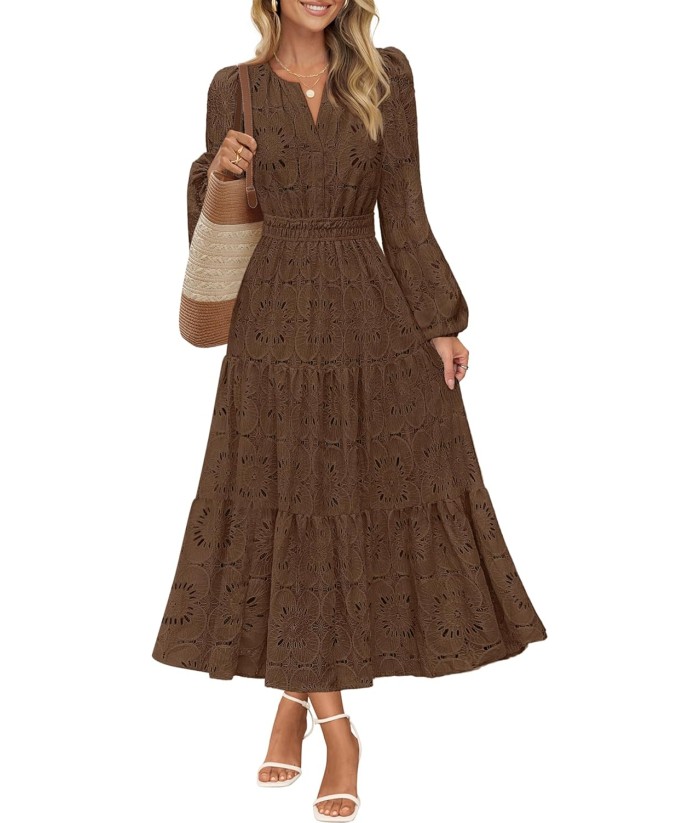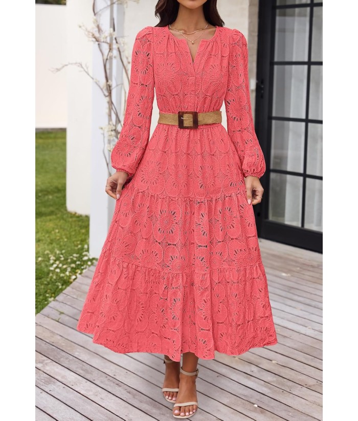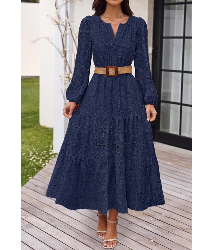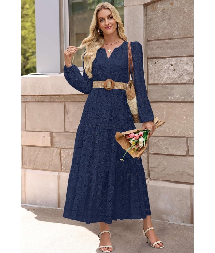 MEROKEETY Women's Fall Long Sleeve Floral Maxi Dress V Neck Lace Eyelet Hollow Out Tiered Dresses Pockets