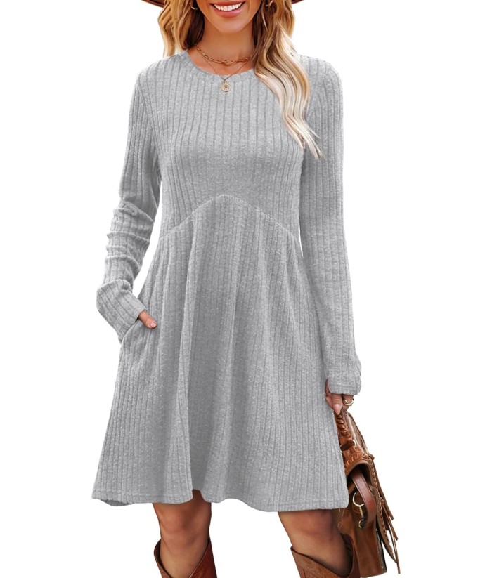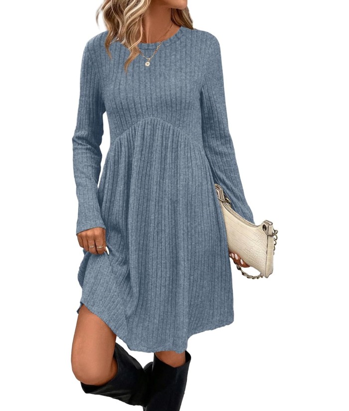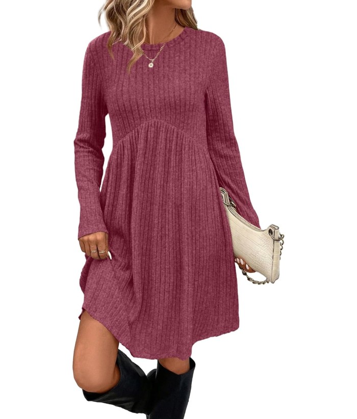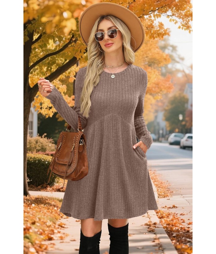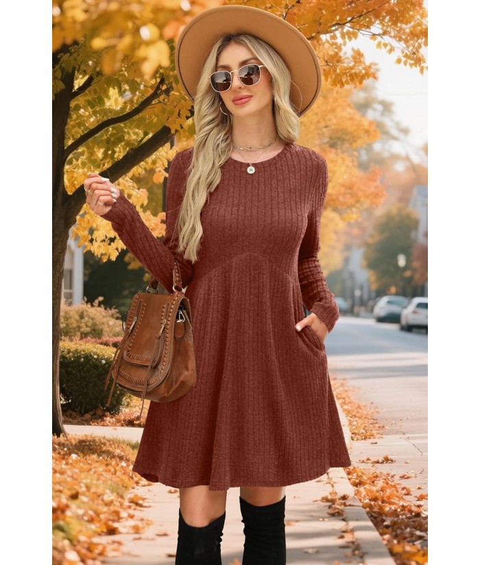 OFEEFAN Long Sleeve Dress for Women Crew Neck Empire Waist Tunic Dress with Pockets