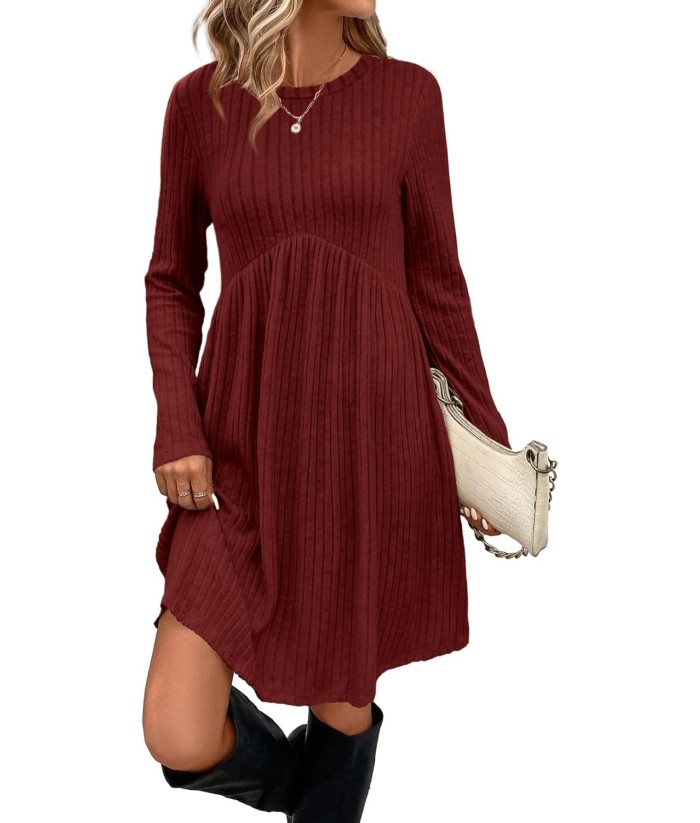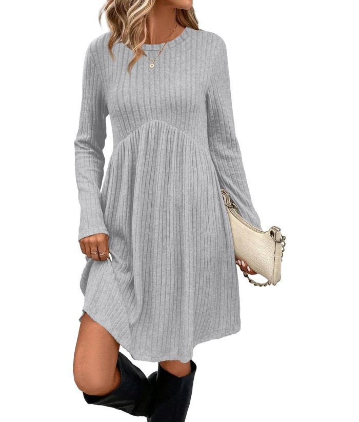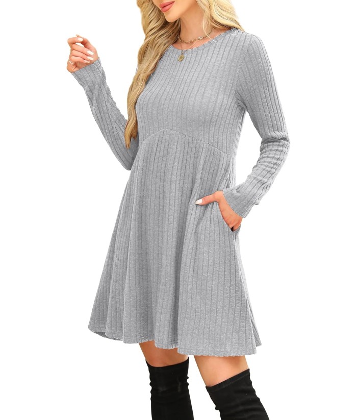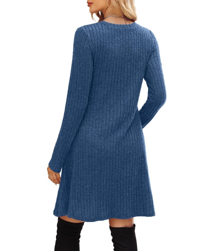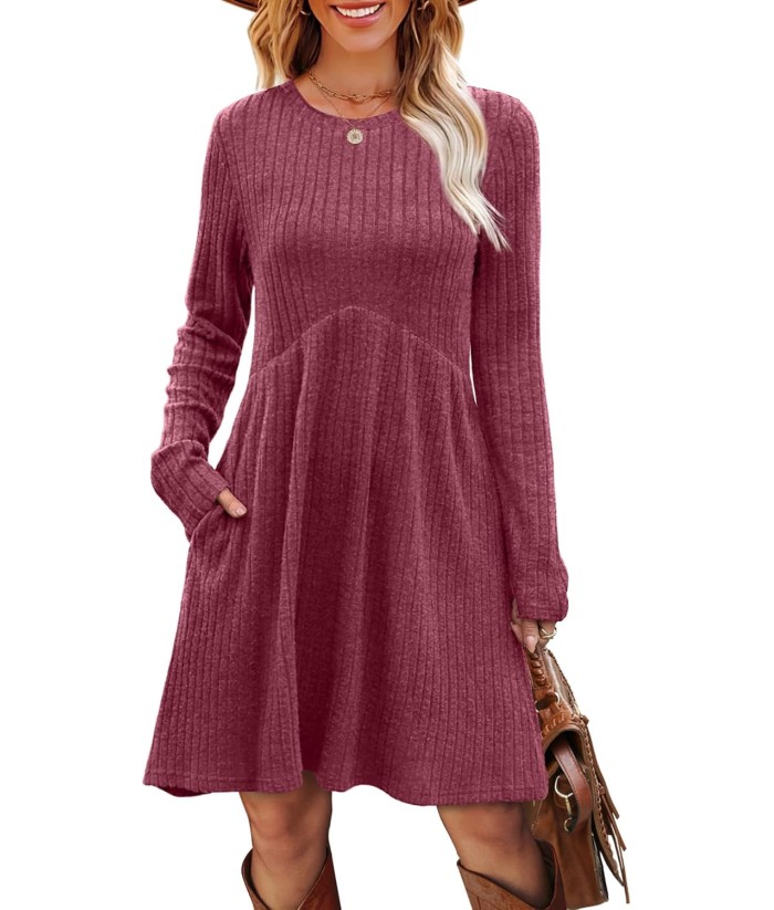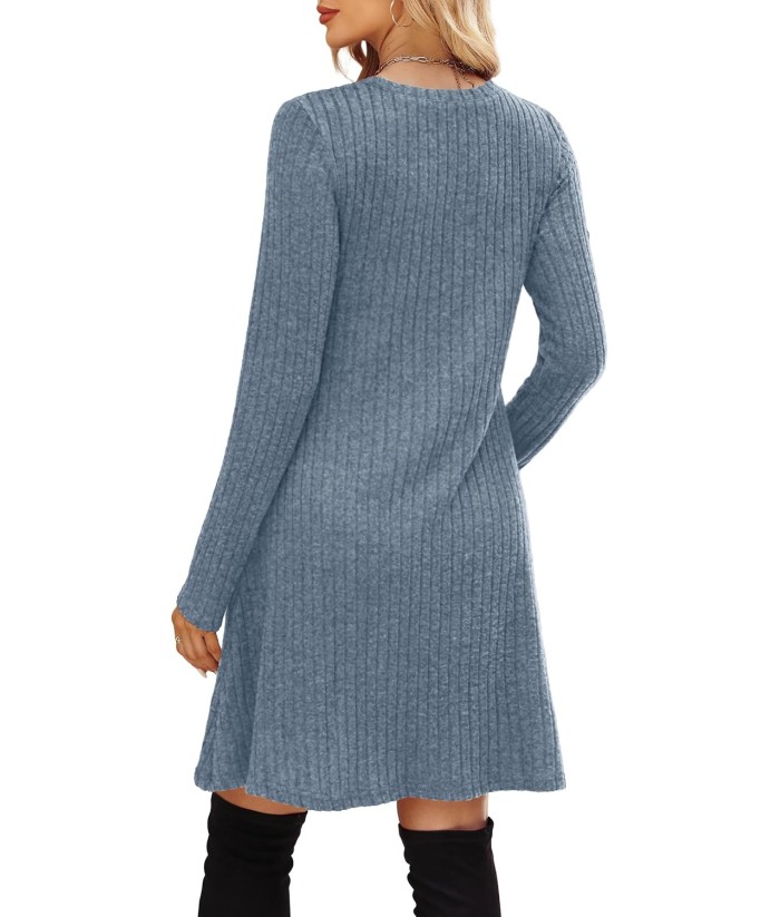 OFEEFAN Long Sleeve Dress for Women Crew Neck Empire Waist Tunic Dress with Pockets