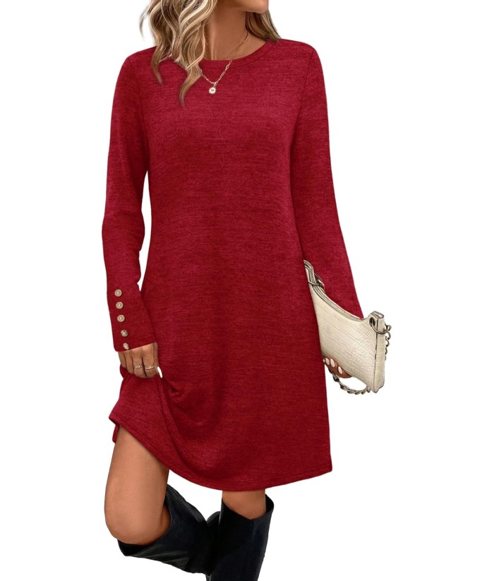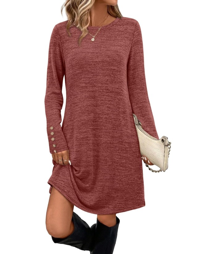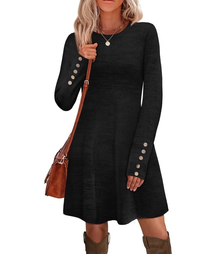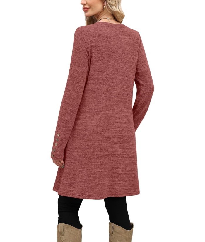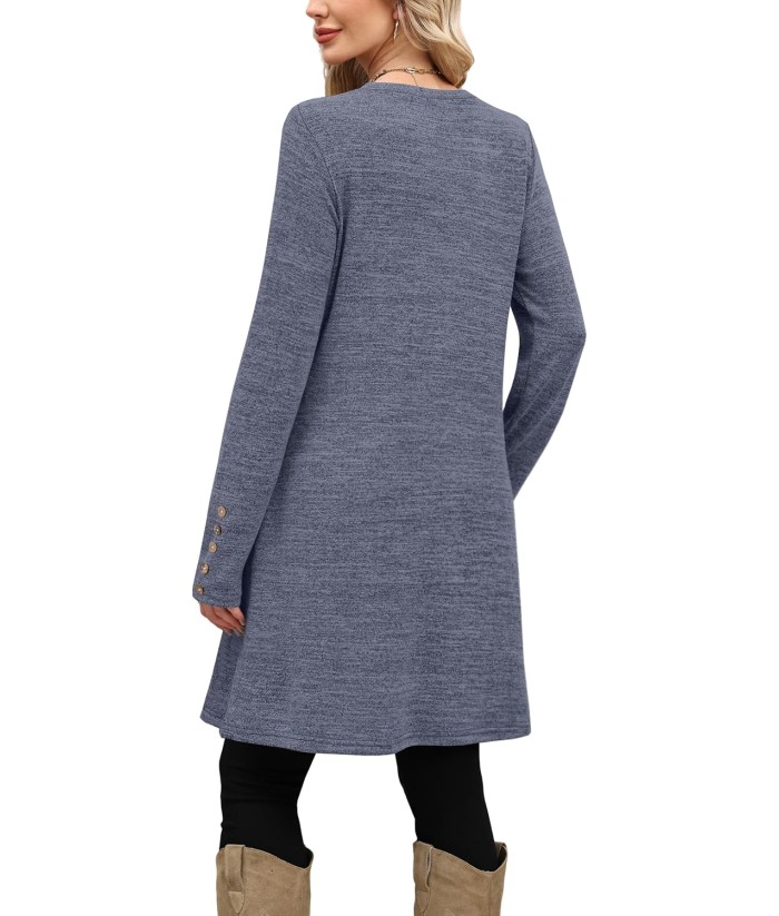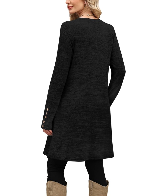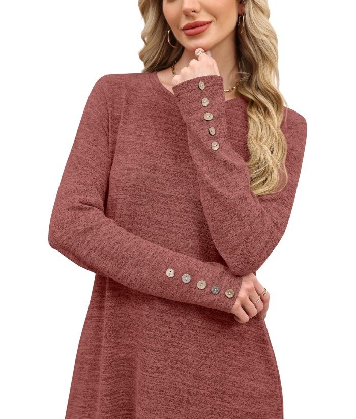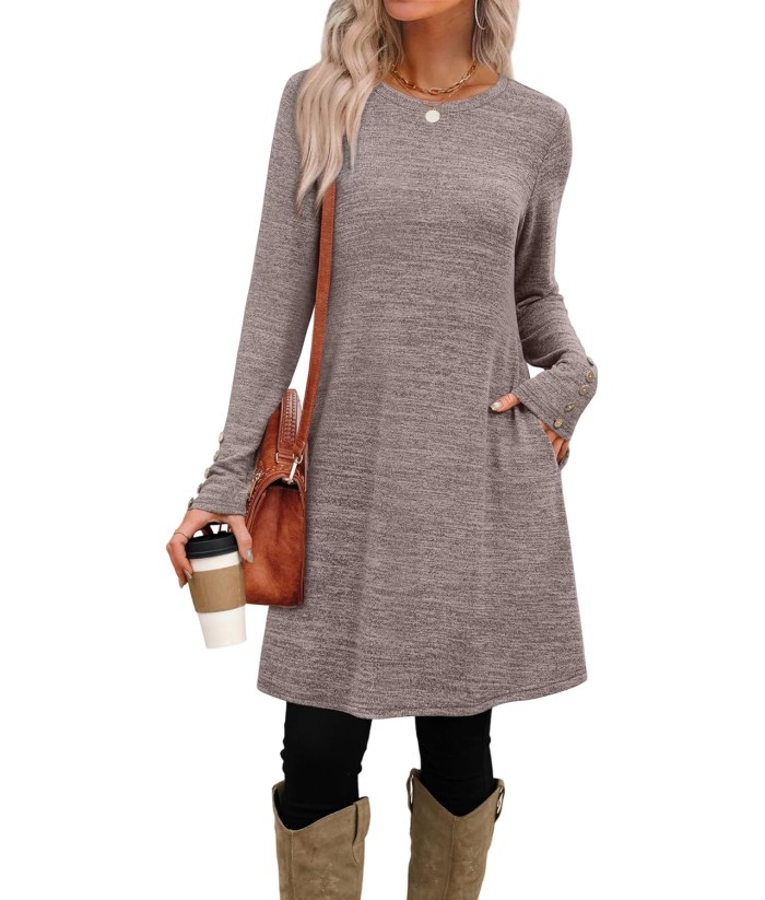 OFEEFAN Long Sleeve Dress for Women Crew Neck Tunic Dress with Pockets Decorative Buttons