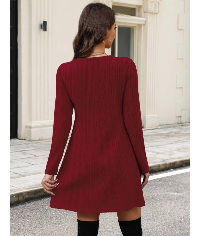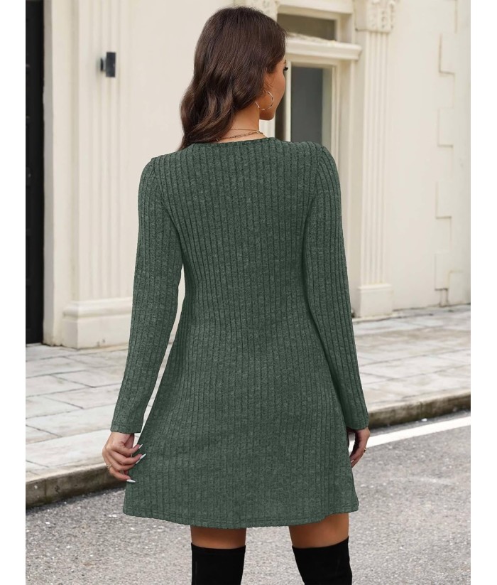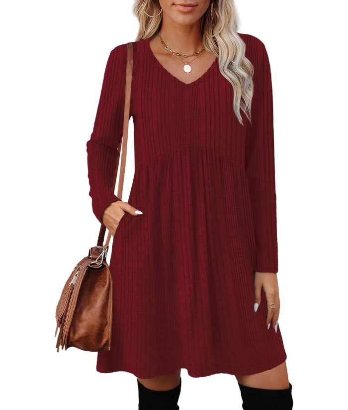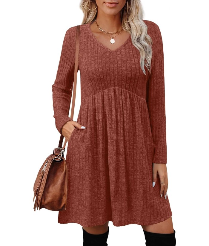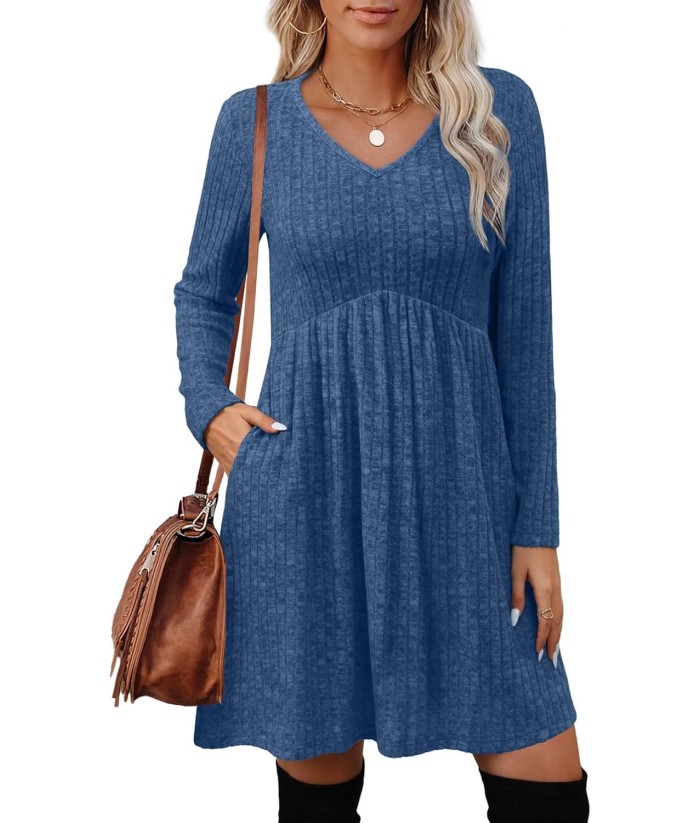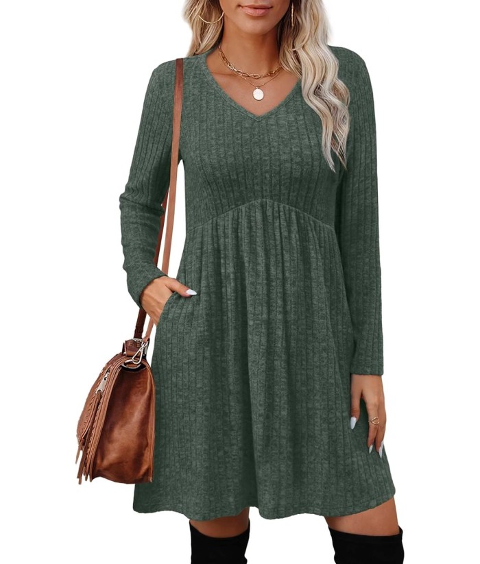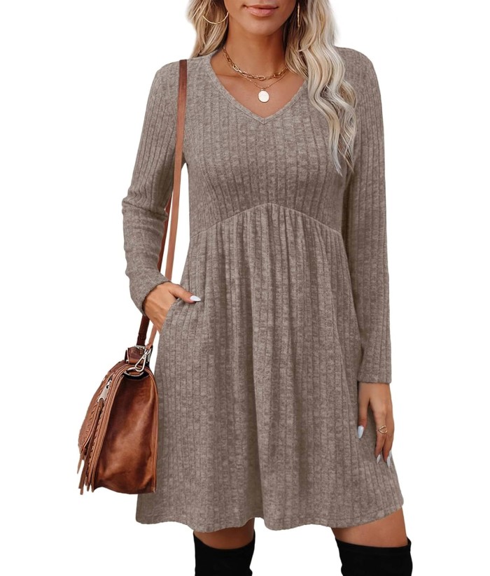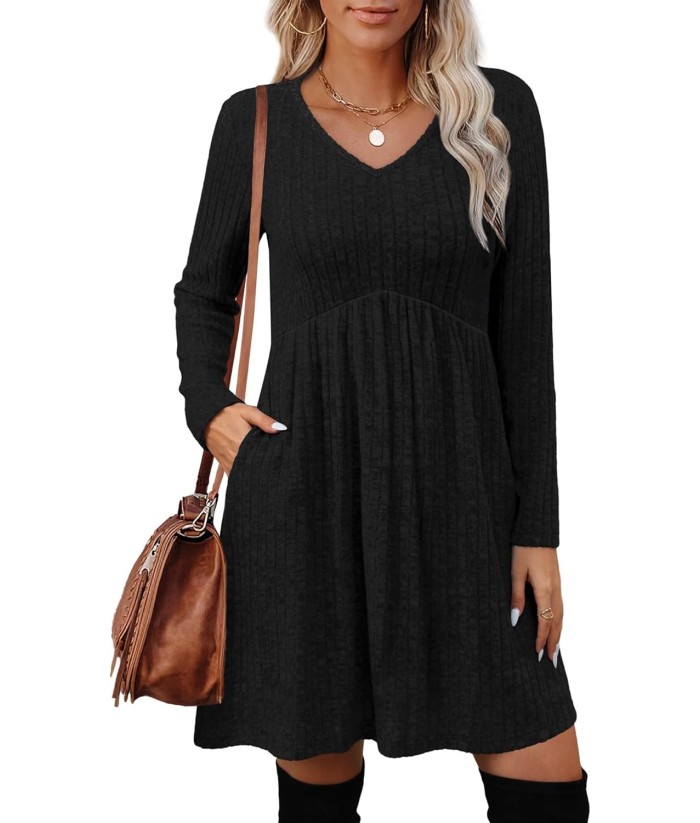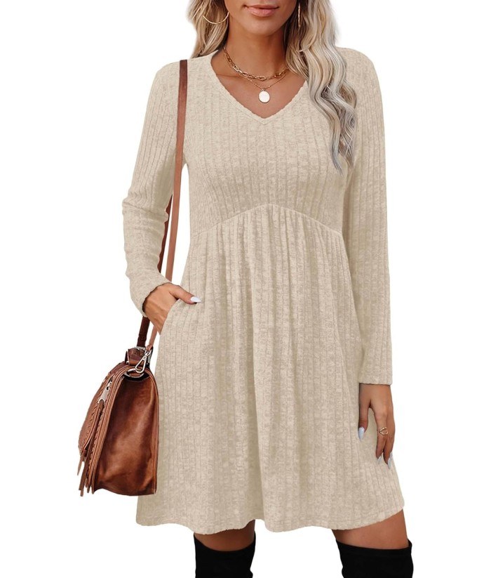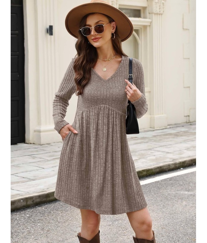 OFEEFAN Long Sleeve Sweater Dress Fall Dresses 2025 V Neck Empire Waist Baby Doll Dresses Women Casual Dress with Pockets