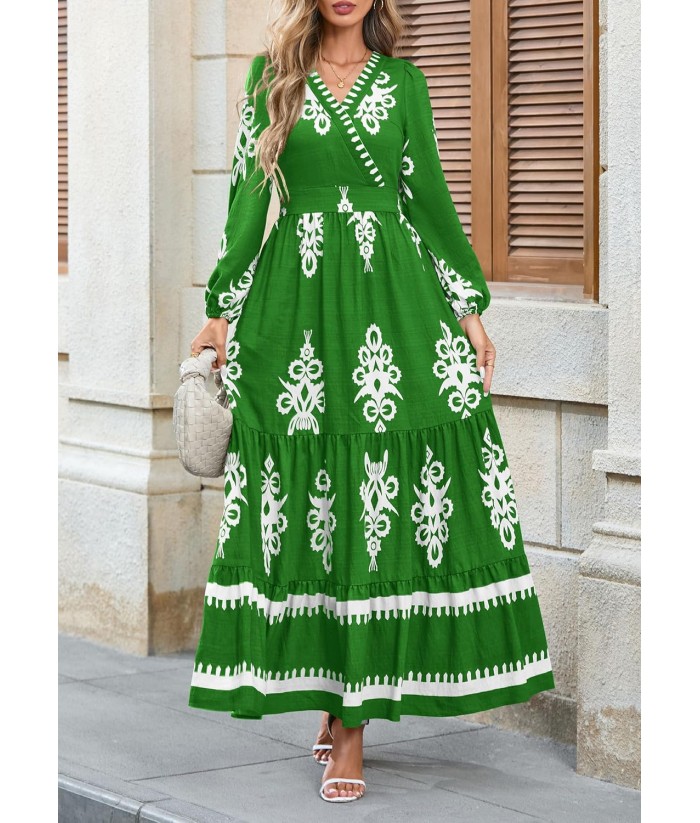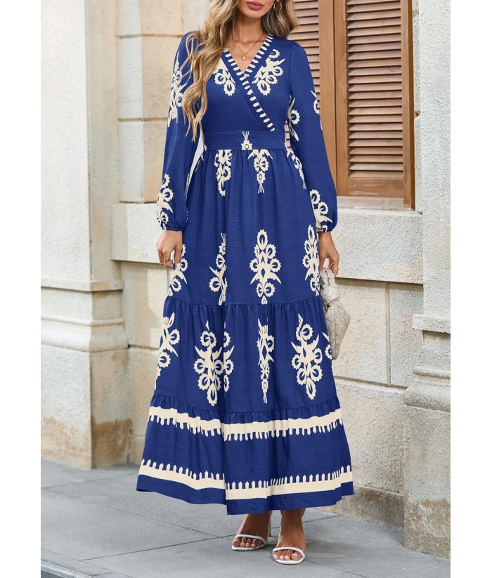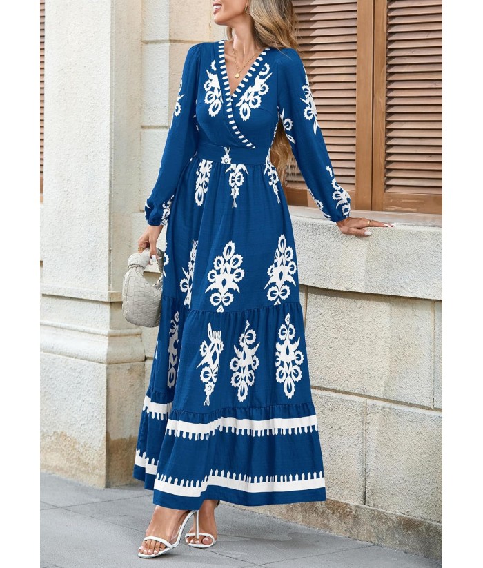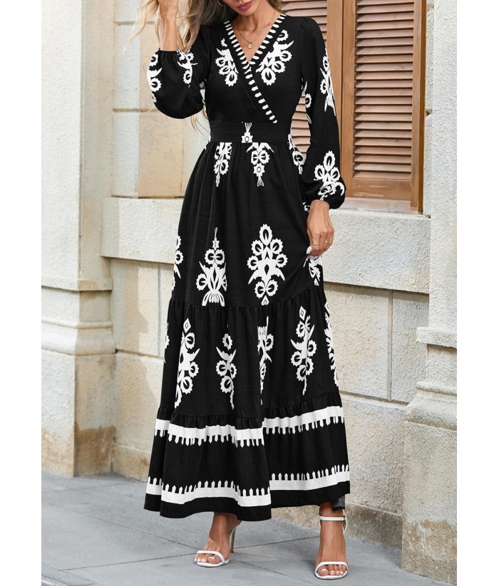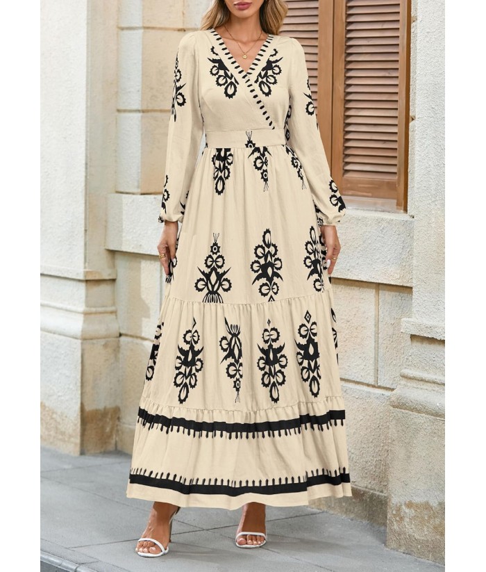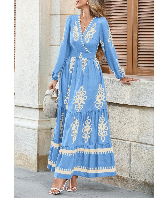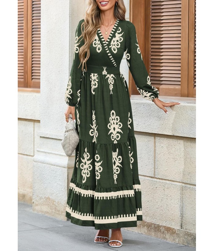 PRETTYGARDEN Women's 2025 Fall Wedding Guest Dresses Boho Floral Long Sleeve V Neck Flowy Elegant Maxi Dress Beach Clothes