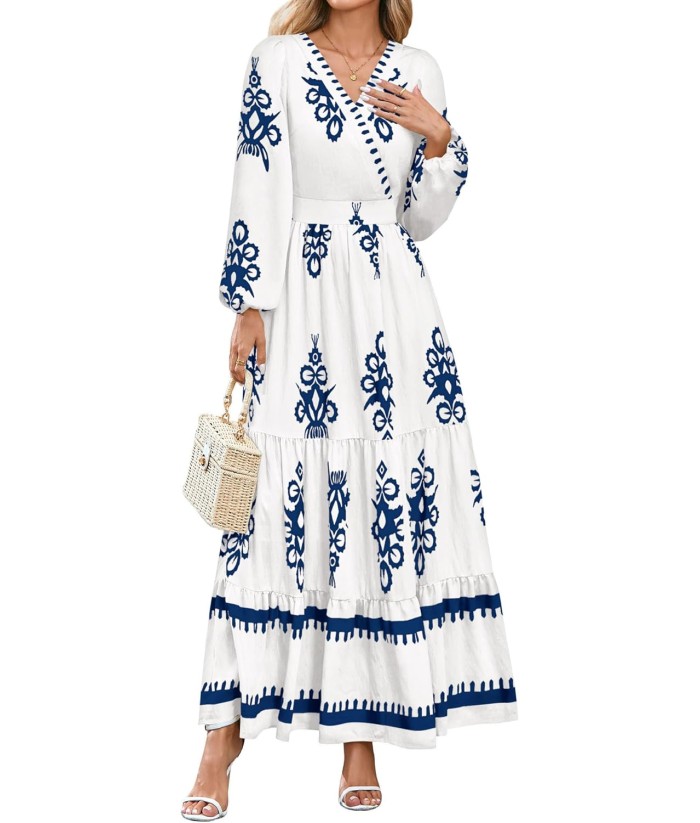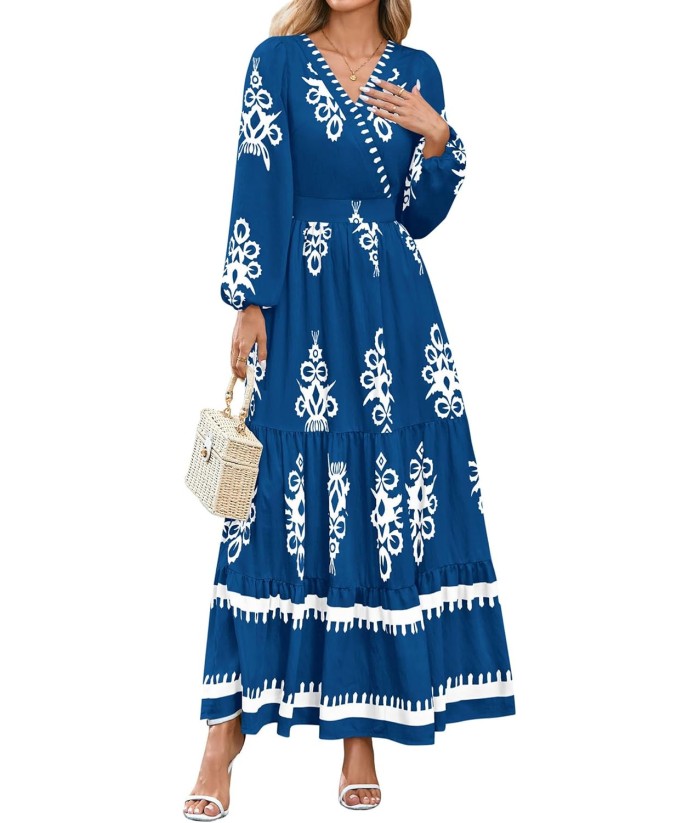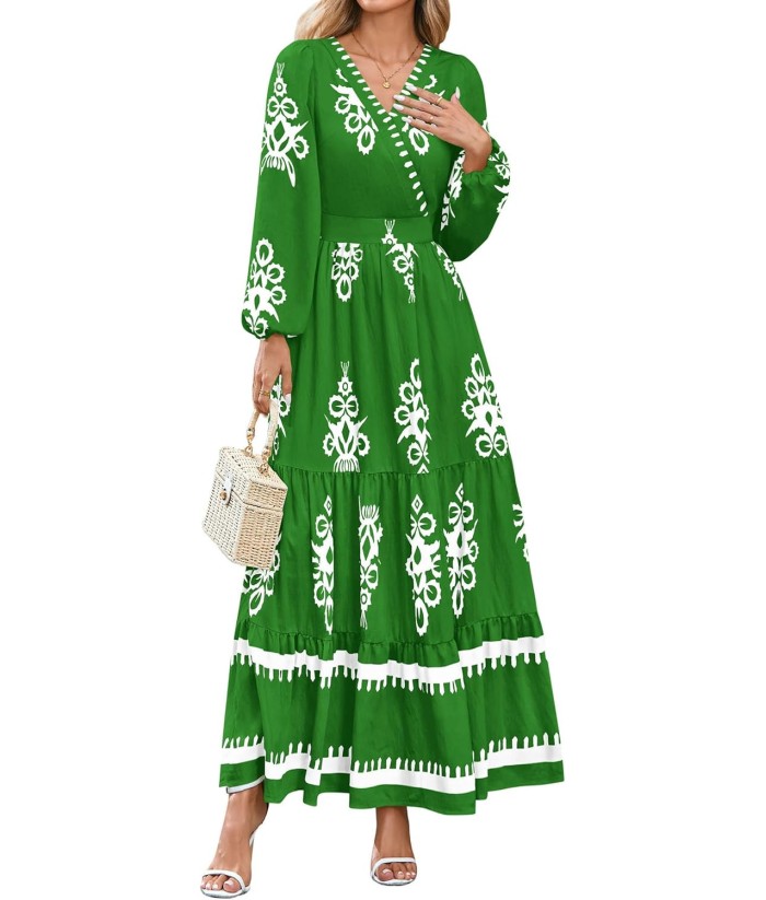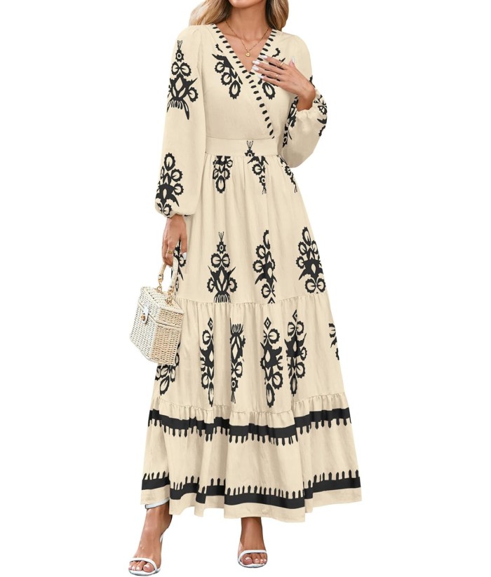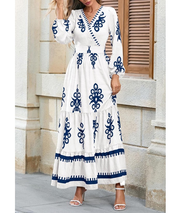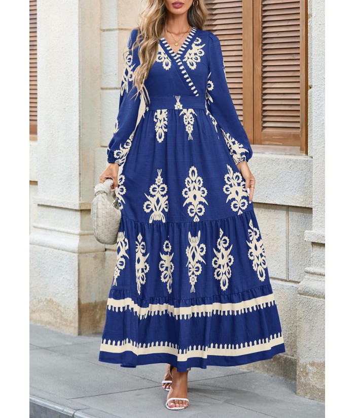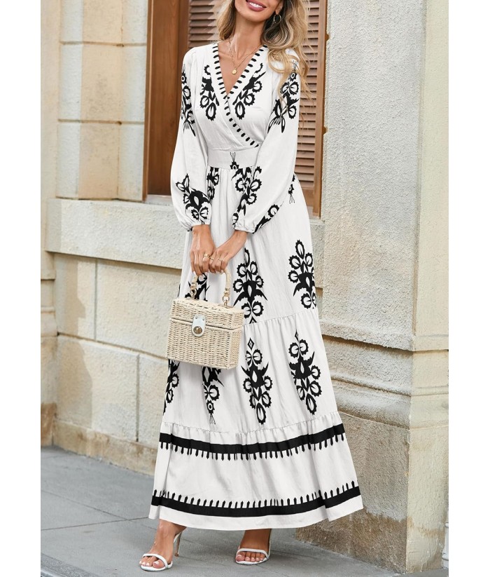 PRETTYGARDEN Women's 2025 Fall Wedding Guest Dresses Boho Floral Long Sleeve V Neck Flowy Elegant Maxi Dress Beach Clothes