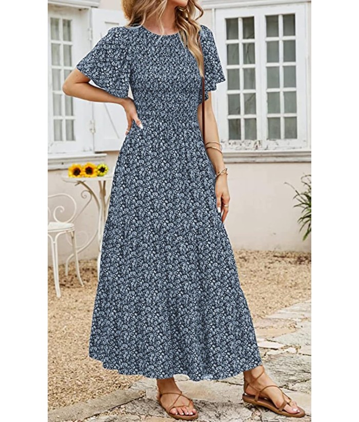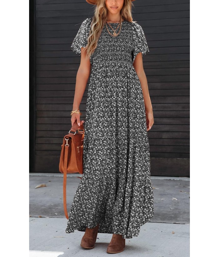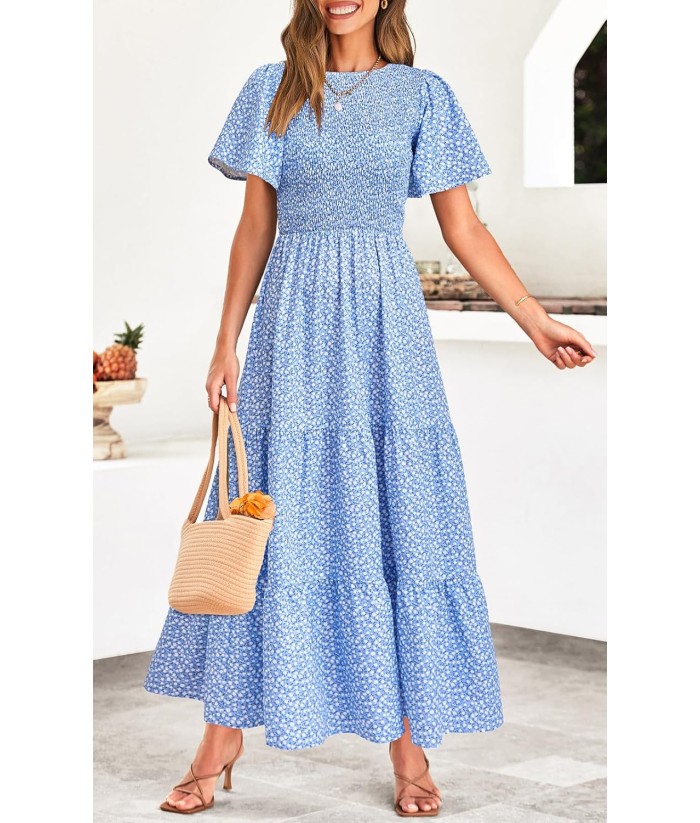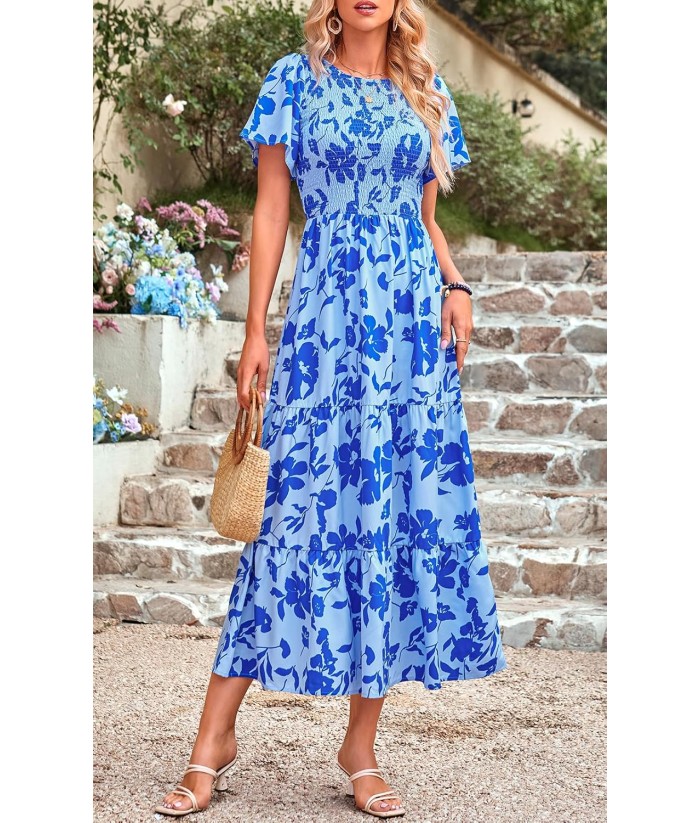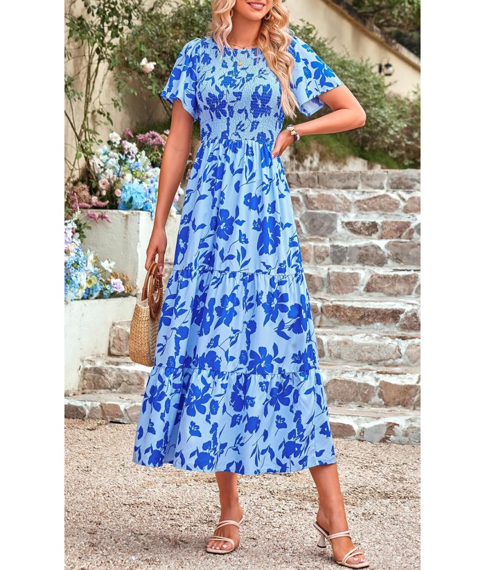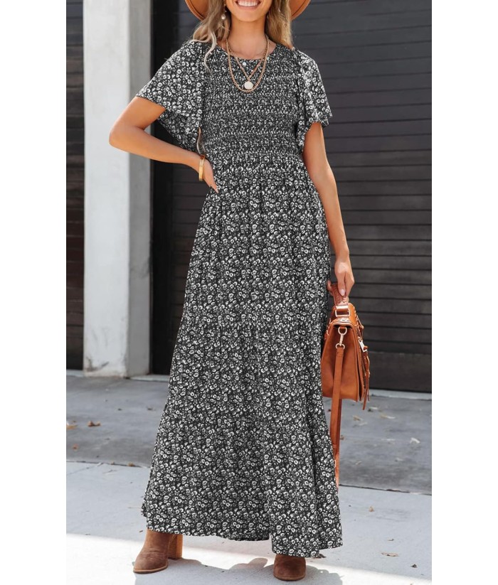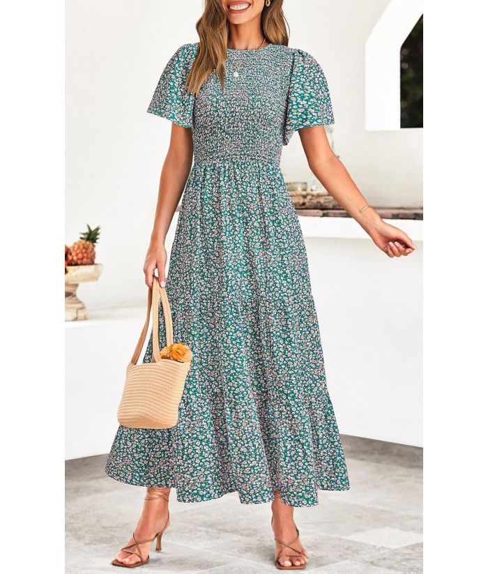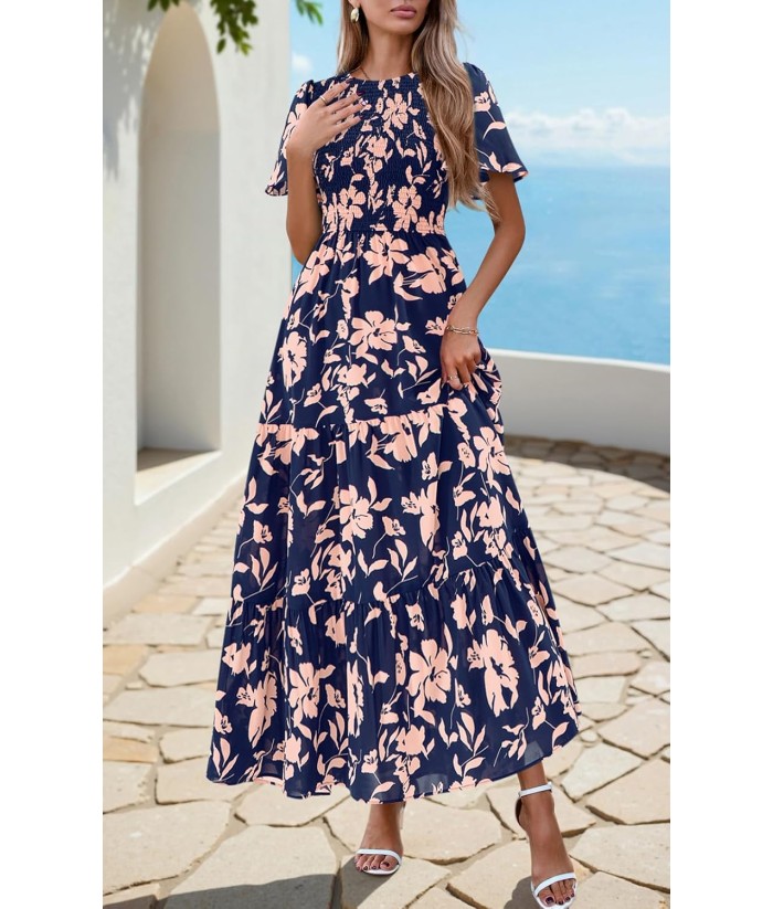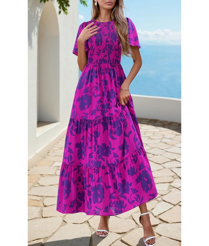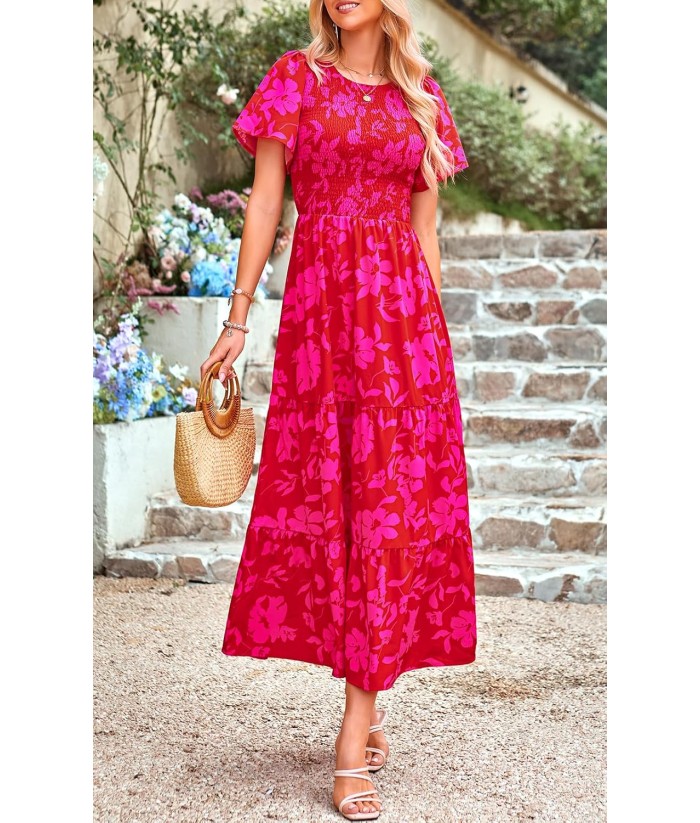 PRETTYGARDEN Women's 2025 Summer Casual Flutter Short Sleeve Boho Floral Maxi Dress Crew Neck Smocked Tiered Long Dresses