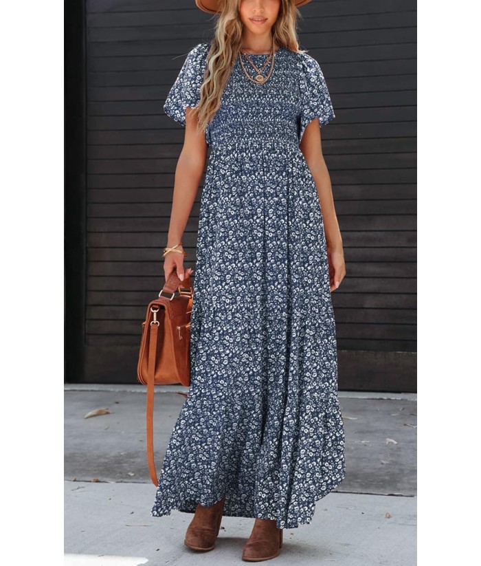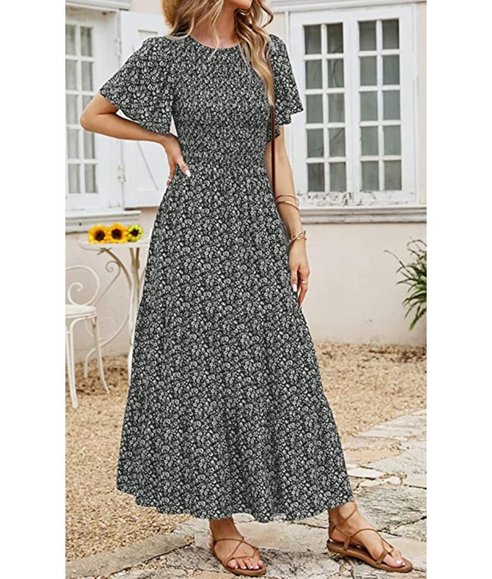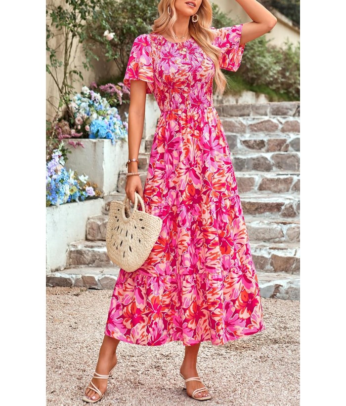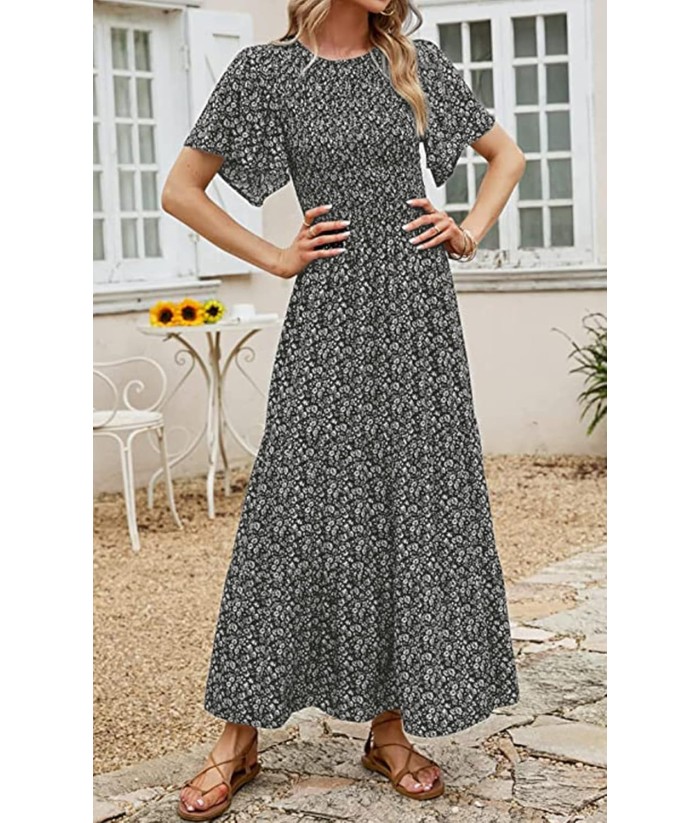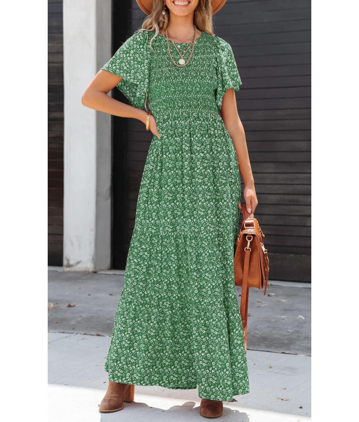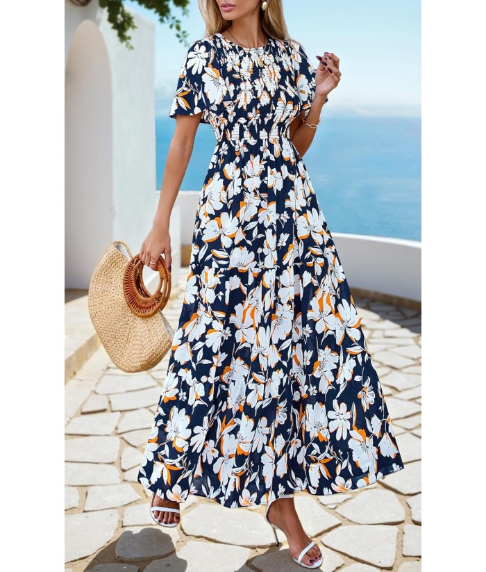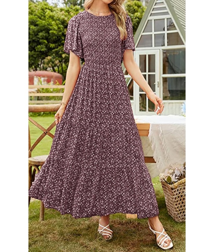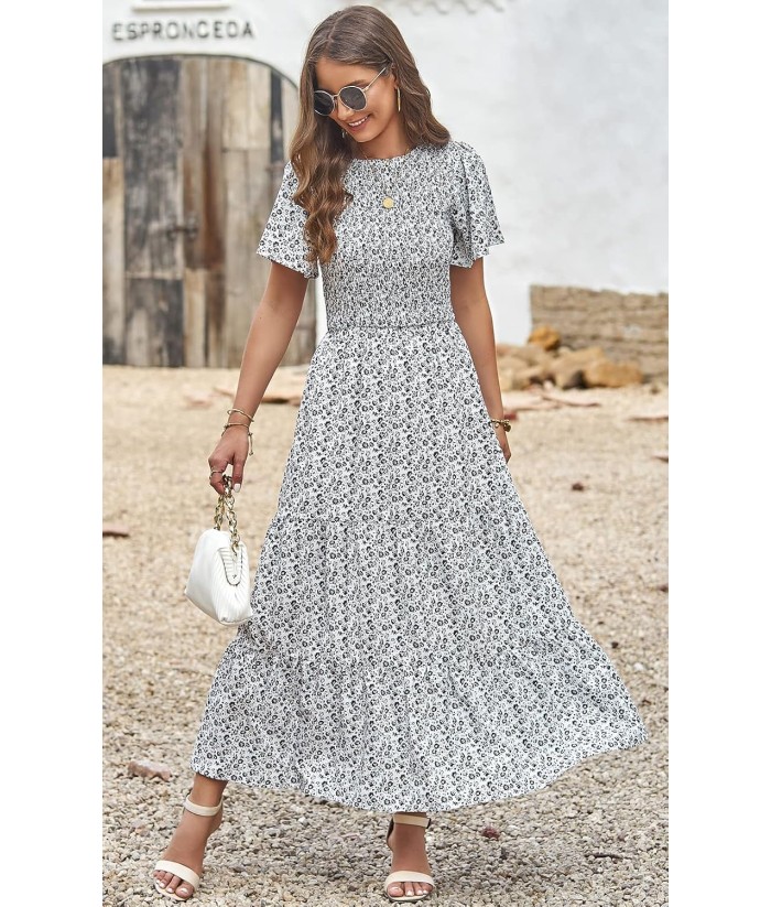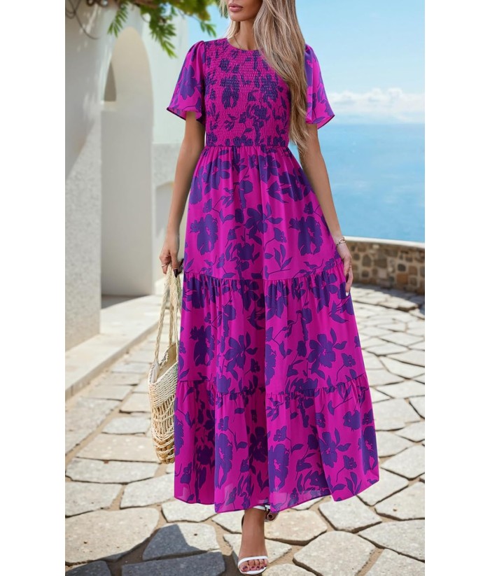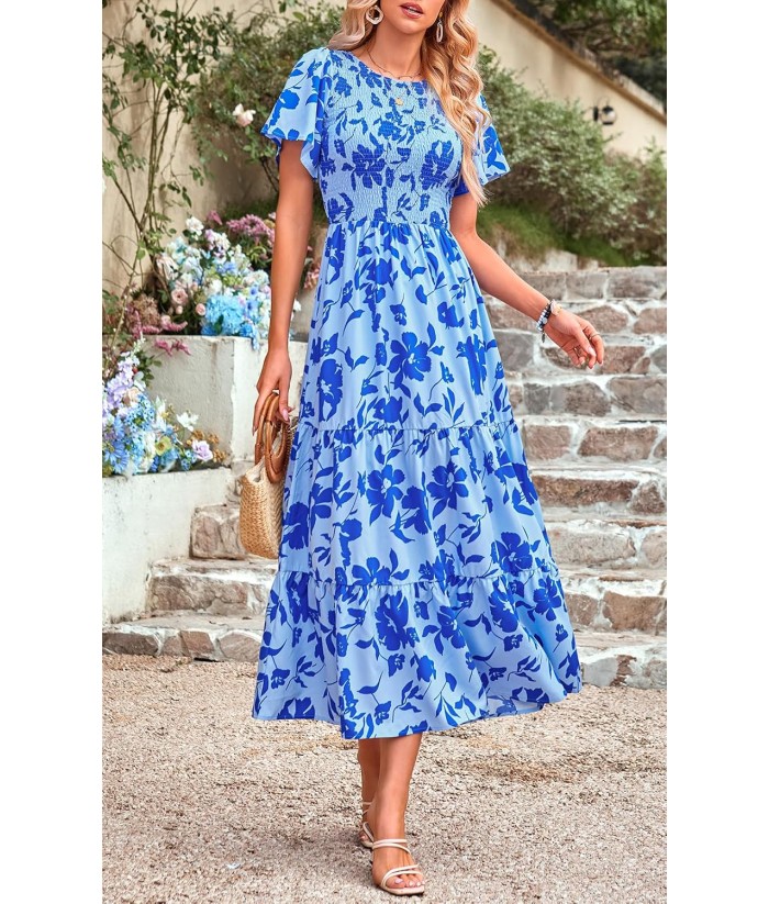 PRETTYGARDEN Women's 2025 Summer Casual Flutter Short Sleeve Boho Floral Maxi Dress Crew Neck Smocked Tiered Long Dresses