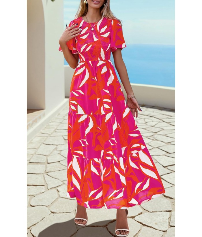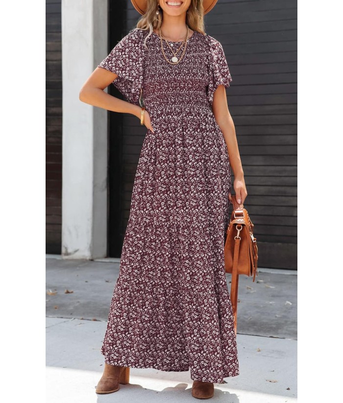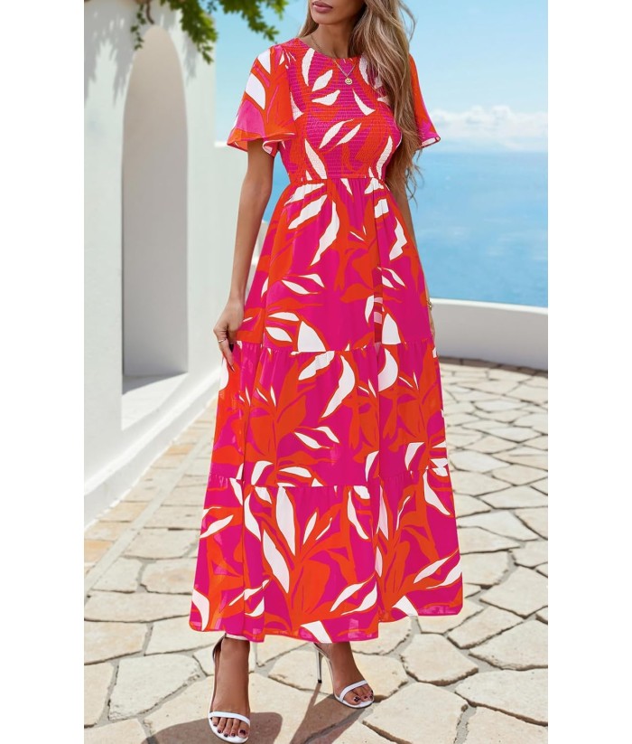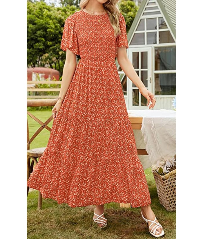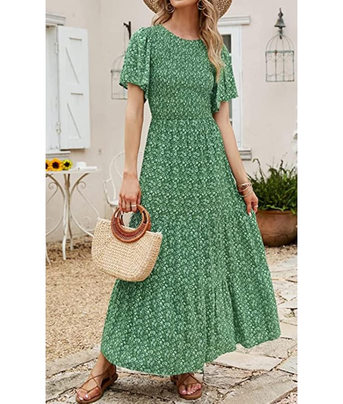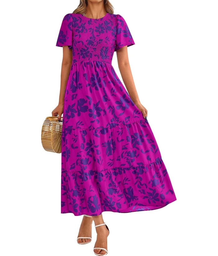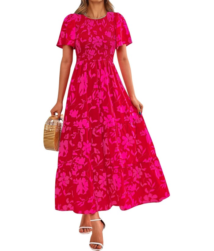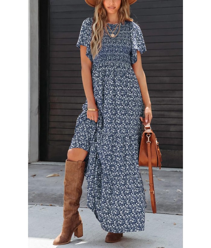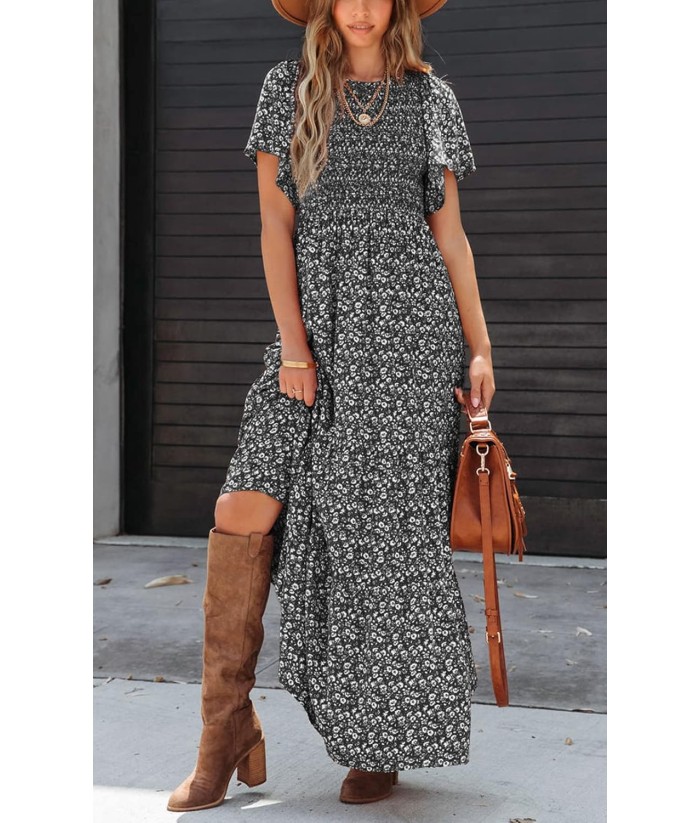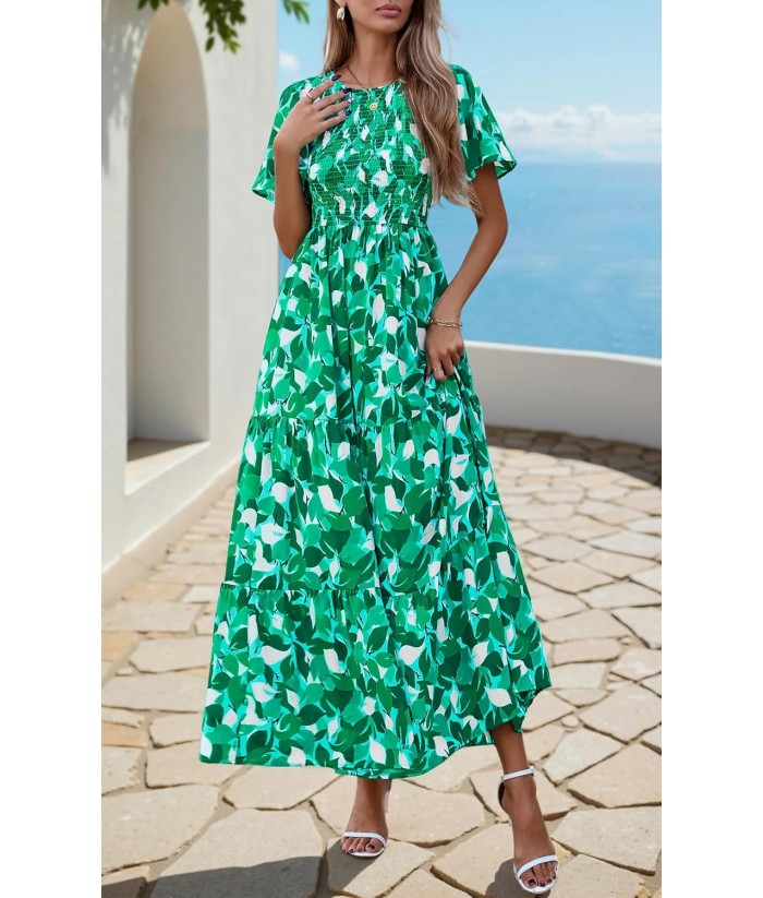 PRETTYGARDEN Women's 2025 Summer Casual Flutter Short Sleeve Boho Floral Maxi Dress Crew Neck Smocked Tiered Long Dresses