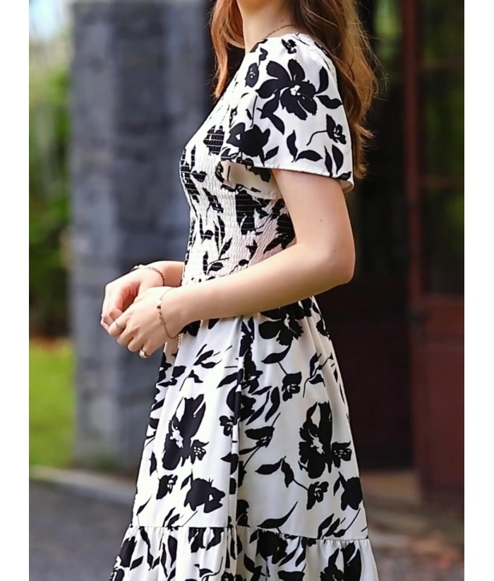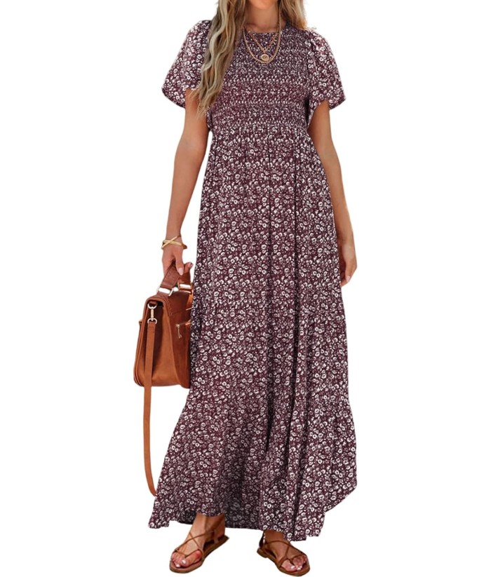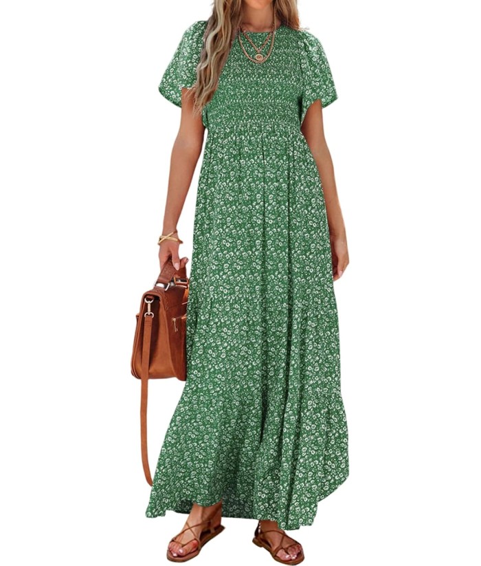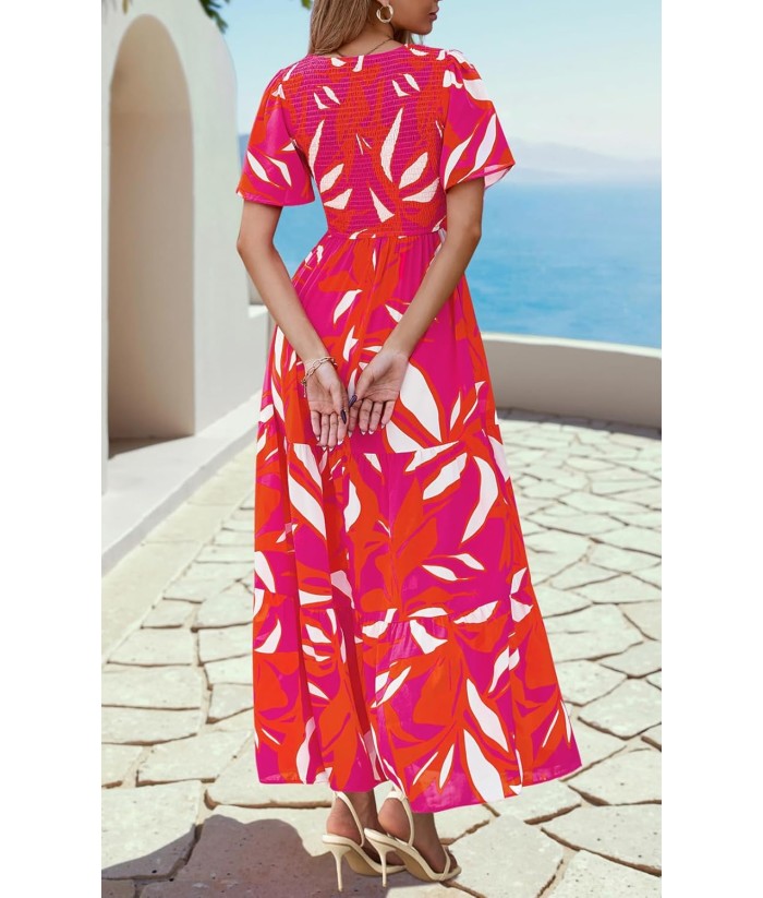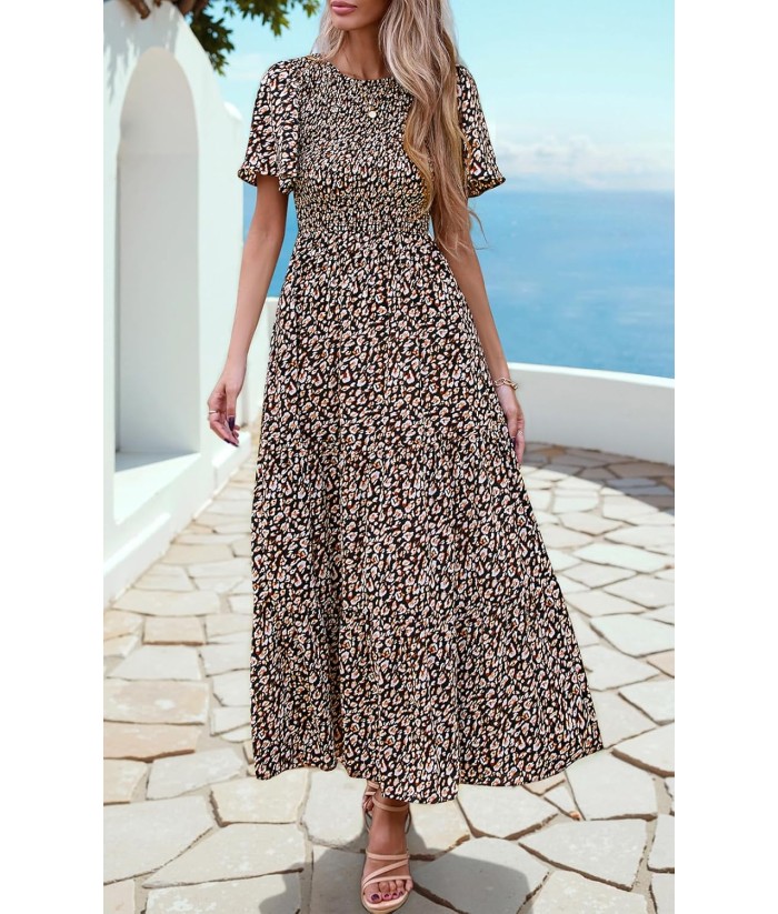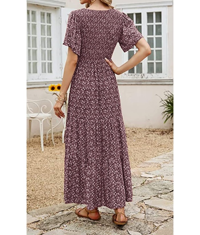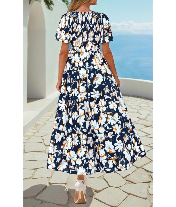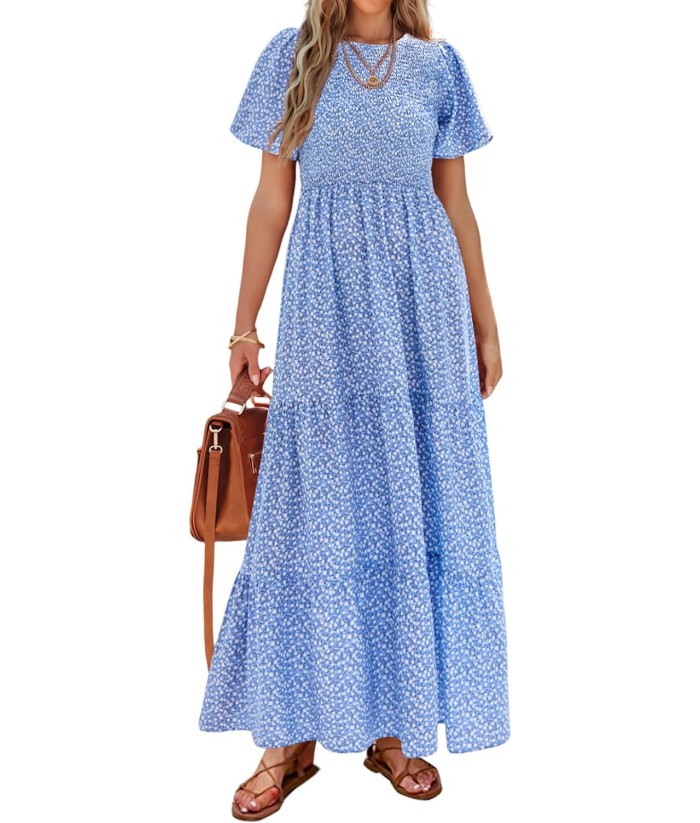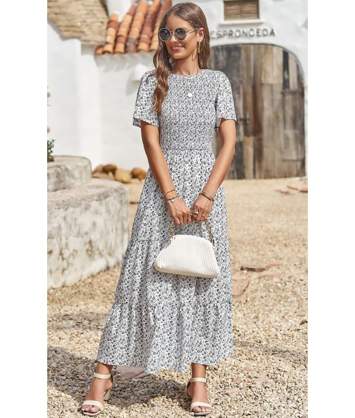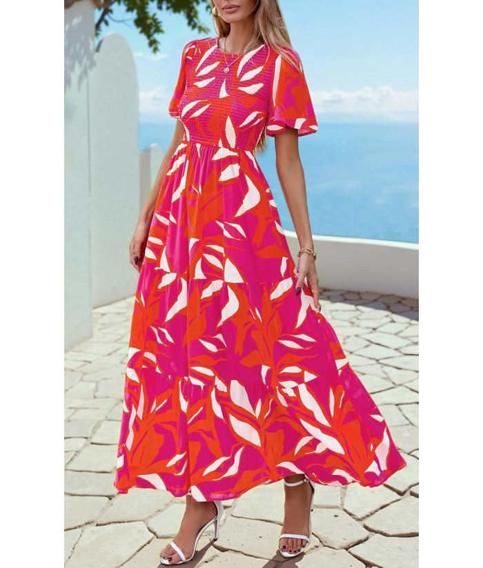 PRETTYGARDEN Women's 2025 Summer Casual Flutter Short Sleeve Boho Floral Maxi Dress Crew Neck Smocked Tiered Long Dresses