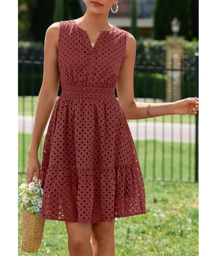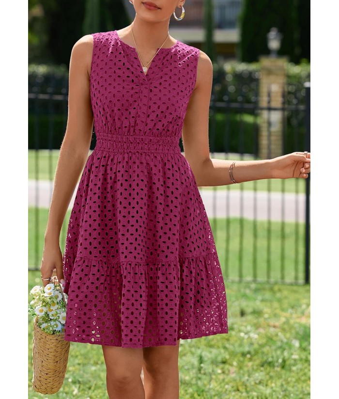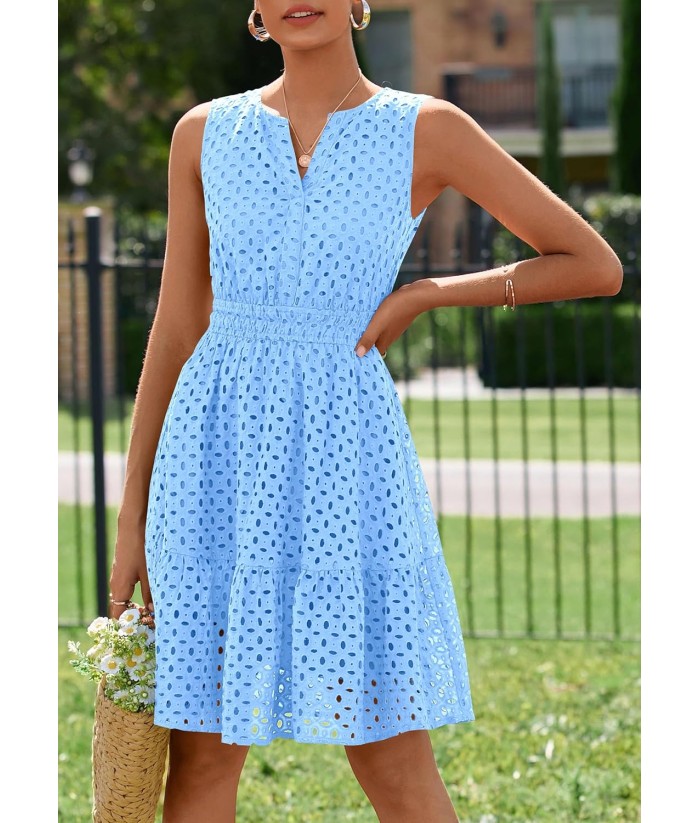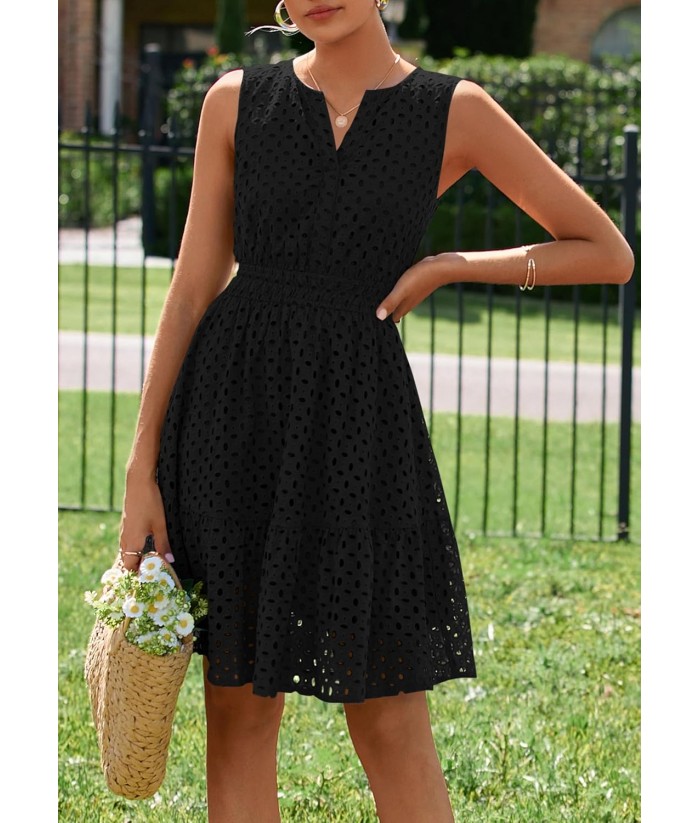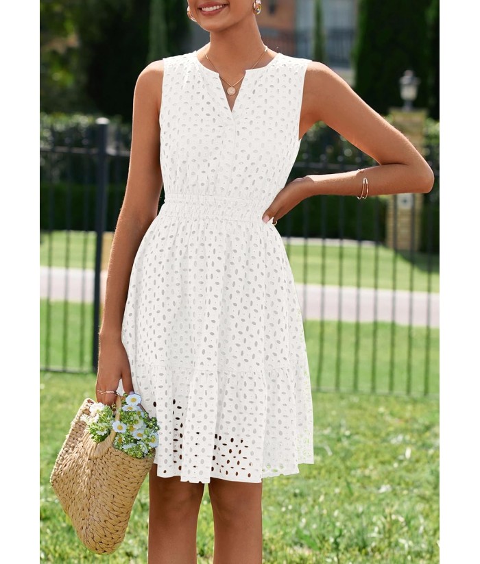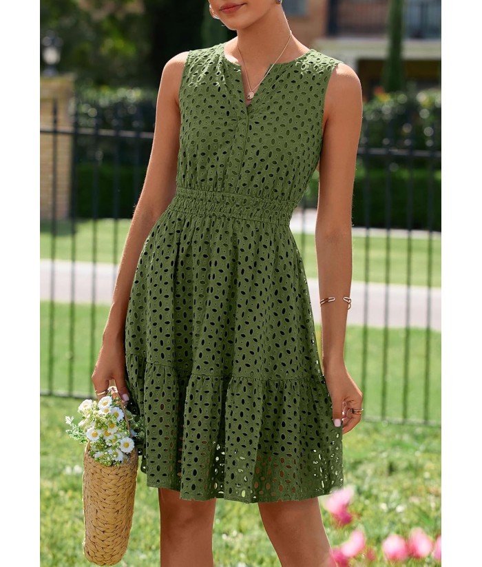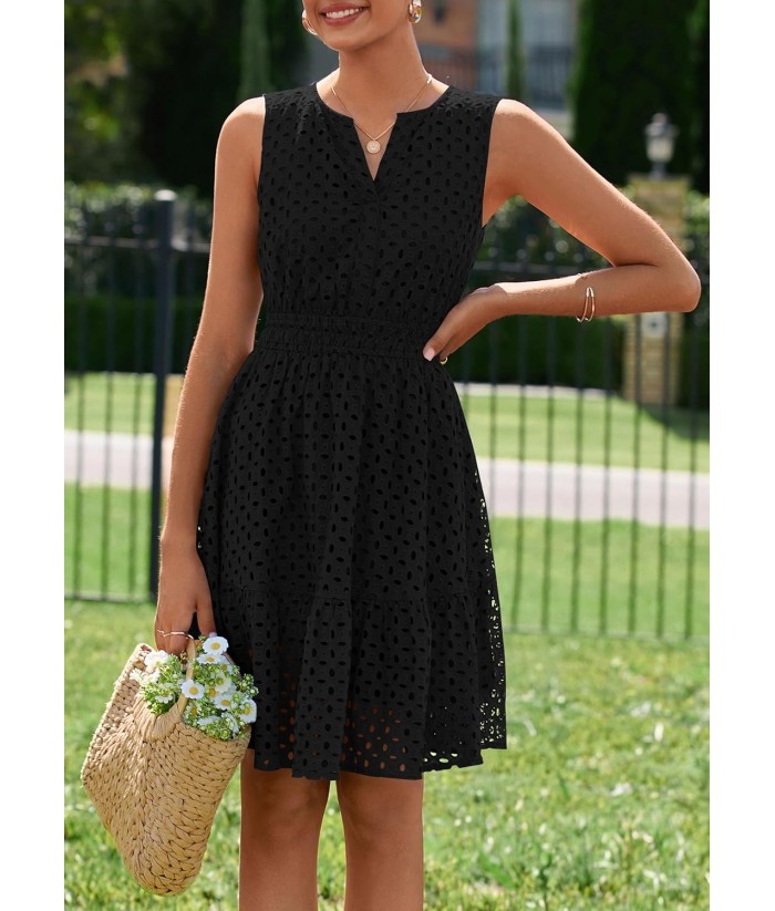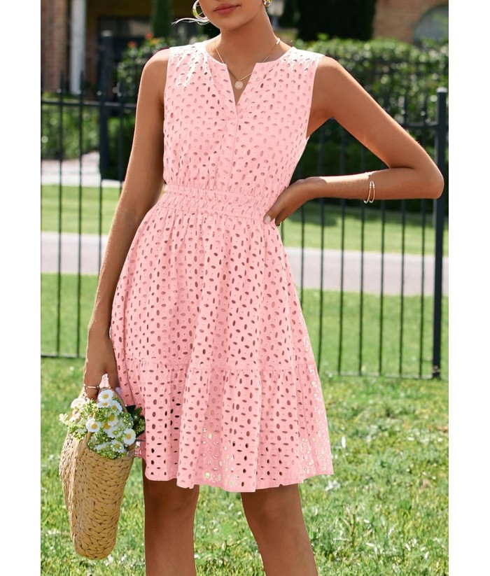PRETTYGARDEN Women's Summer Dresses 2025 Sleeveless V Neck Eyelet Hollow Out Swing A Line Beach Vacation Sun Dress