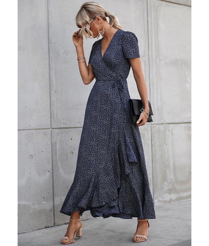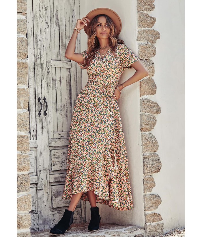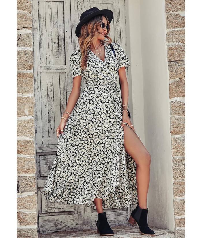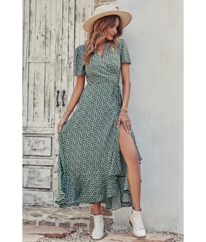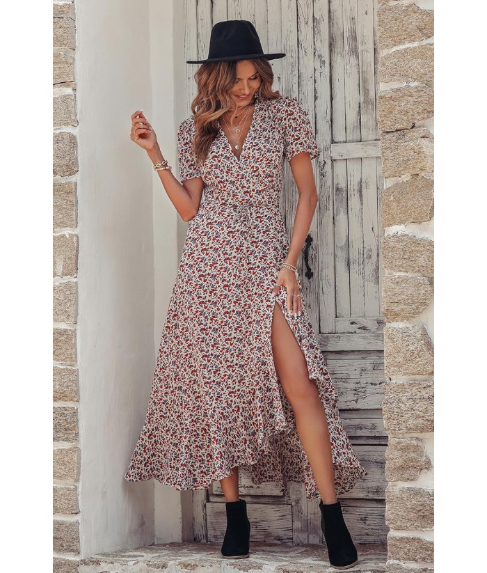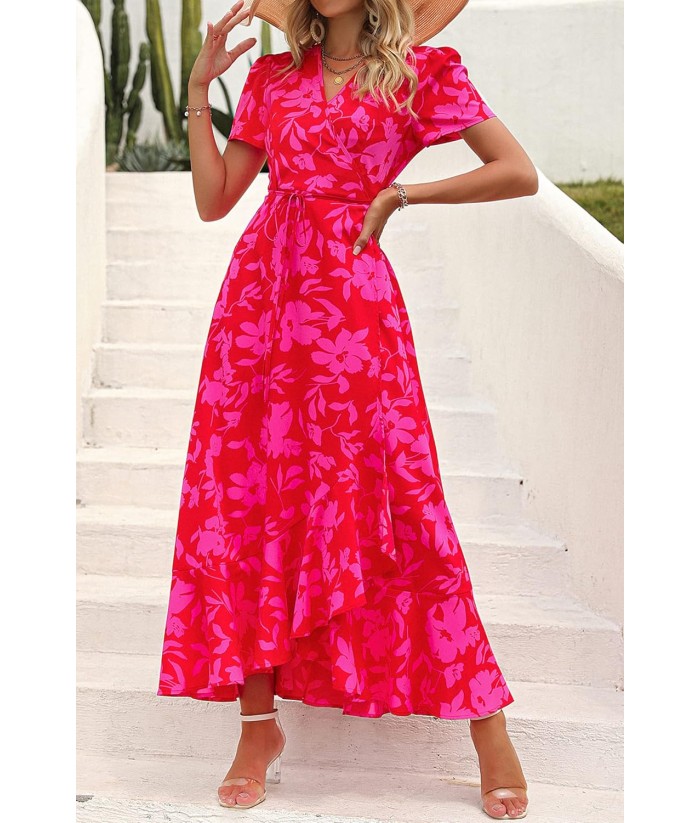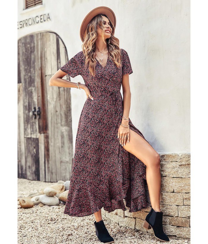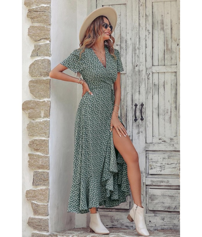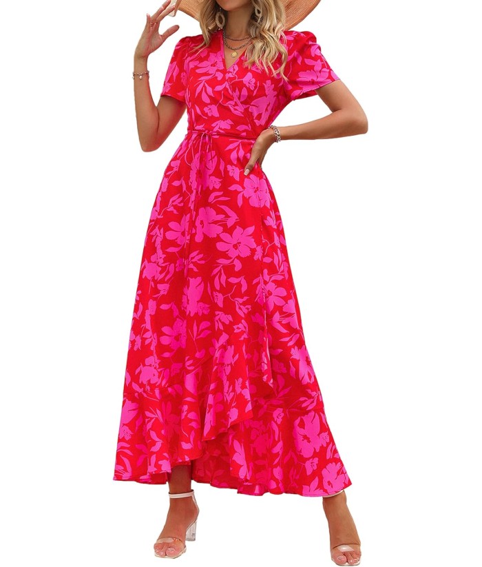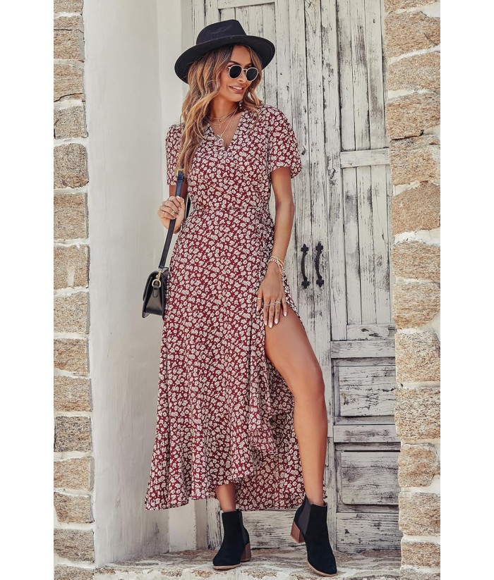 PRETTYGARDEN Women's Summer Maxi Dress Casual Wrap Floral Boho Short Sleeve V Neck Split Ruffle Beach Long Dresses