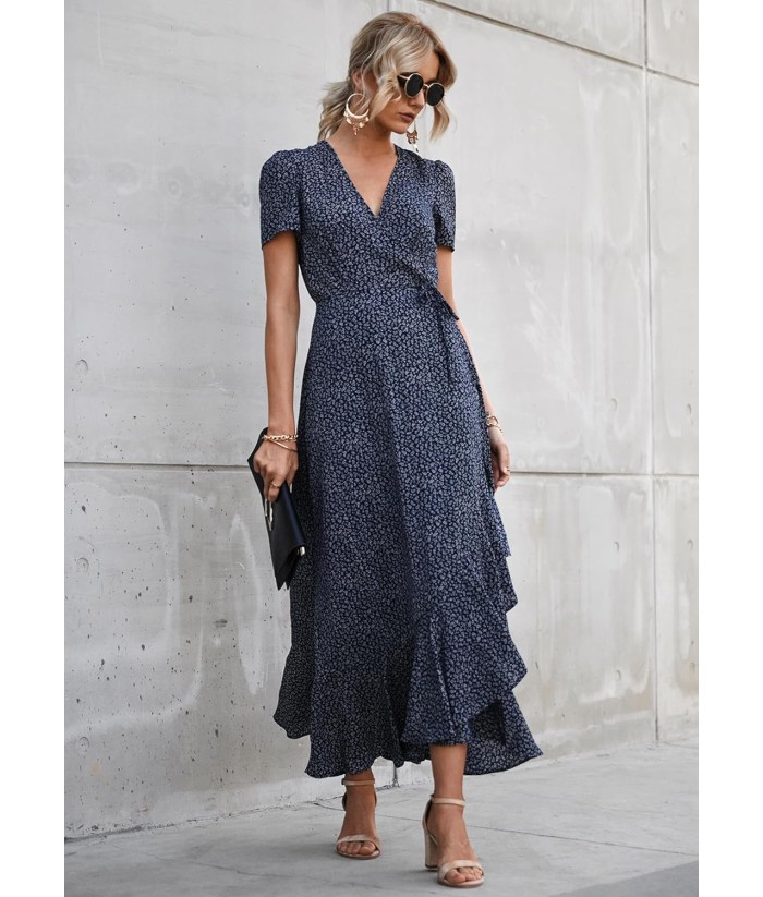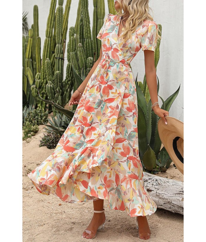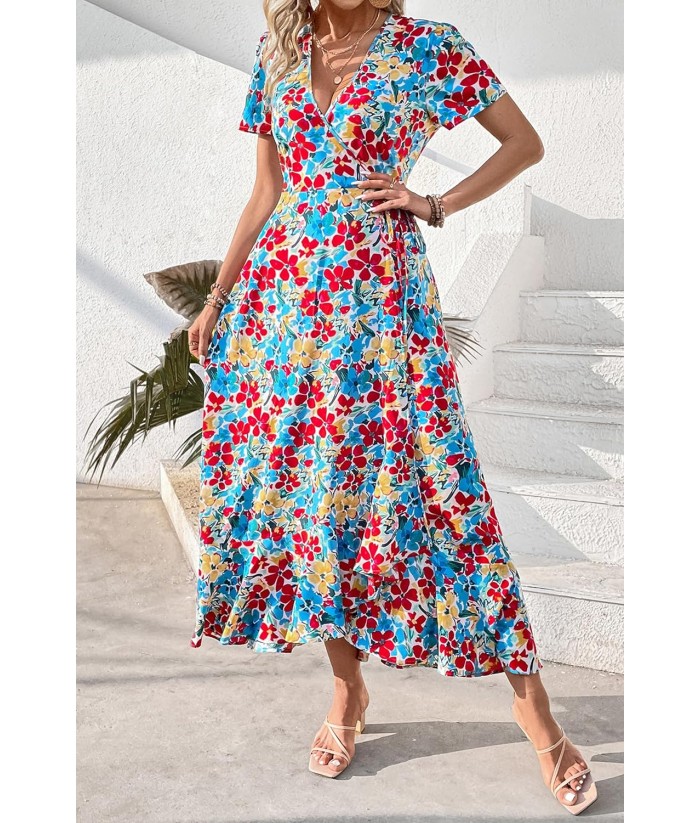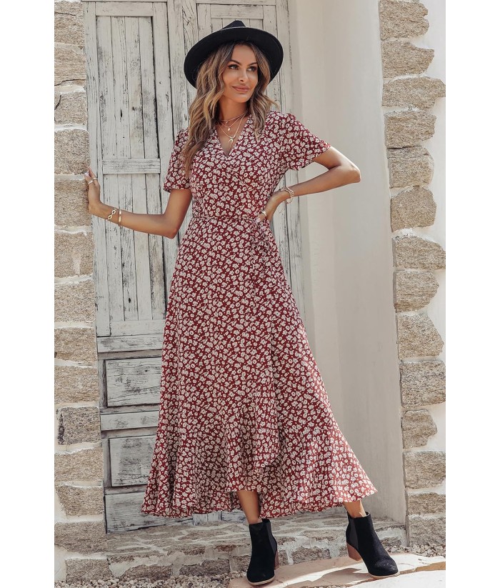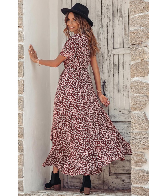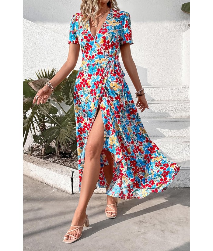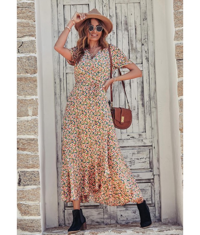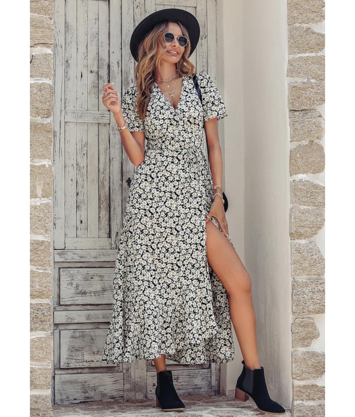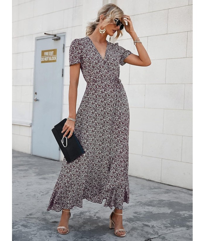 PRETTYGARDEN Women's Summer Maxi Dress Casual Wrap Floral Boho Short Sleeve V Neck Split Ruffle Beach Long Dresses