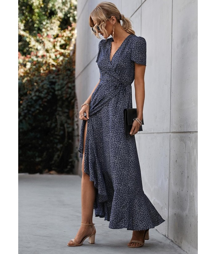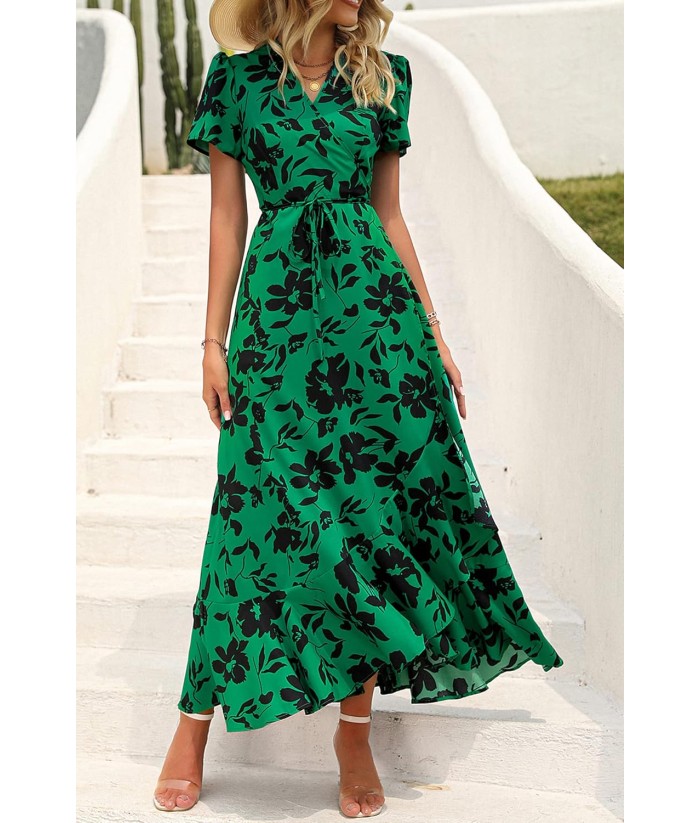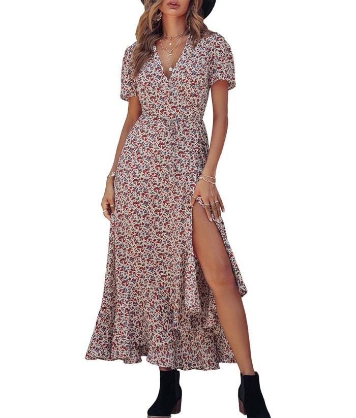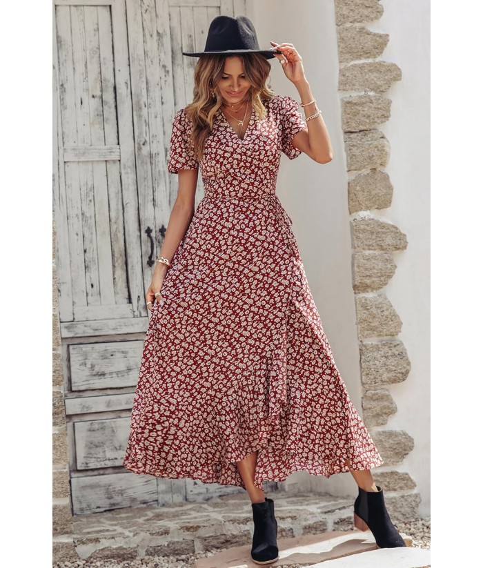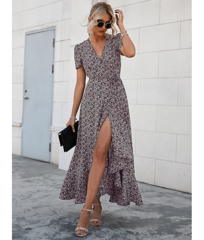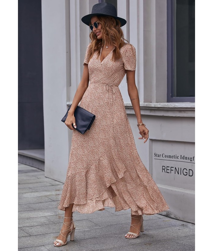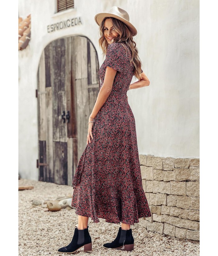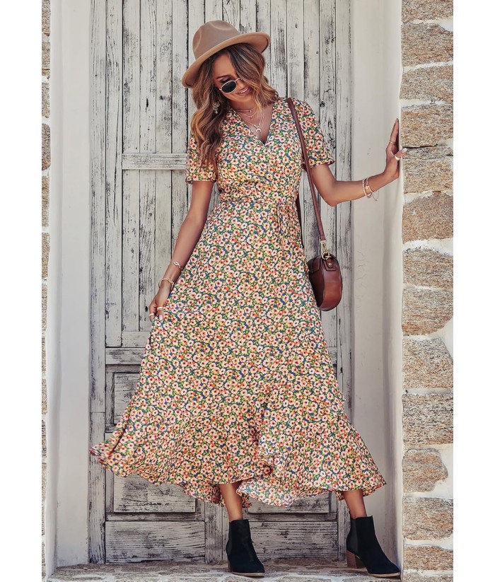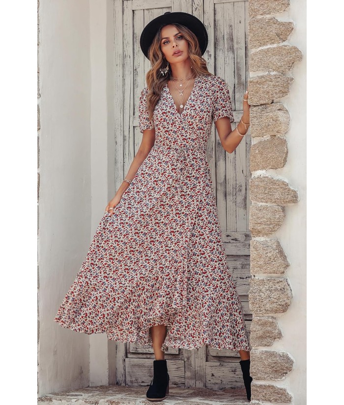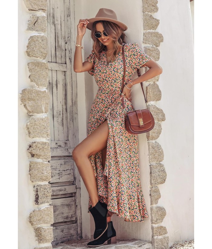 PRETTYGARDEN Women's Summer Maxi Dress Casual Wrap Floral Boho Short Sleeve V Neck Split Ruffle Beach Long Dresses