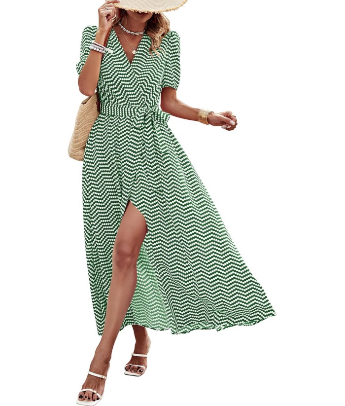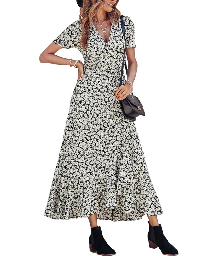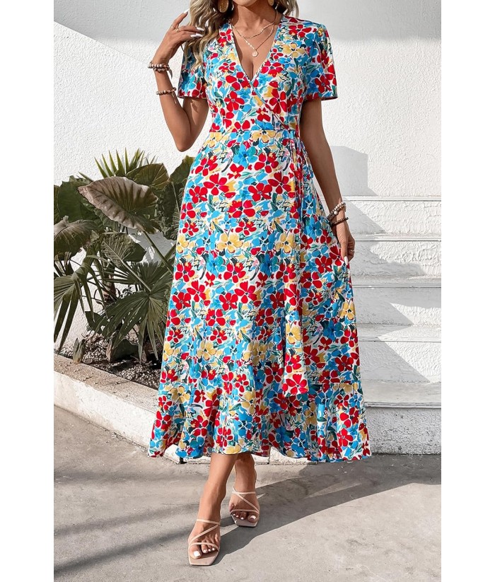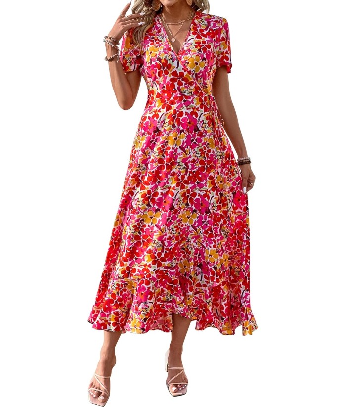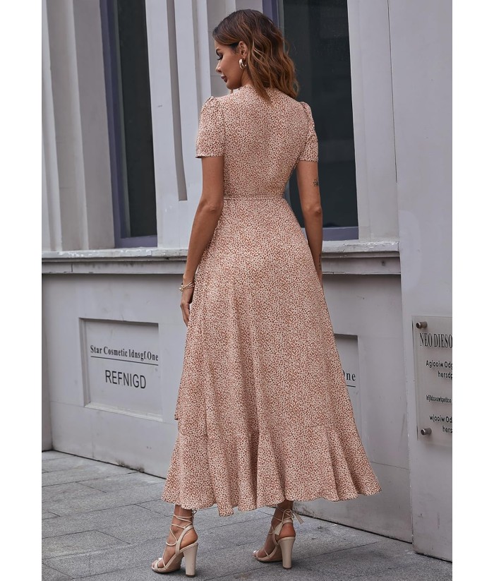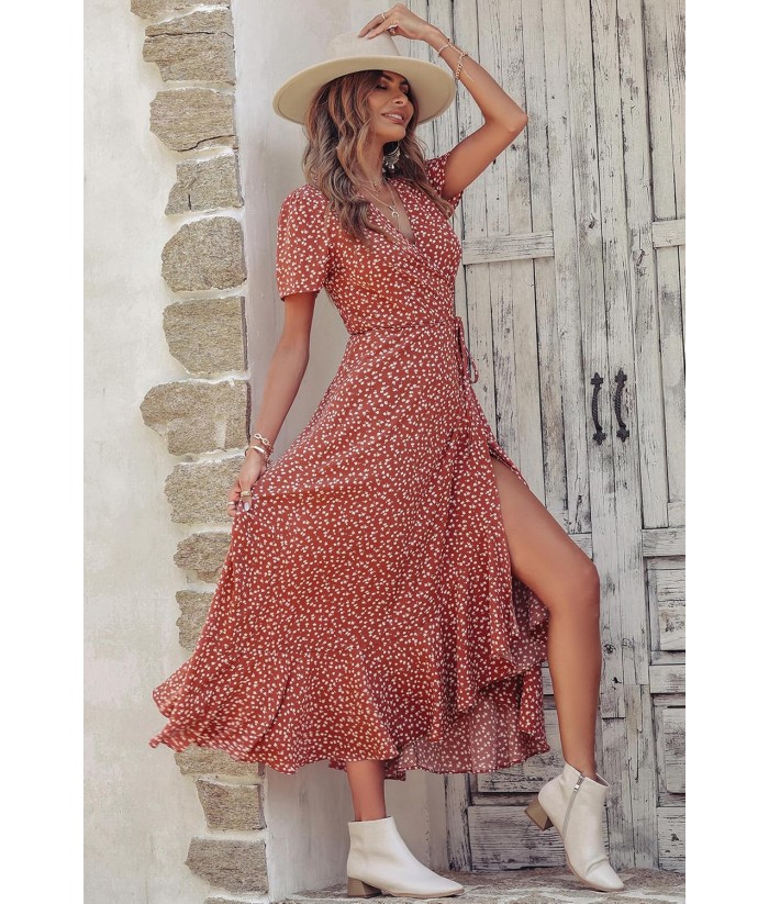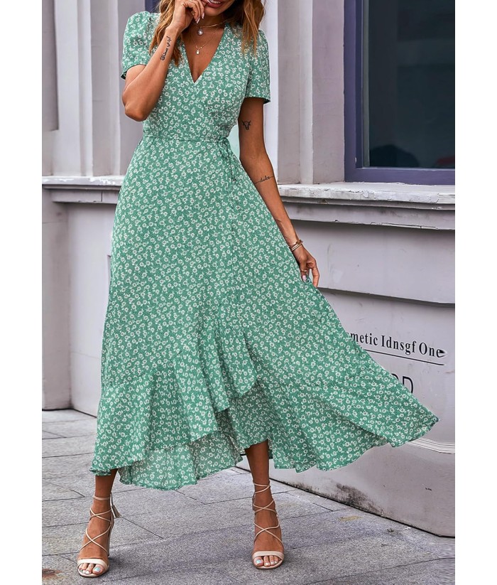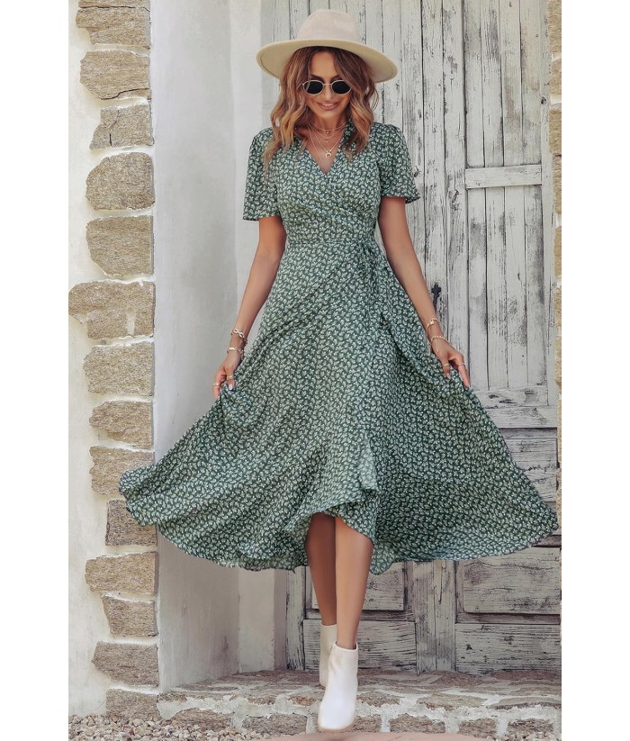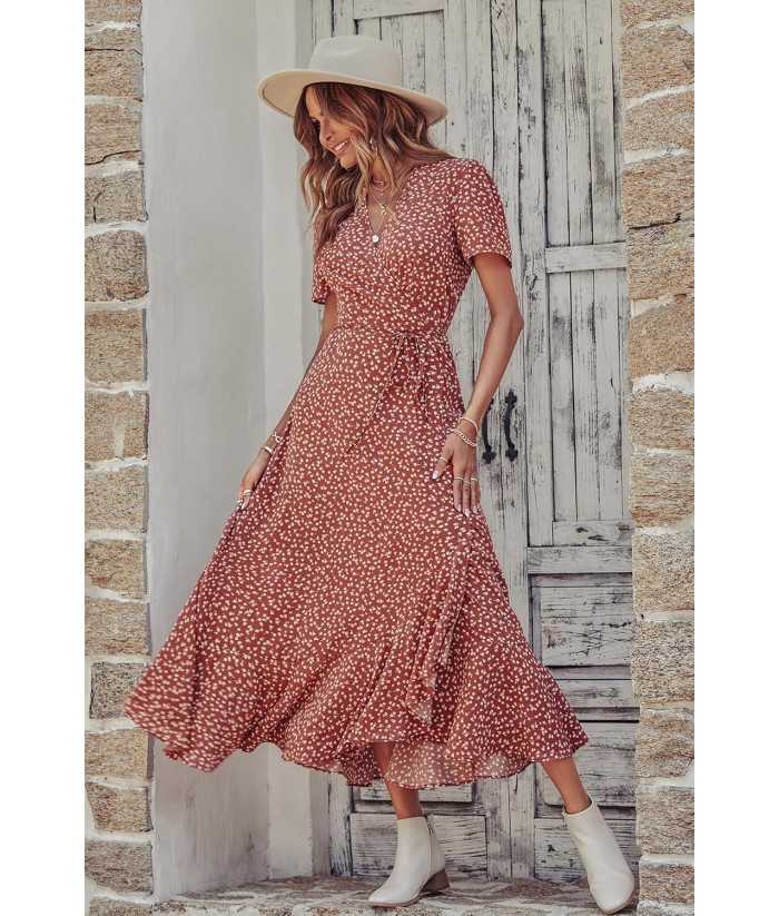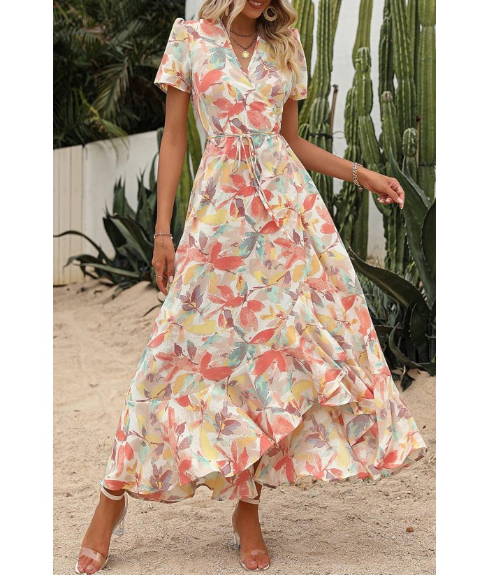 PRETTYGARDEN Women's Summer Maxi Dress Casual Wrap Floral Boho Short Sleeve V Neck Split Ruffle Beach Long Dresses