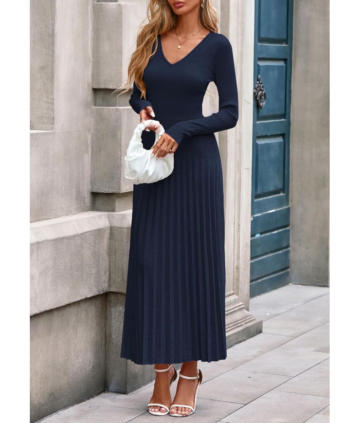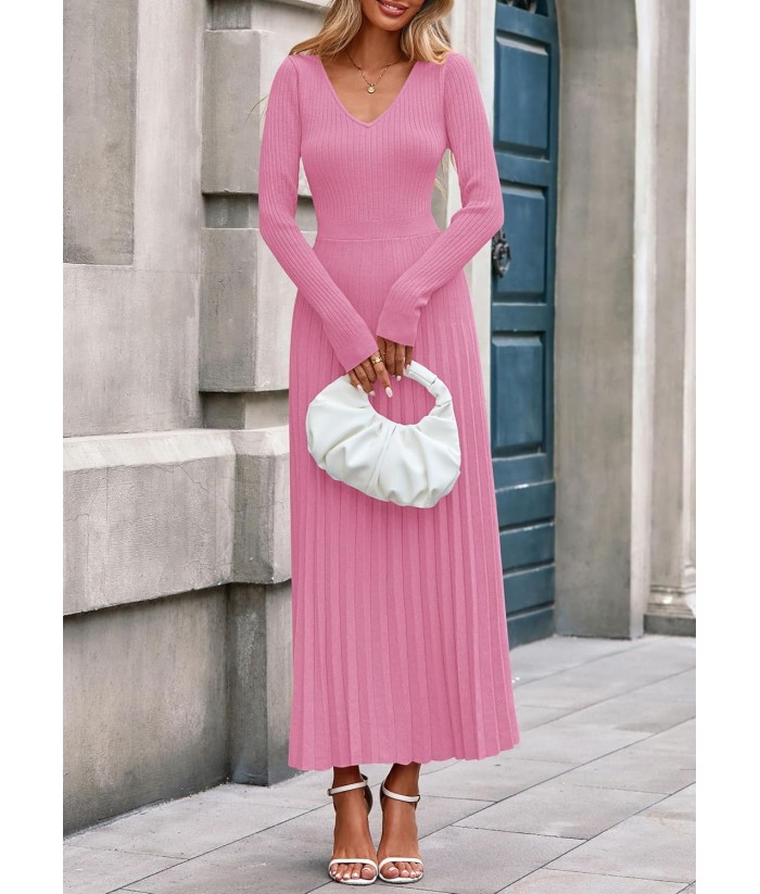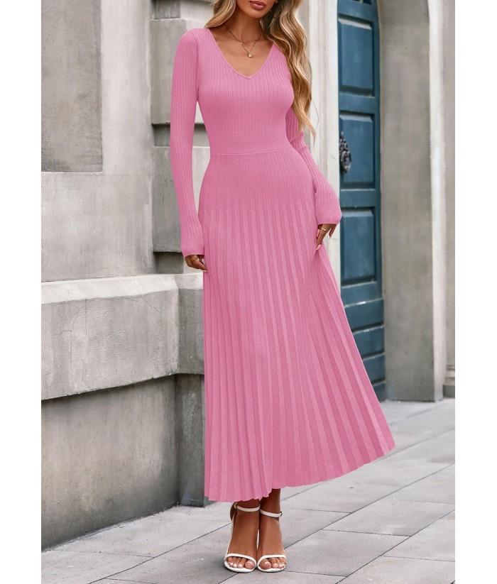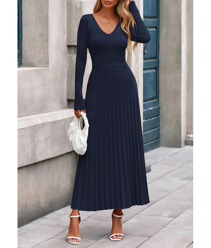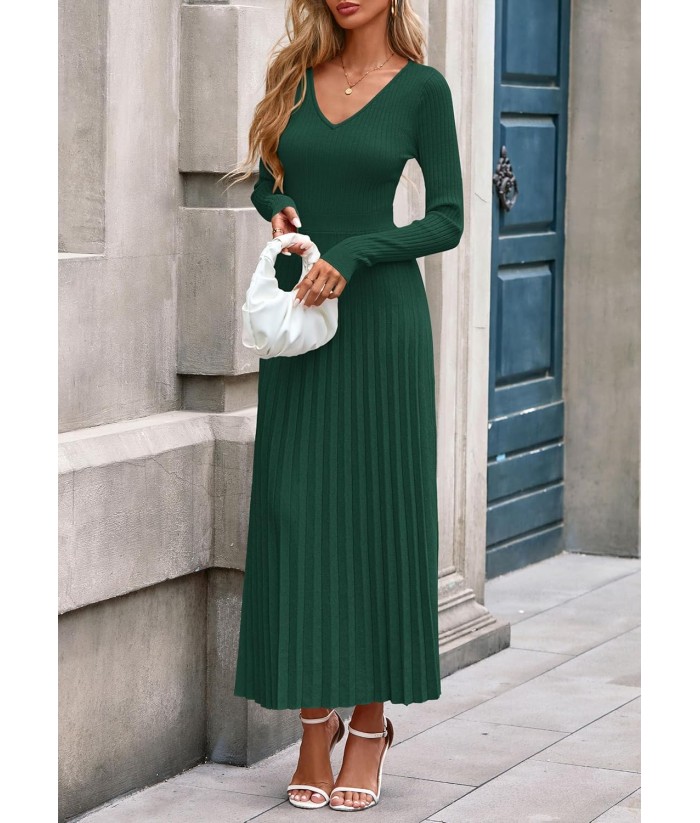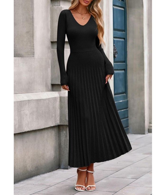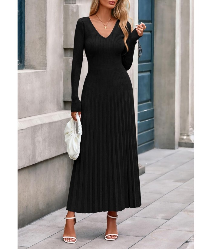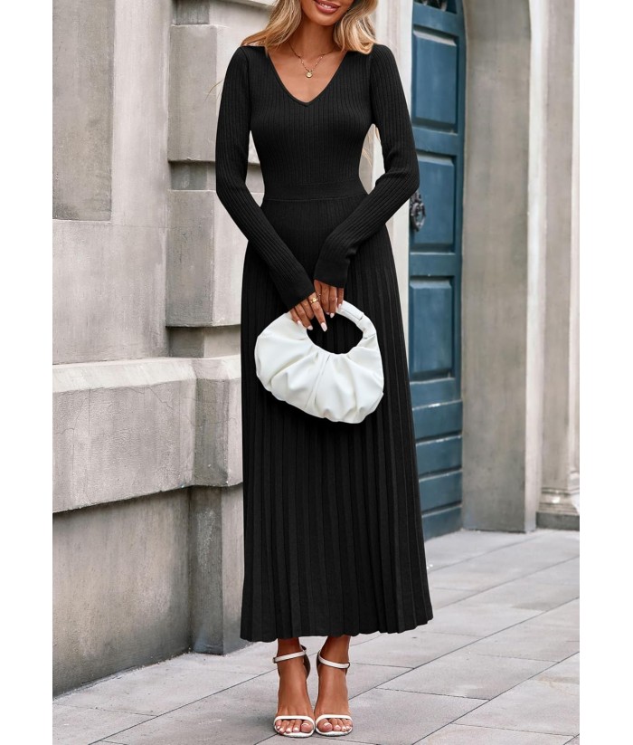 PRETTYGARDEN Women Sweater Dress Fall Fashion 2025 Long Sleeve V Neck Ribbed Knit Pleated A Line Elegant Maxi Winter Dresses