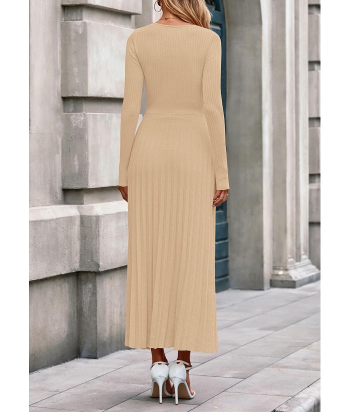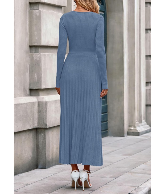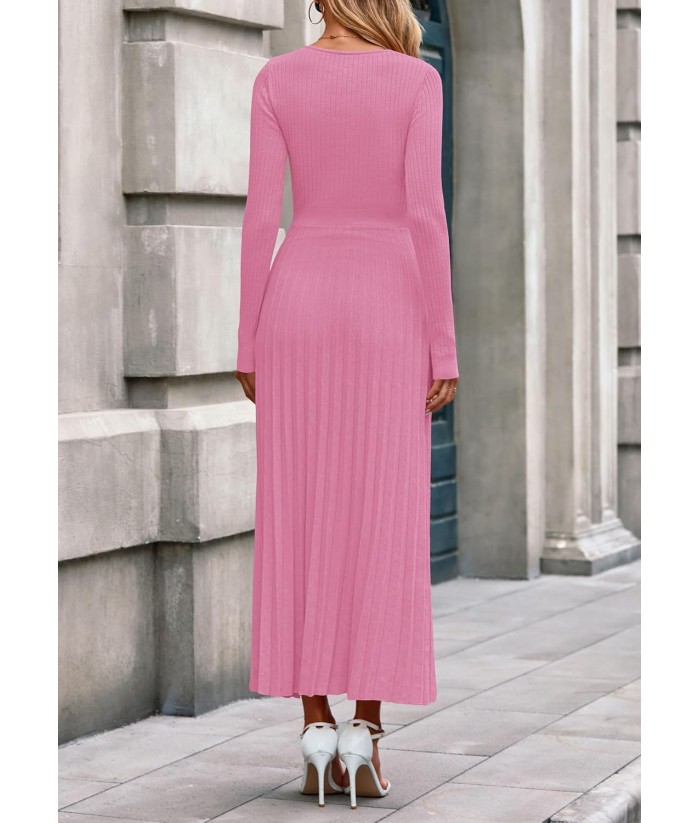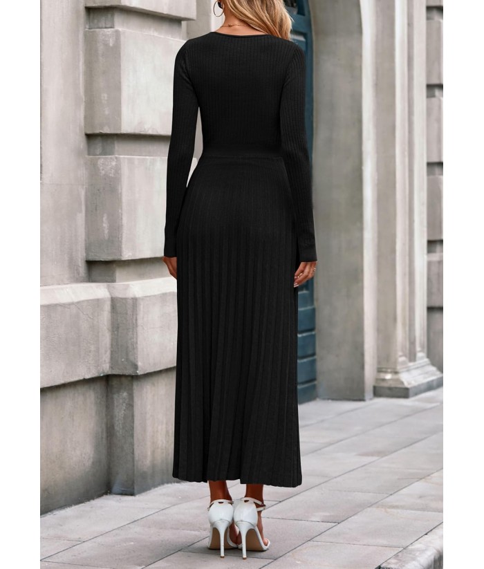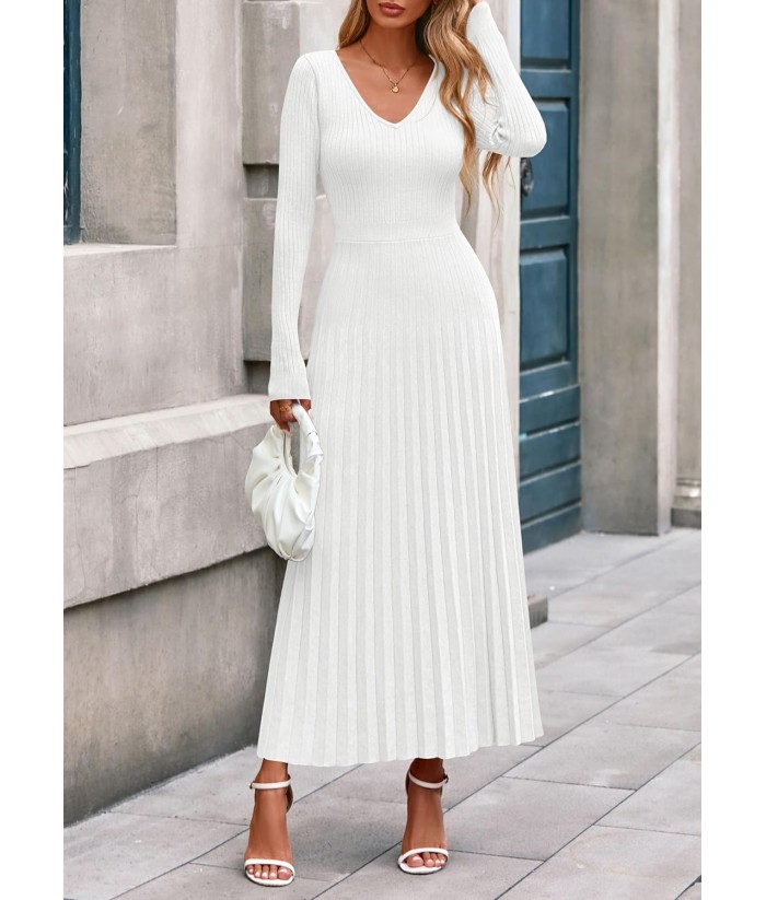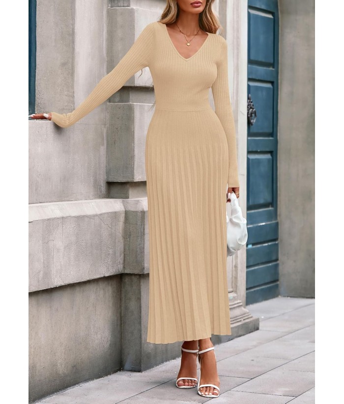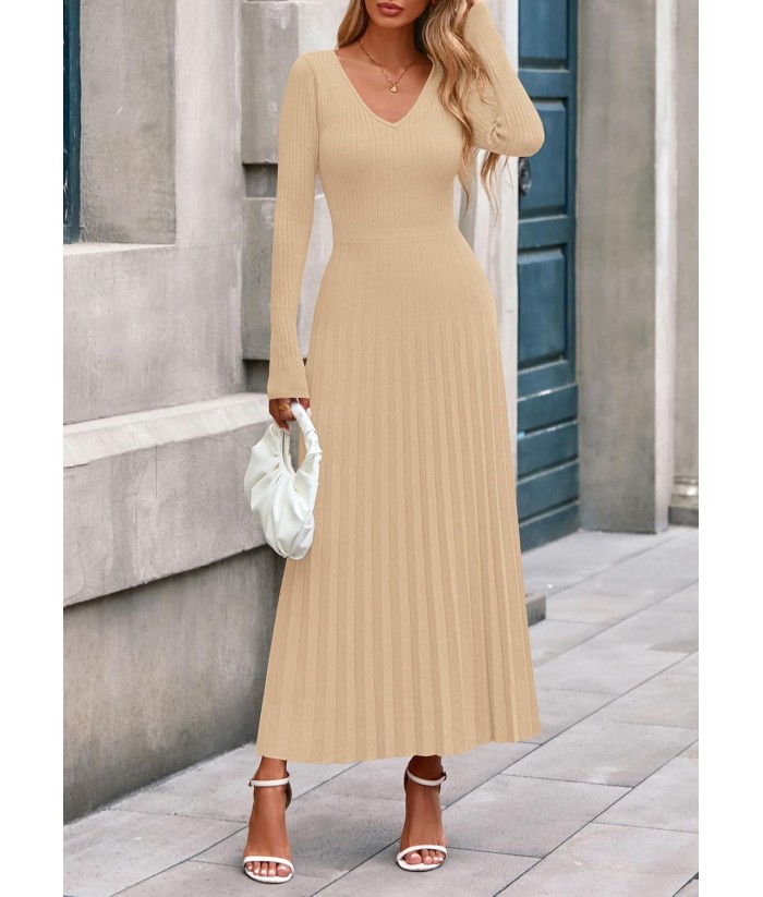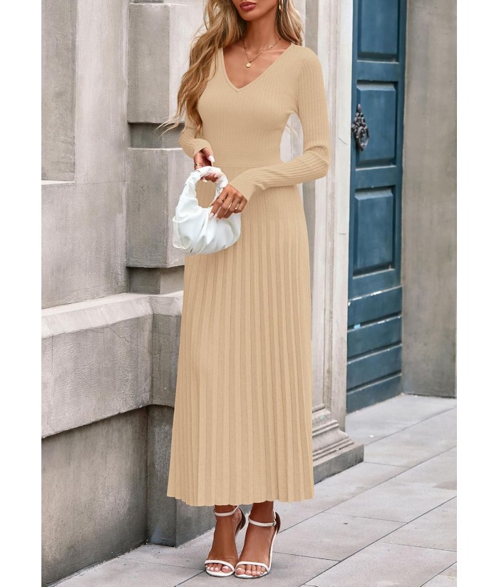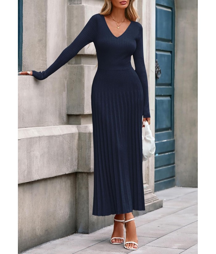 PRETTYGARDEN Women Sweater Dress Fall Fashion 2025 Long Sleeve V Neck Ribbed Knit Pleated A Line Elegant Maxi Winter Dresses