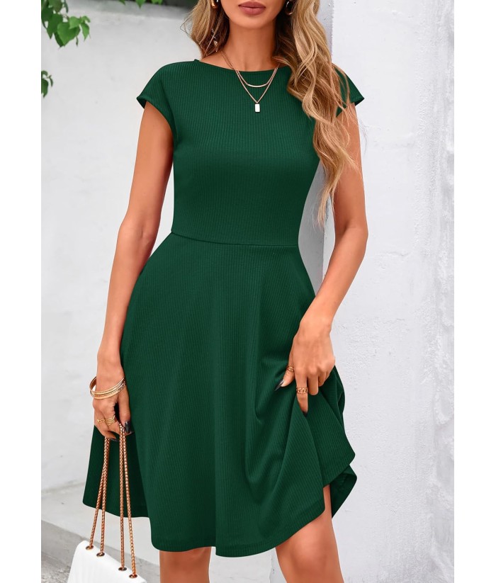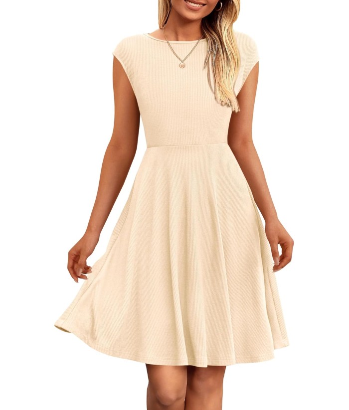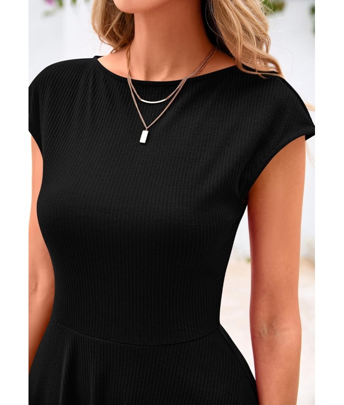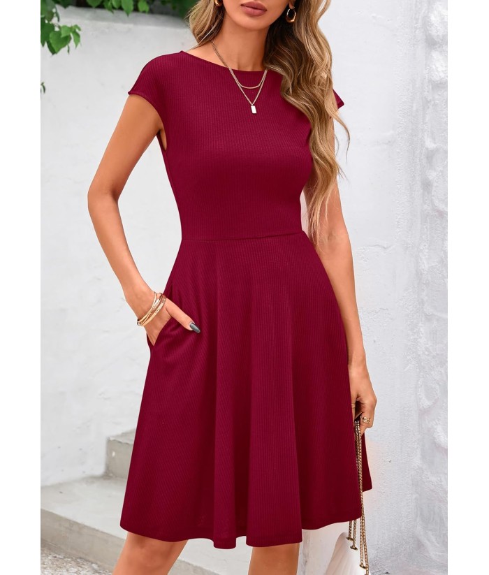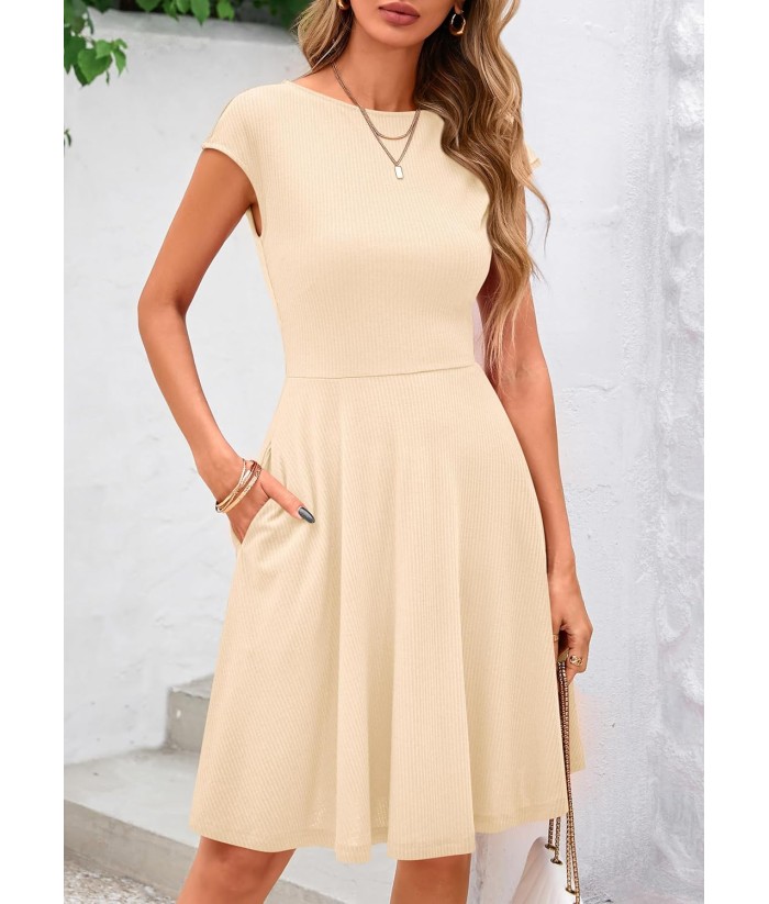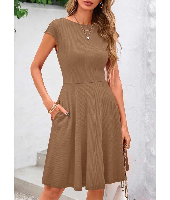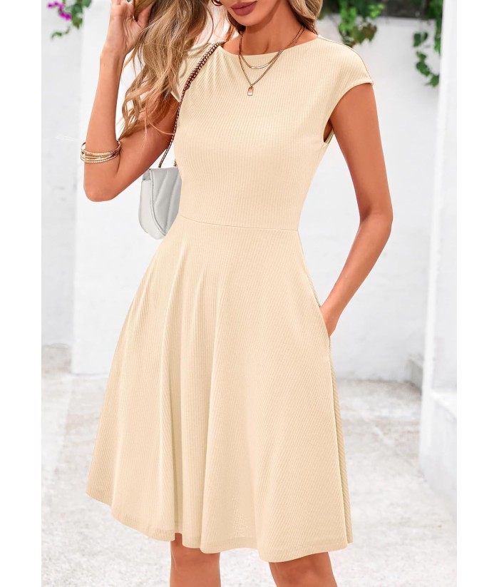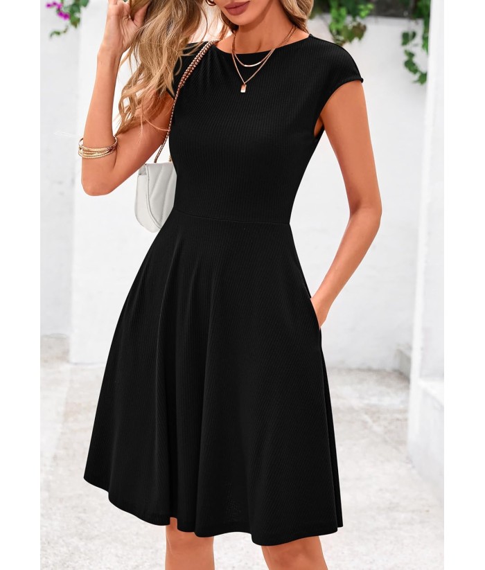 PRETTYGARDEN Womens Short Summer Dress 2025 Crewneck Cap Sleeve Ribbed Knit Casual Flowy A Line Mini Sundresses with Pockets