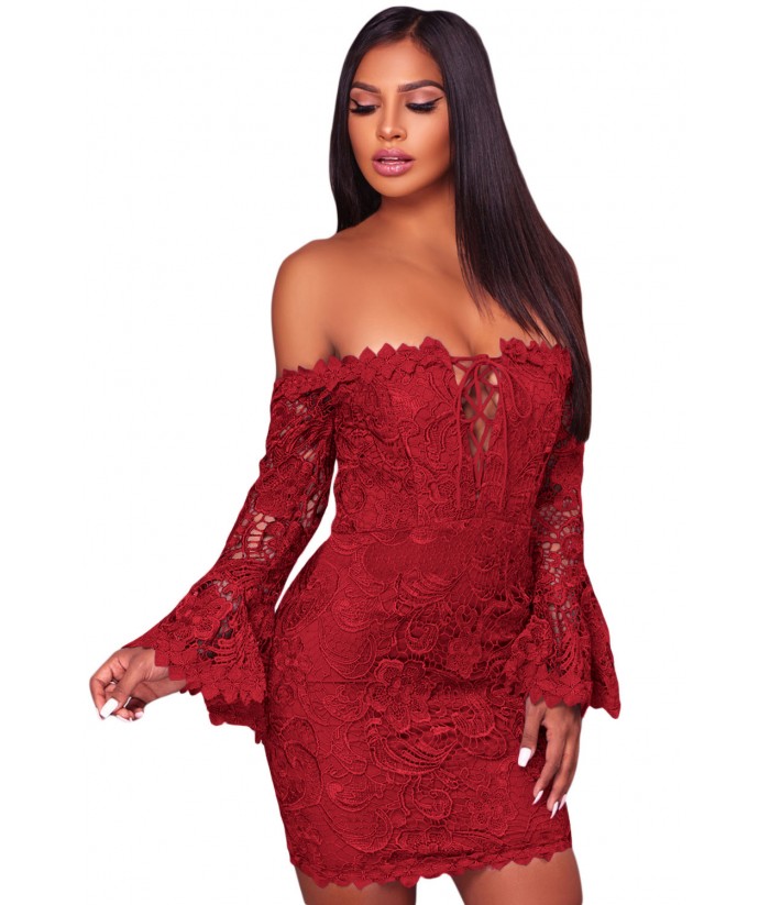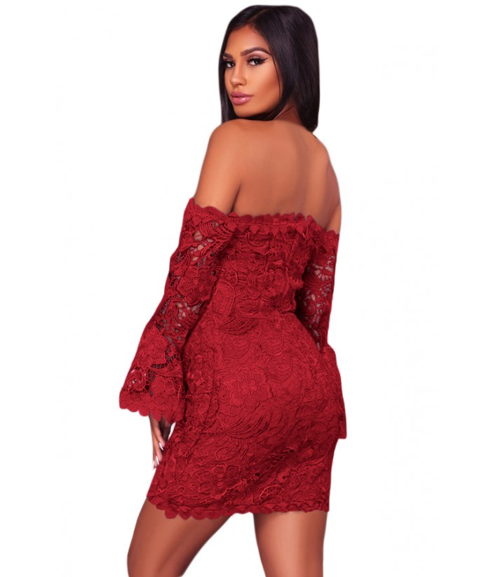 Product Name | Purplish Red Crochet Overlay Off The Shoulder Fitted Mini Dress |