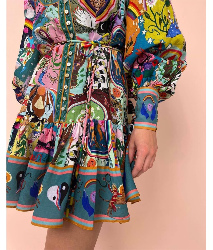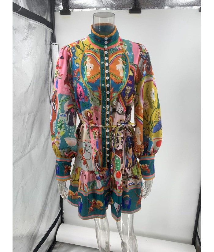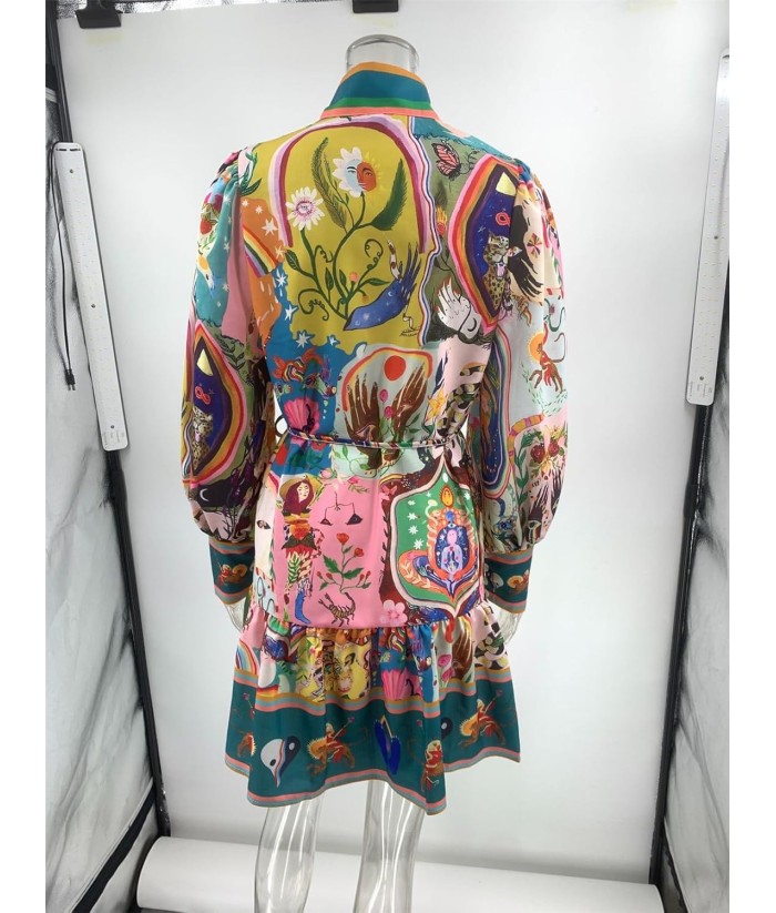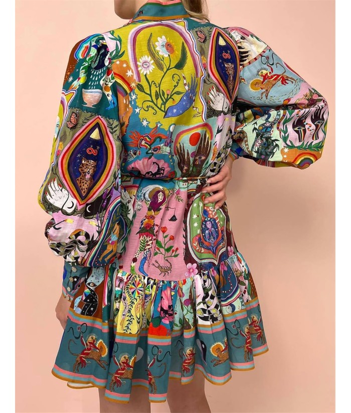 Qikaka Women's Long Puff Sleeve Turtleneck Printed Button Bodycon Sexy Nightclub Party Blouse Dress