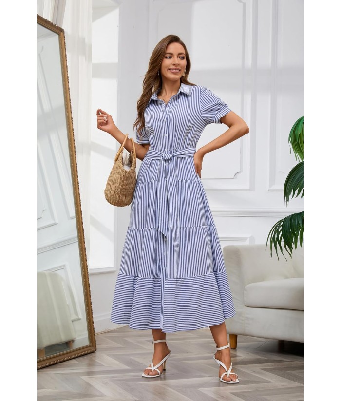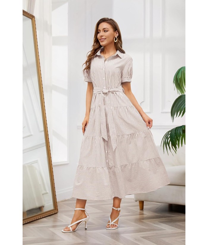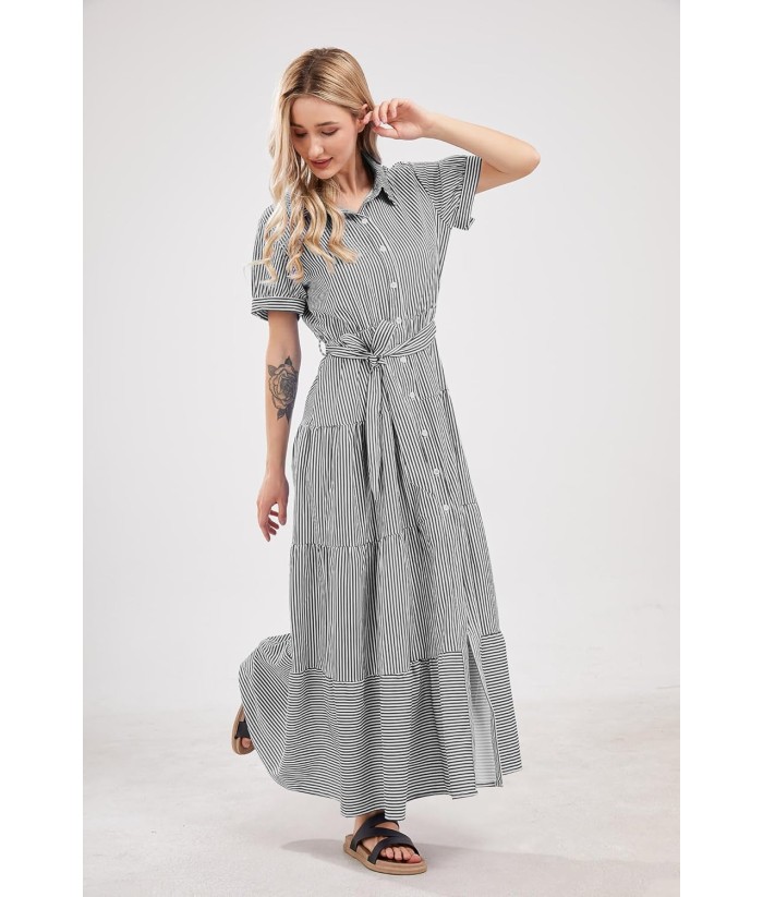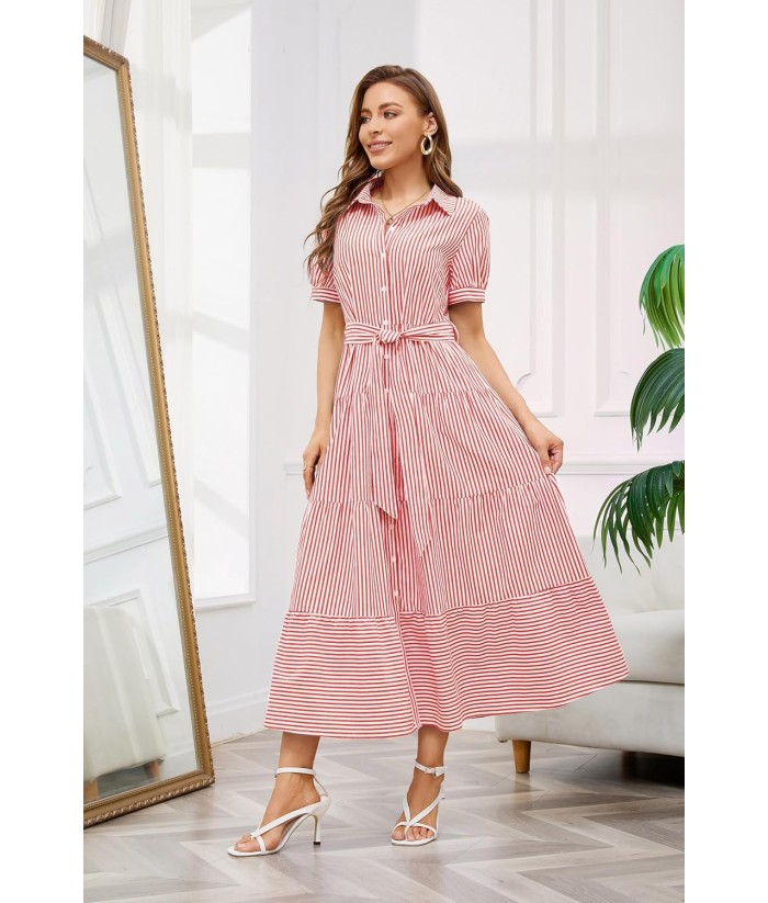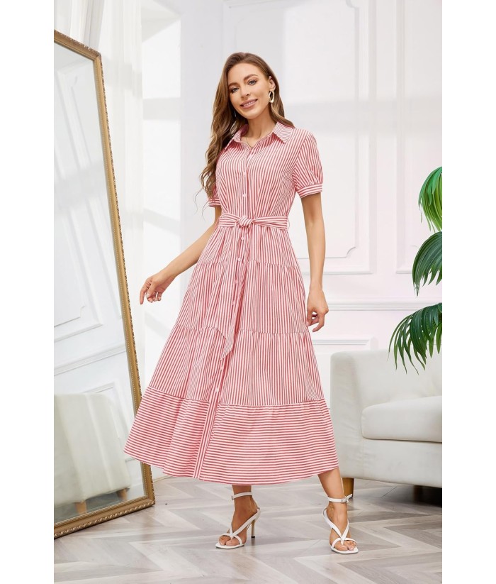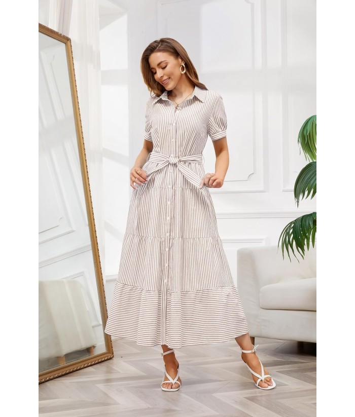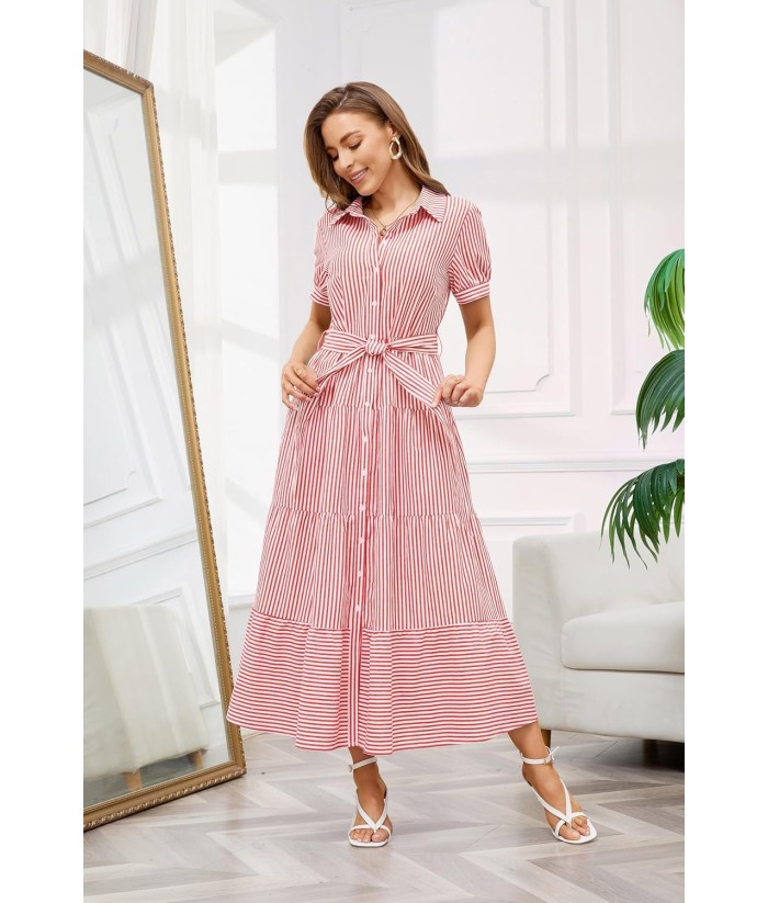 utcoco Womens Casual Short Sleeve Button Down Tie Waist Ruffled Striped Maxi Shirt Dress