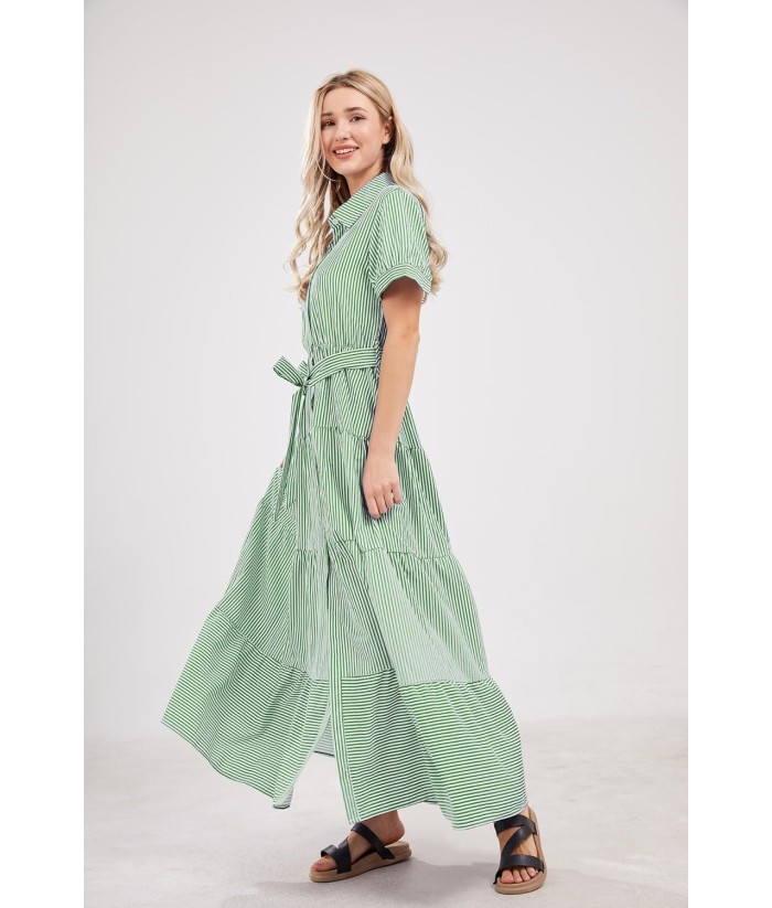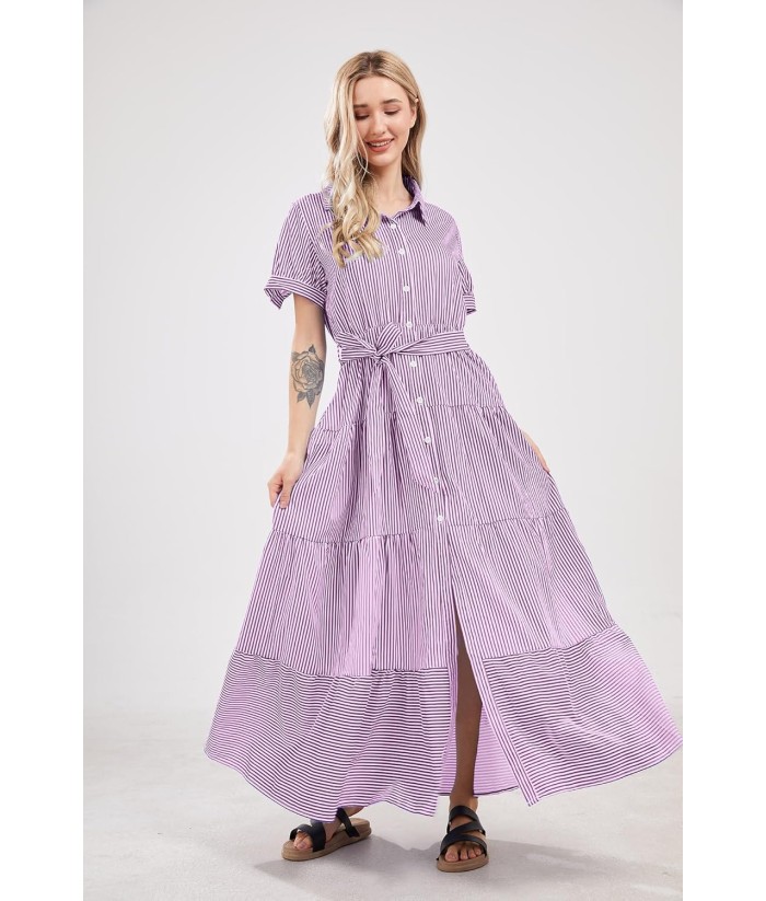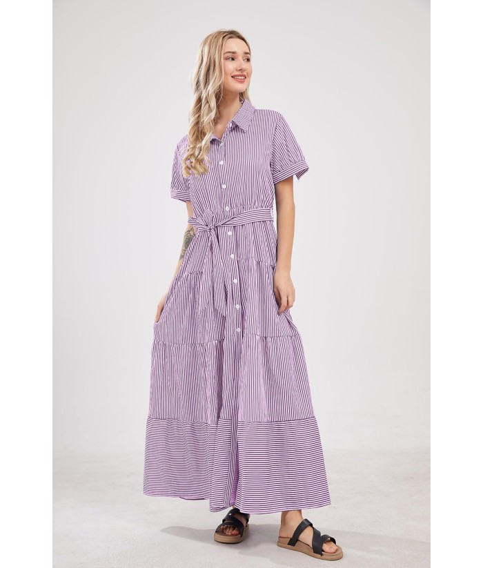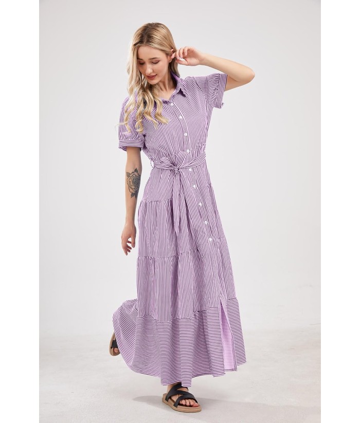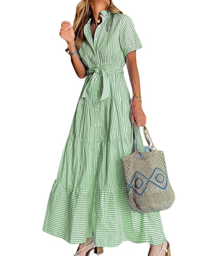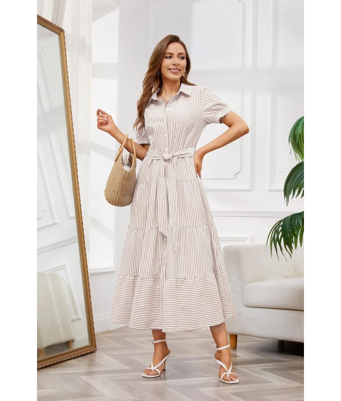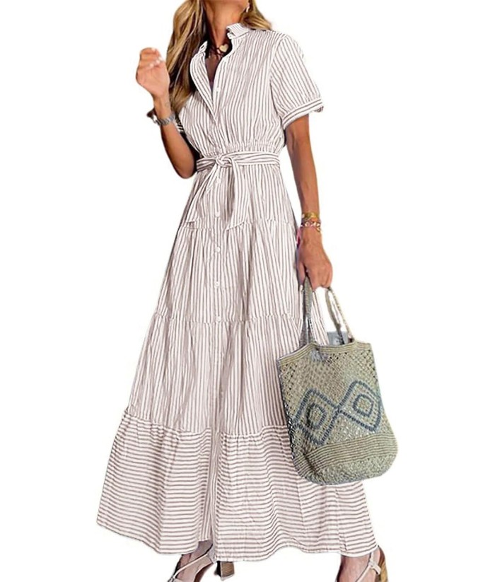 utcoco Womens Casual Short Sleeve Button Down Tie Waist Ruffled Striped Maxi Shirt Dress