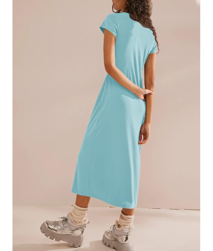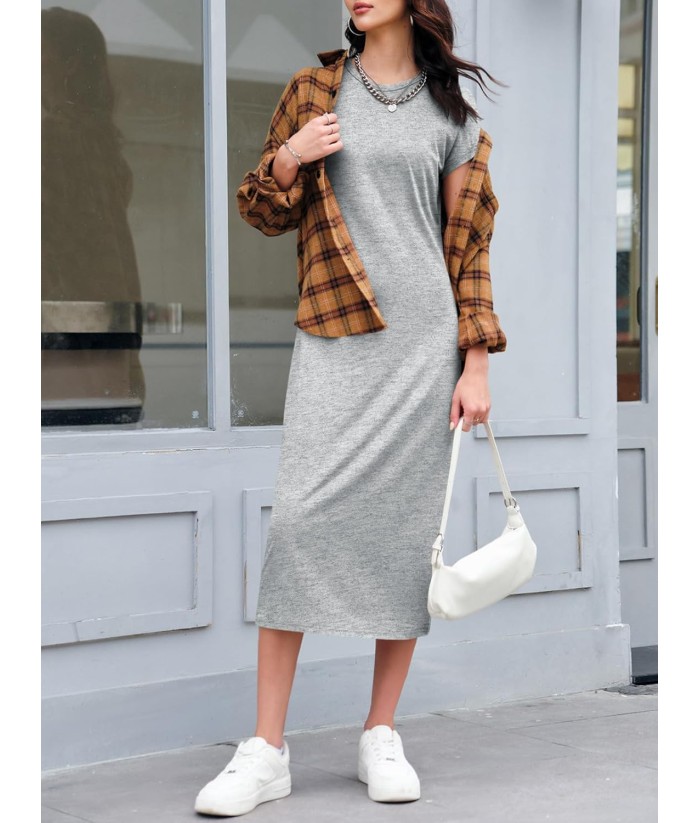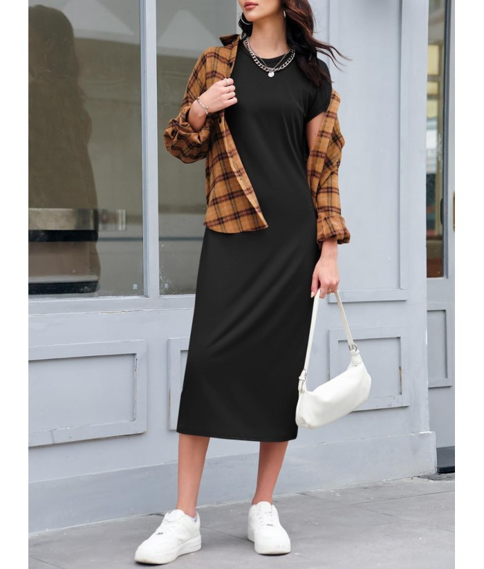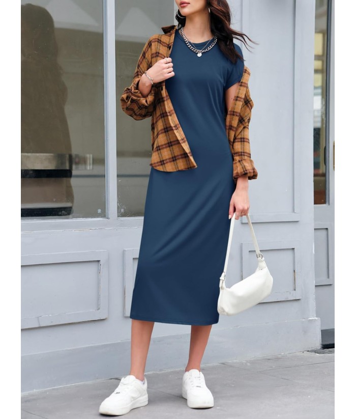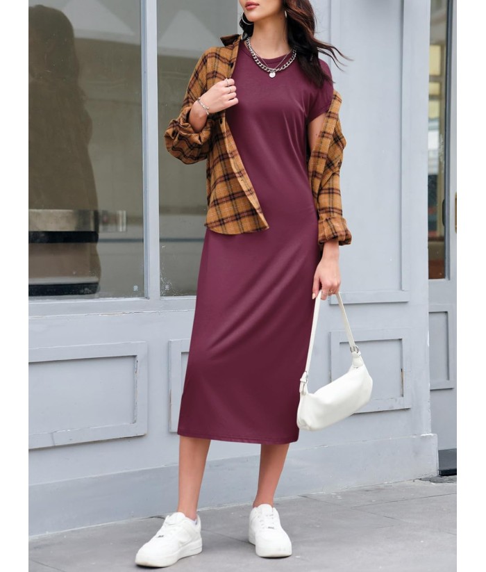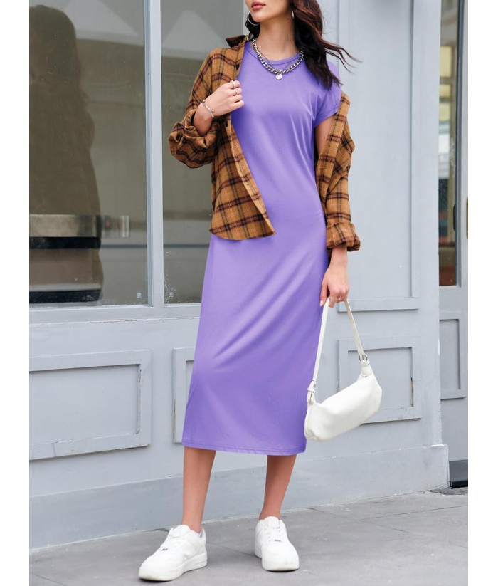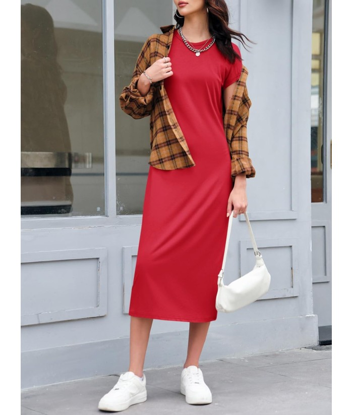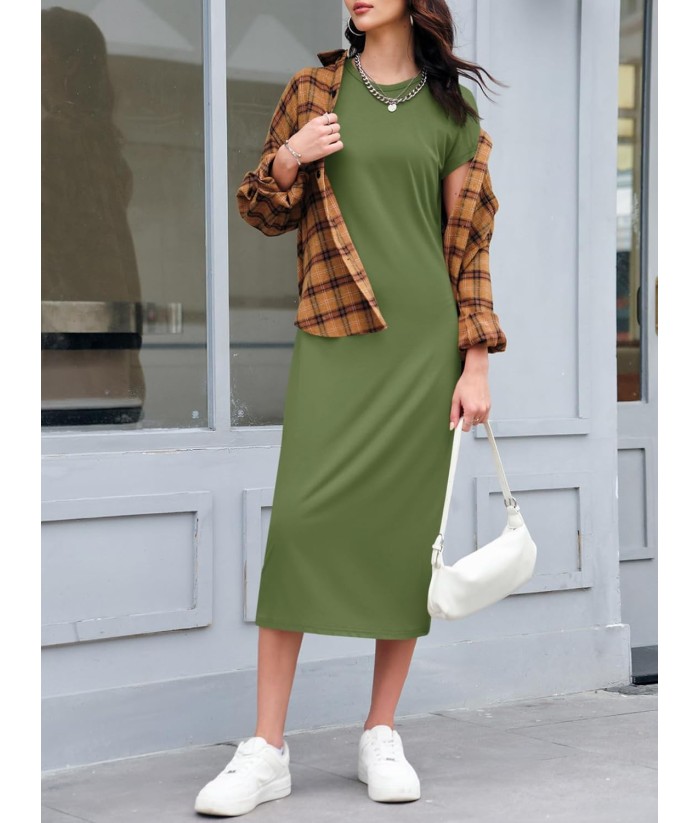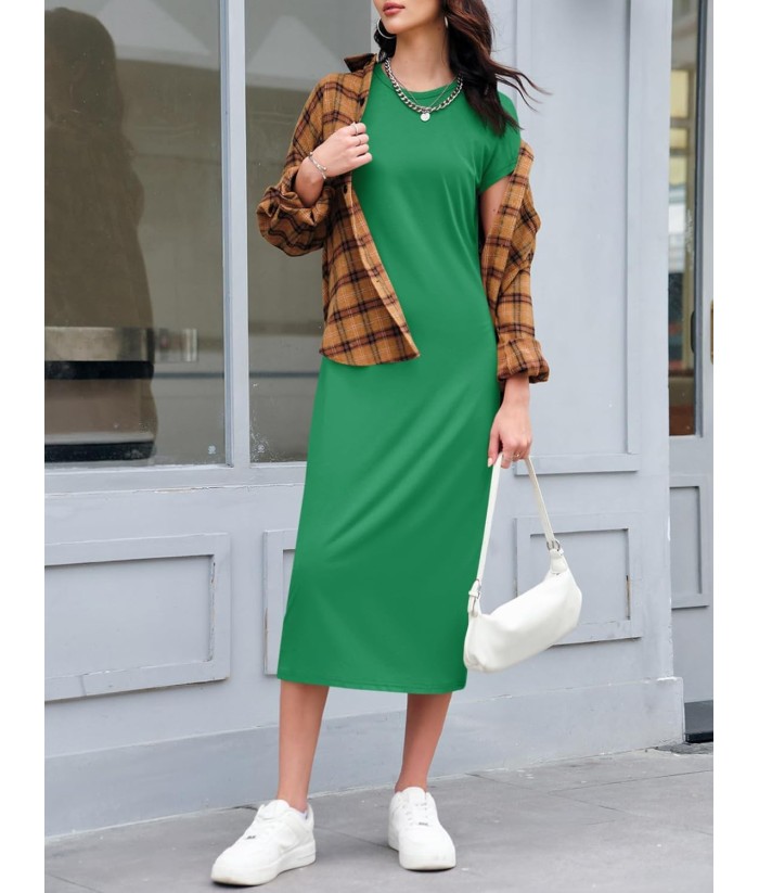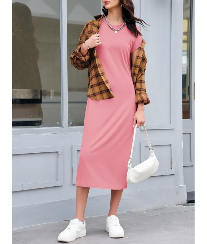 Wenrine Women's Short Sleeve T-Shirt Dress Summer Crew Neck Basic Solid Casual Long Midi Dresses