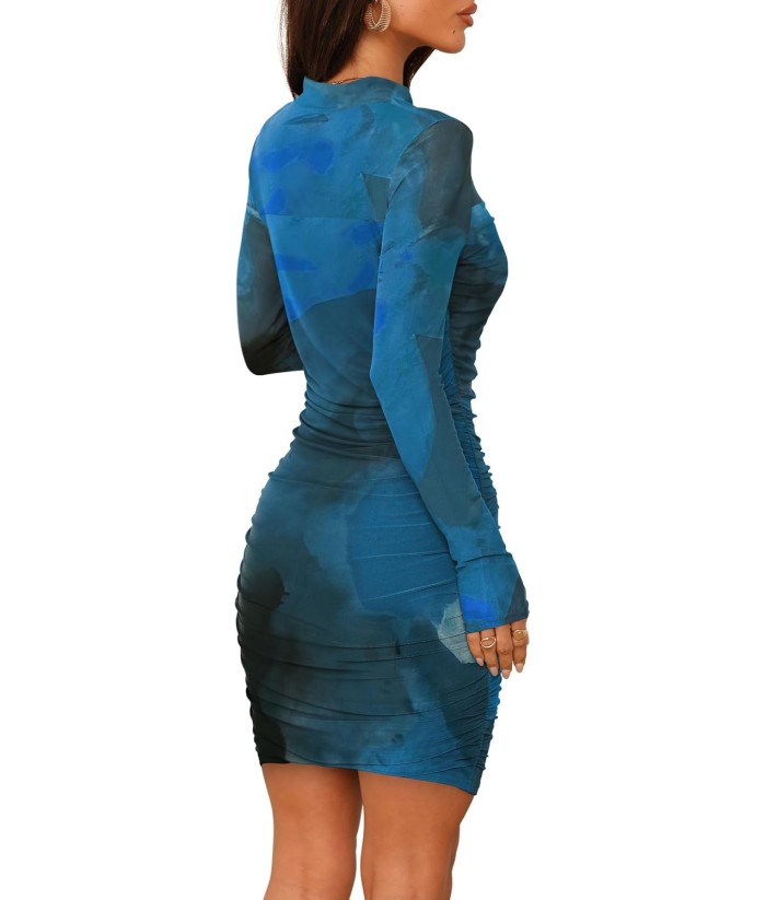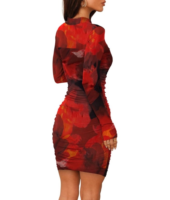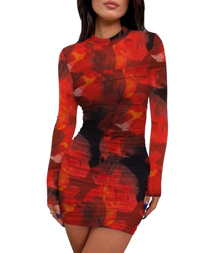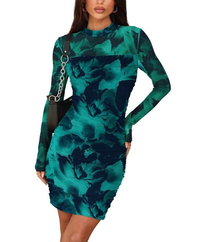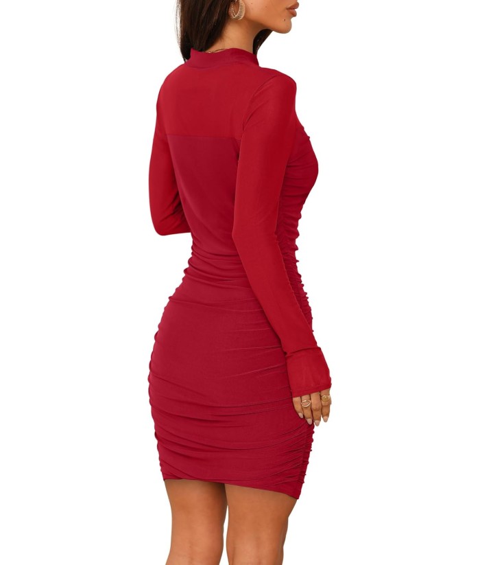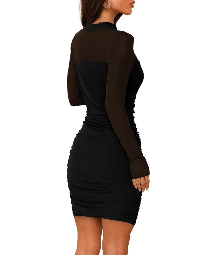 WIHOLL Women's Mesh Sheer Long Sleeve Ruched Mini Dress Sexy Bodycon Mock Neck Cocktail Party Club Dresses 2025