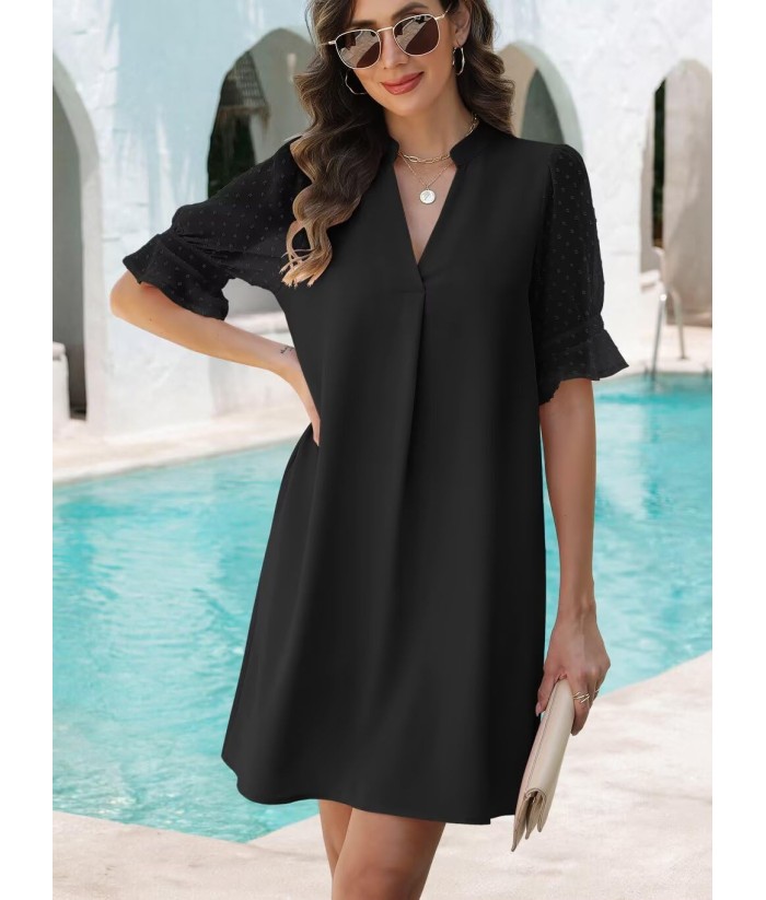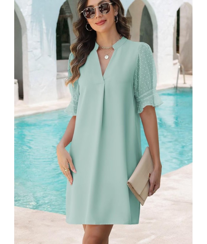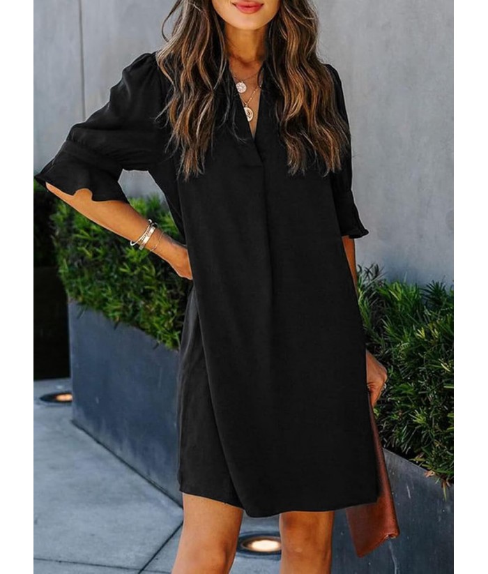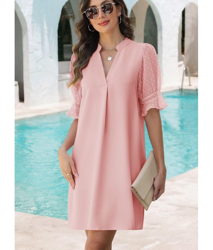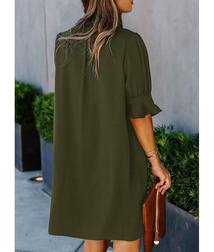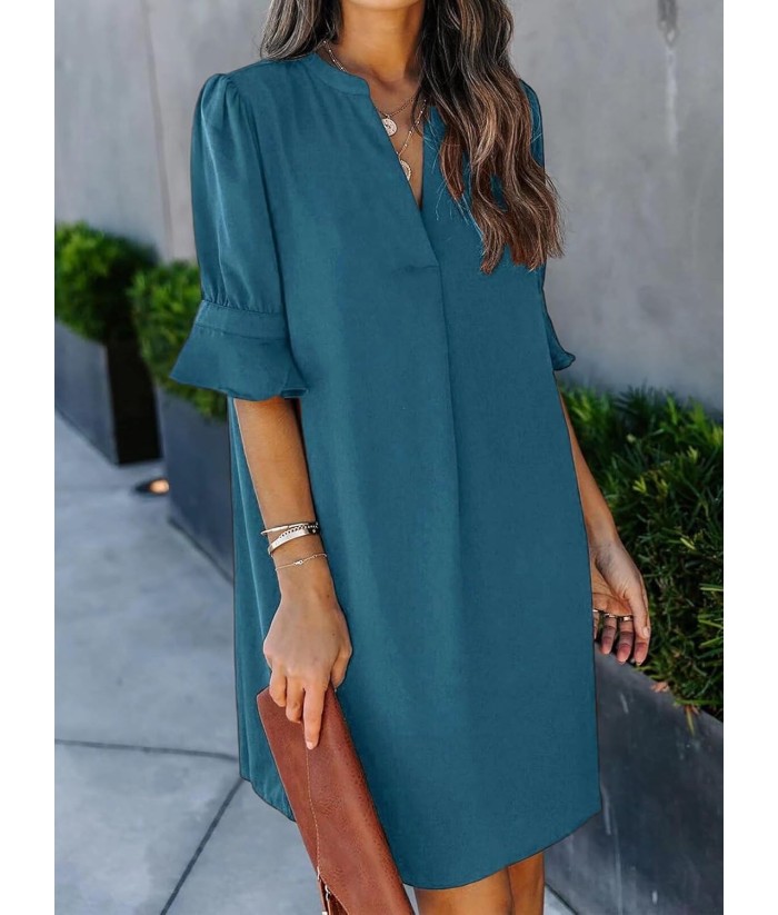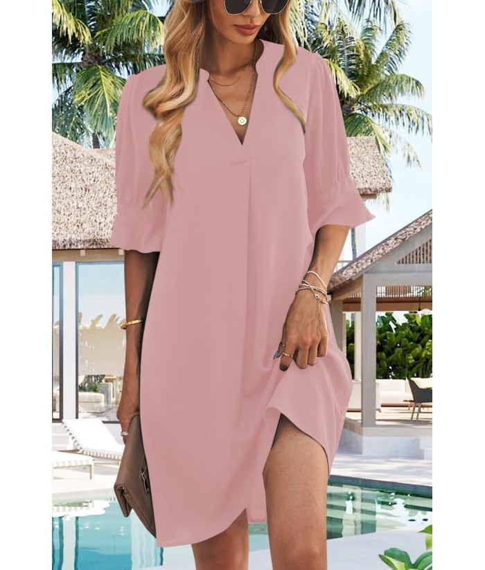 Wkior Shift Dress for Women V Neck Short Sleeves Solid Color Casual Flowy Summer Dresses(S-2XL)