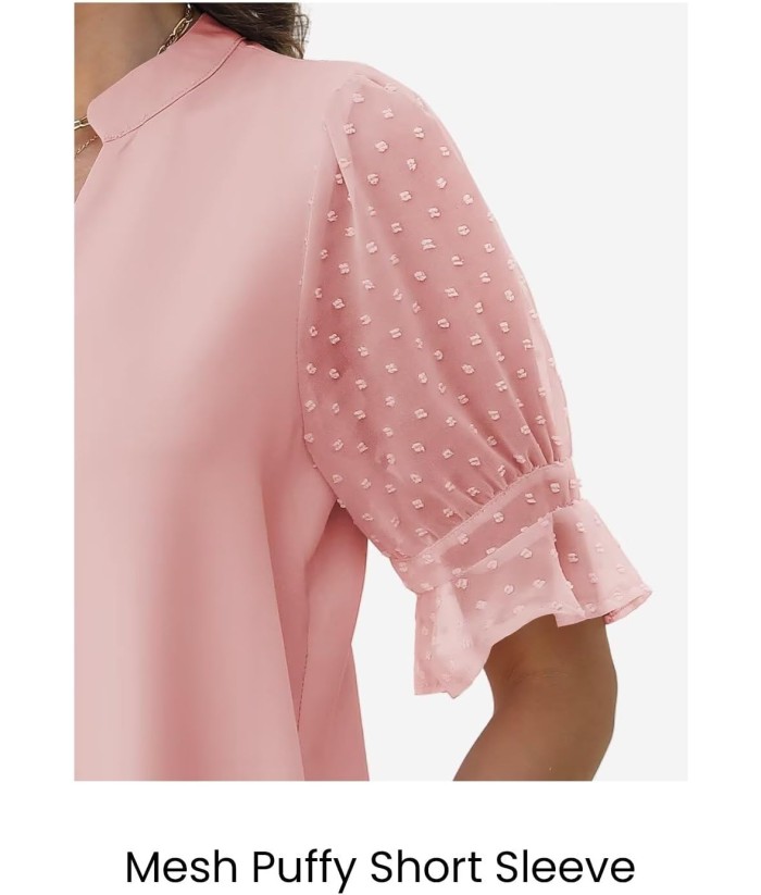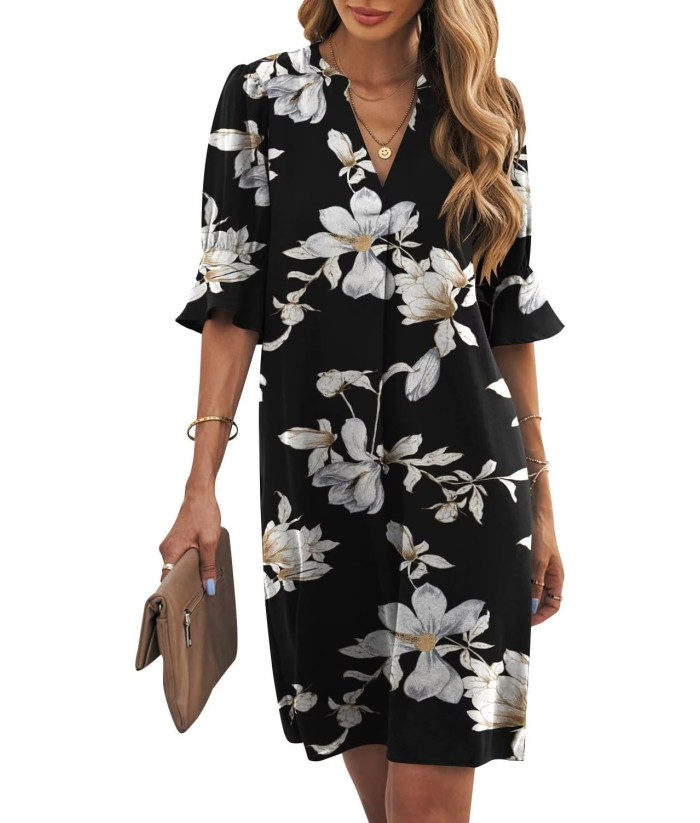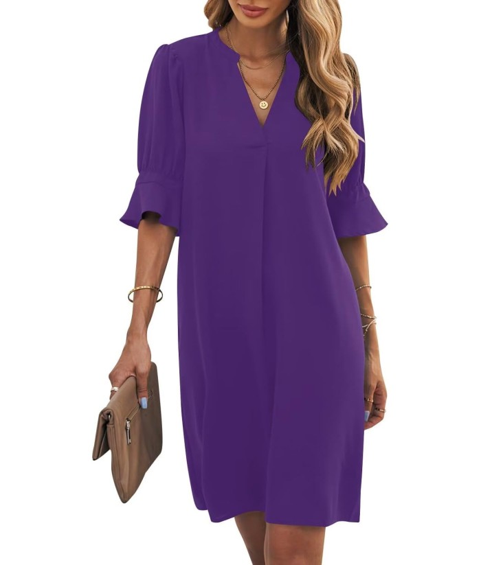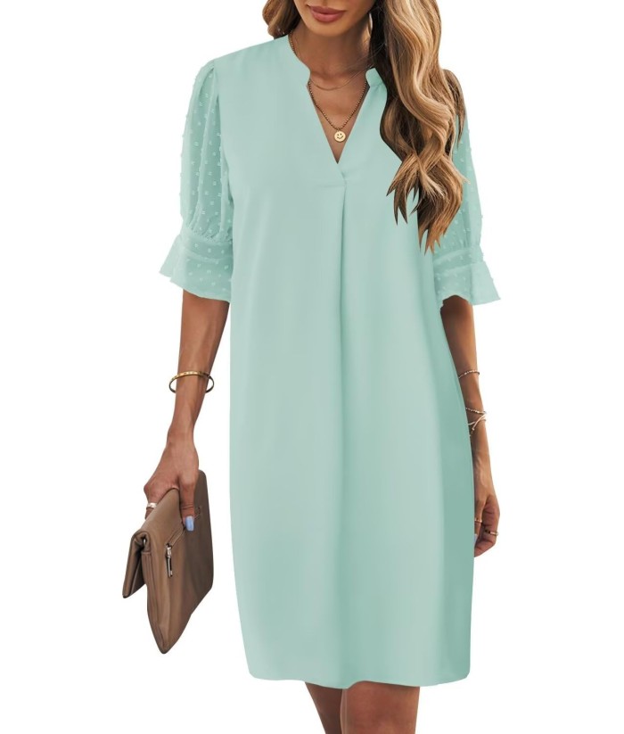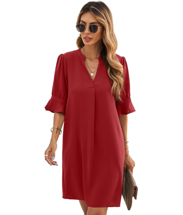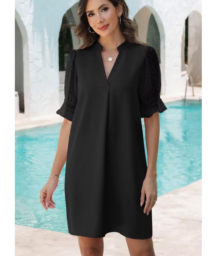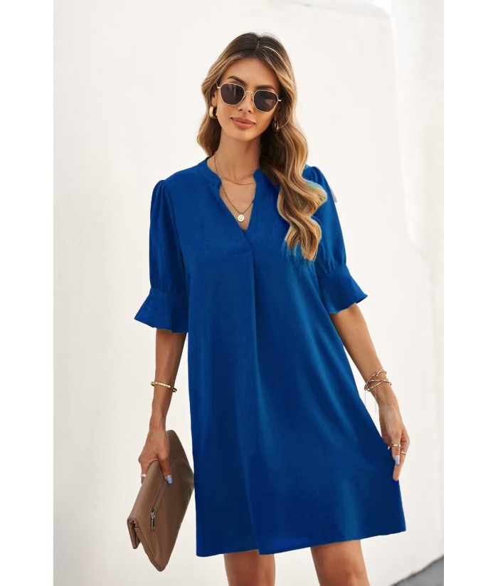 Wkior Shift Dress for Women V Neck Short Sleeves Solid Color Casual Flowy Summer Dresses(S-2XL)