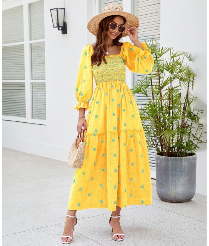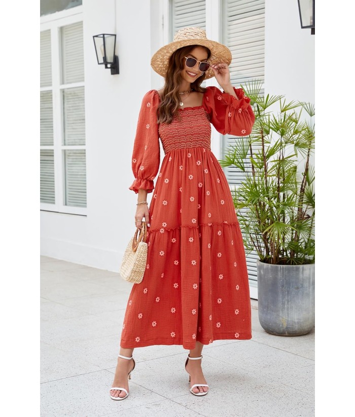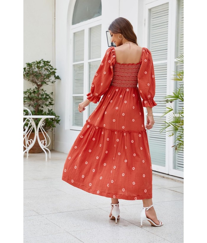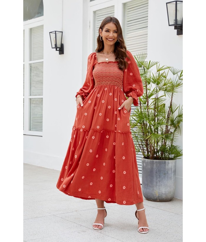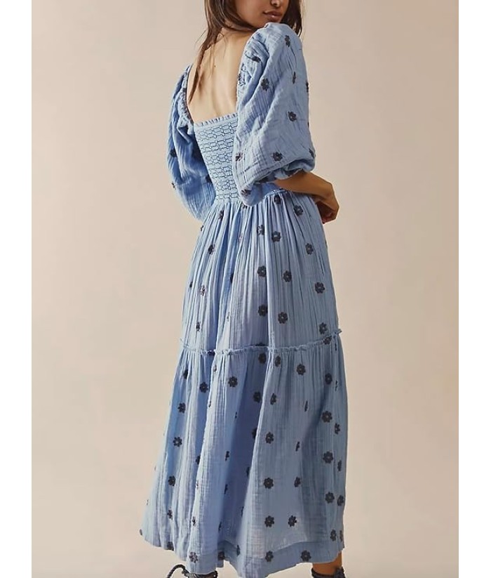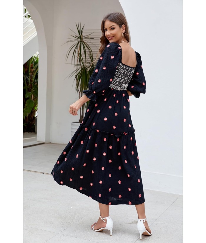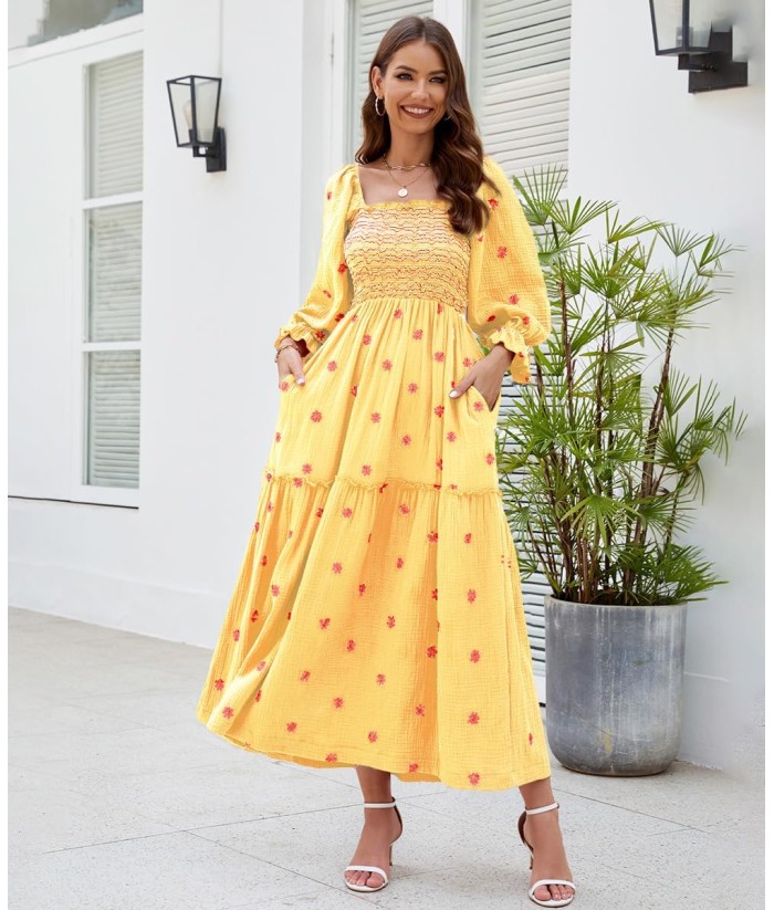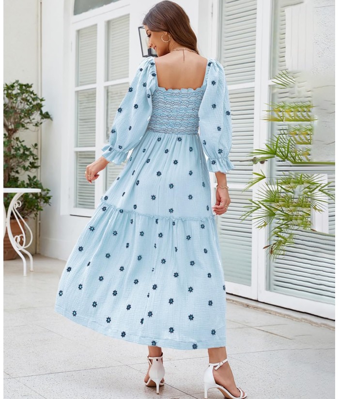 Women Floral Embroidered Maxi Dress Long Puff Sleeve Square Neck Bohemian Flowy Dress with Pockets Summer Fall