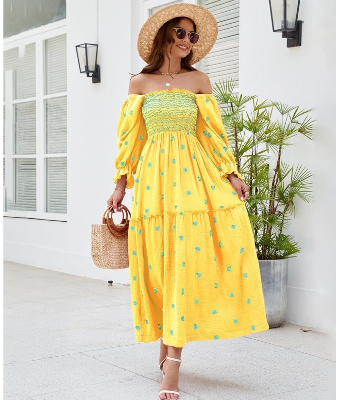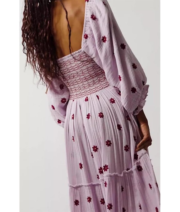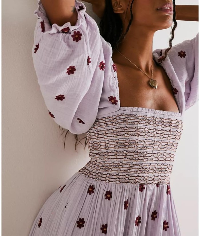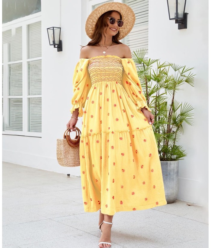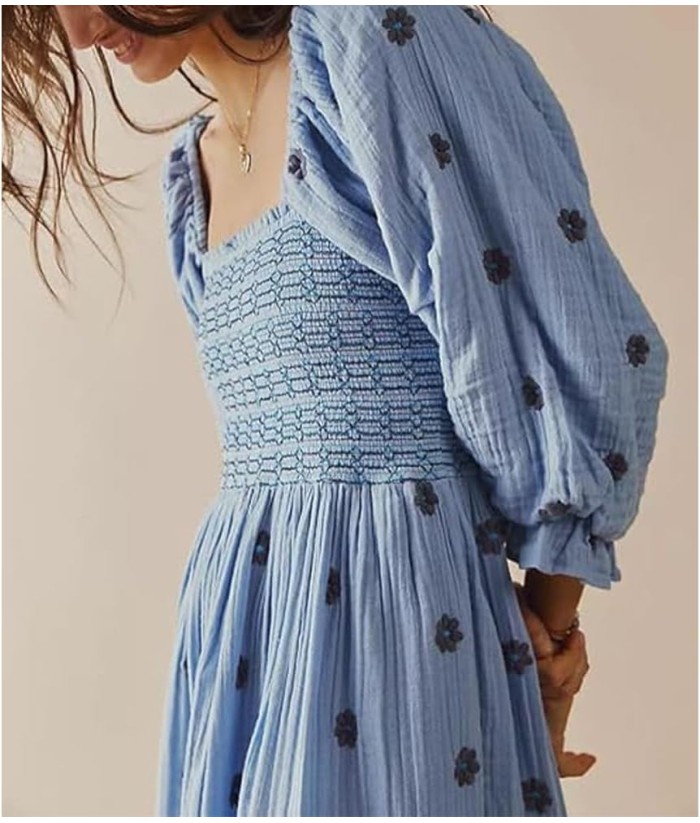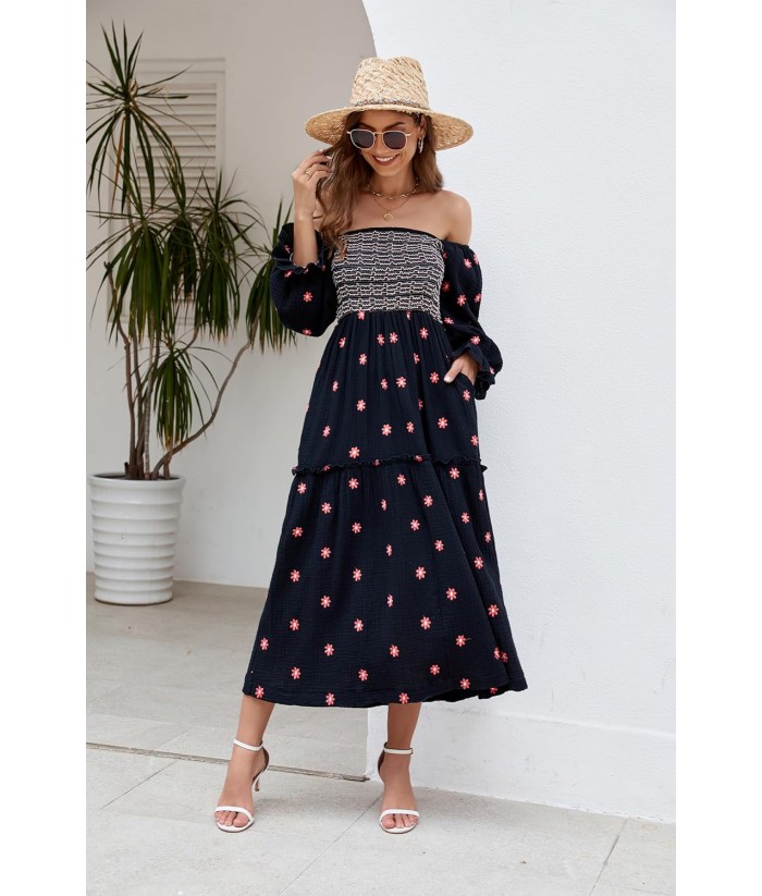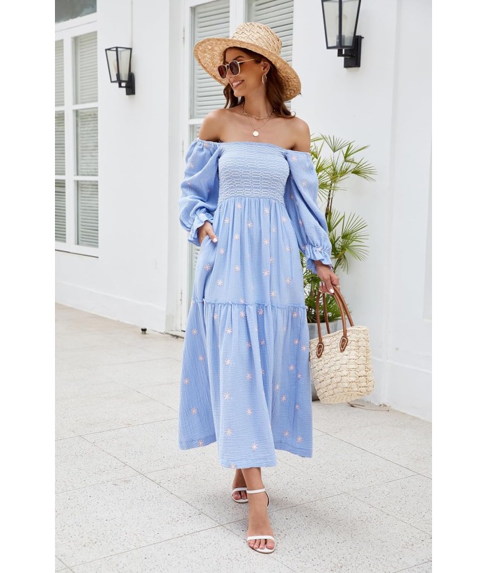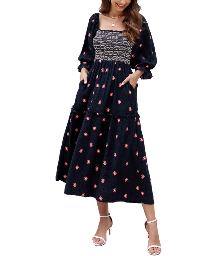 Women Floral Embroidered Maxi Dress Long Puff Sleeve Square Neck Bohemian Flowy Dress with Pockets Summer Fall