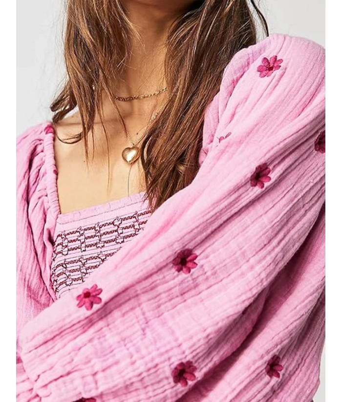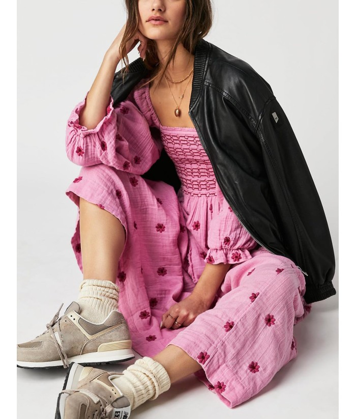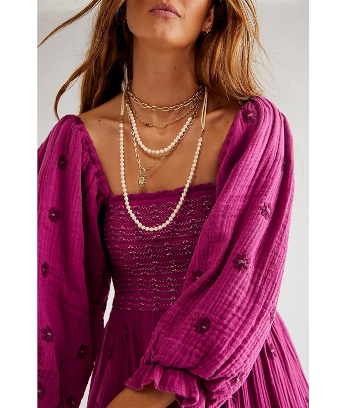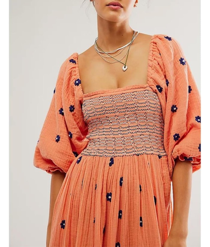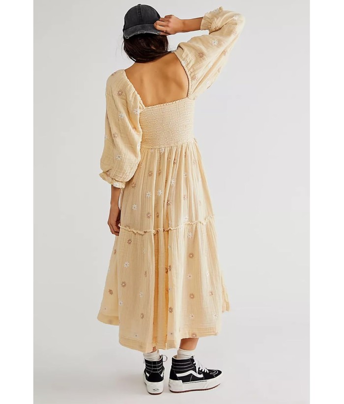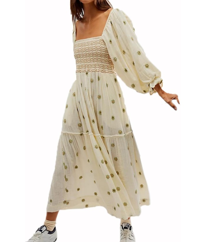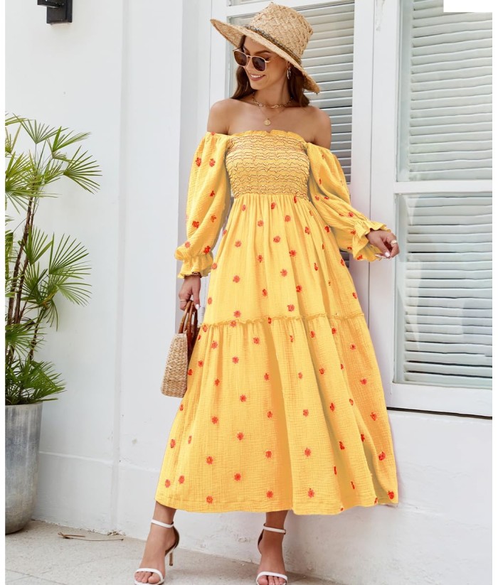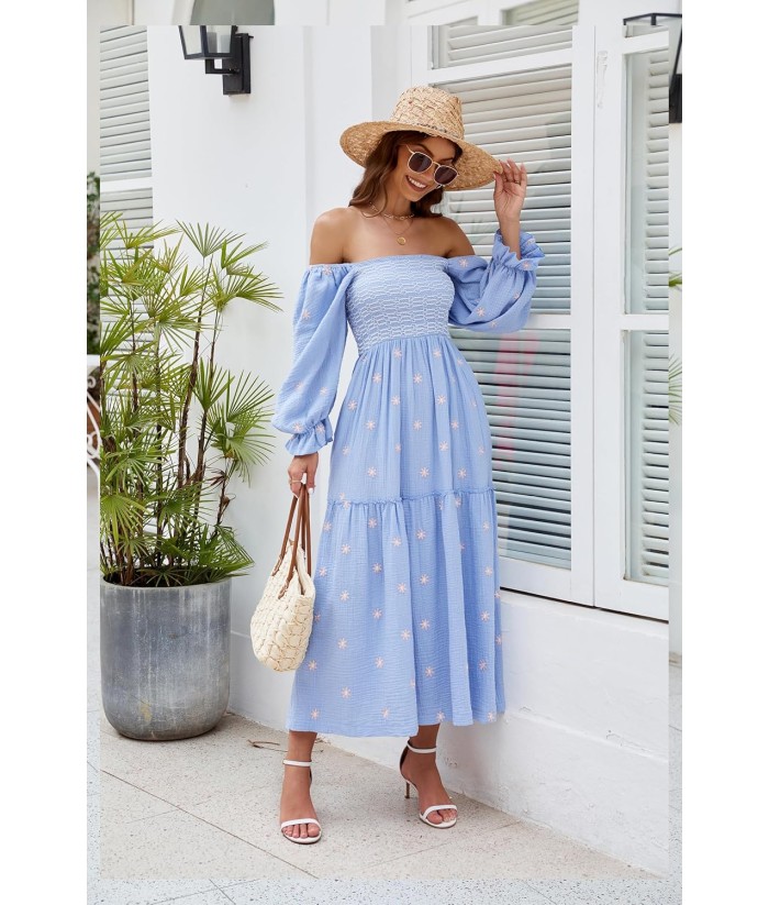 Women Floral Embroidered Maxi Dress Long Puff Sleeve Square Neck Bohemian Flowy Dress with Pockets Summer Fall