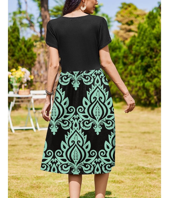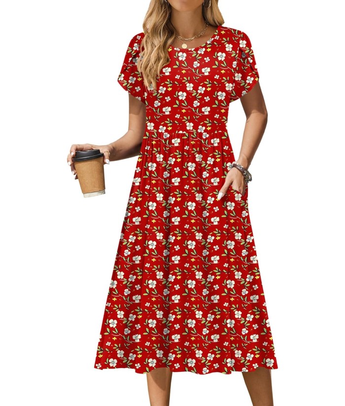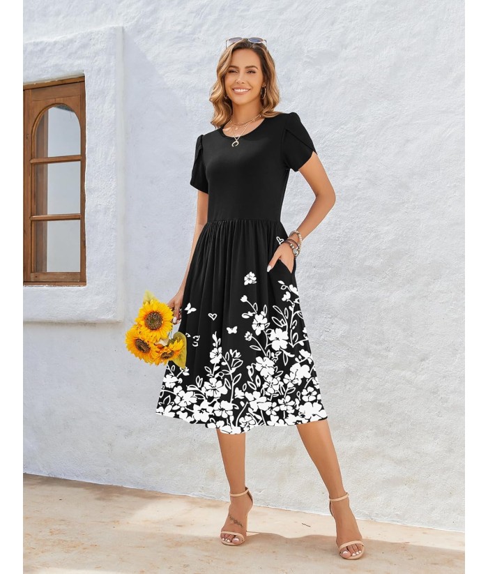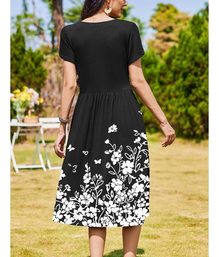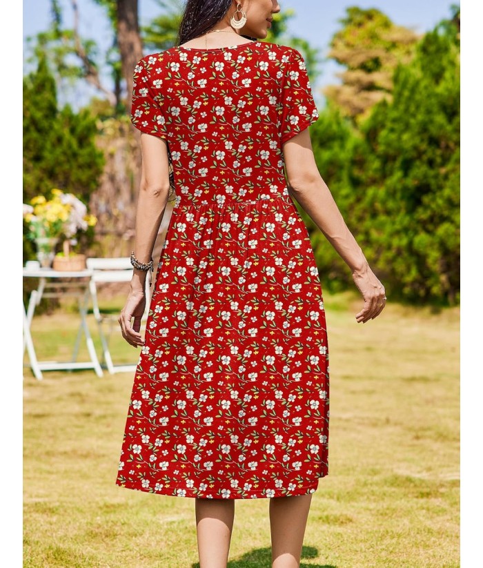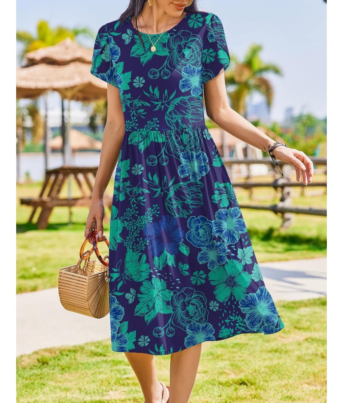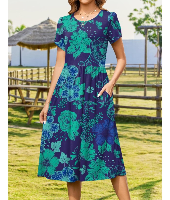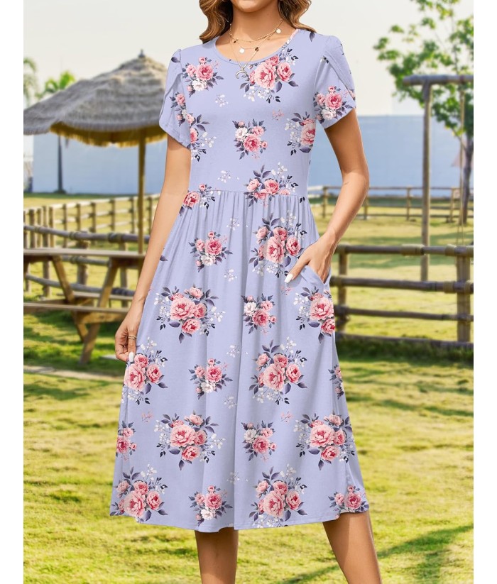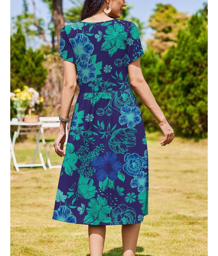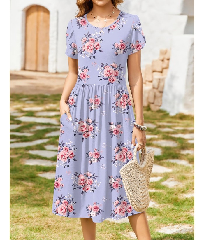 Zeagoo Women Summer Short Sleeve Midi Dress with Pockets Casual Aline Flowy Tshirt Dress Floral Vocation Beach Sundress