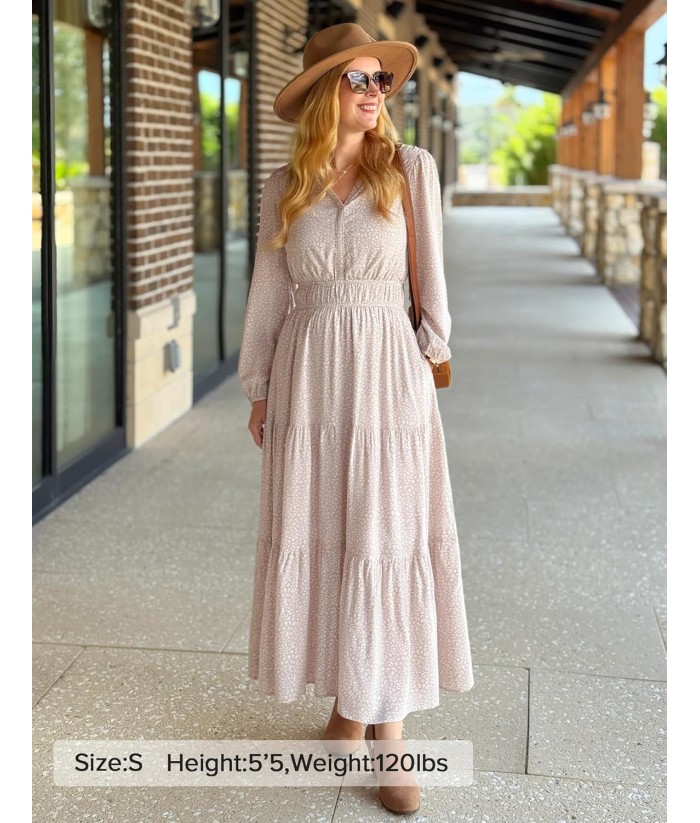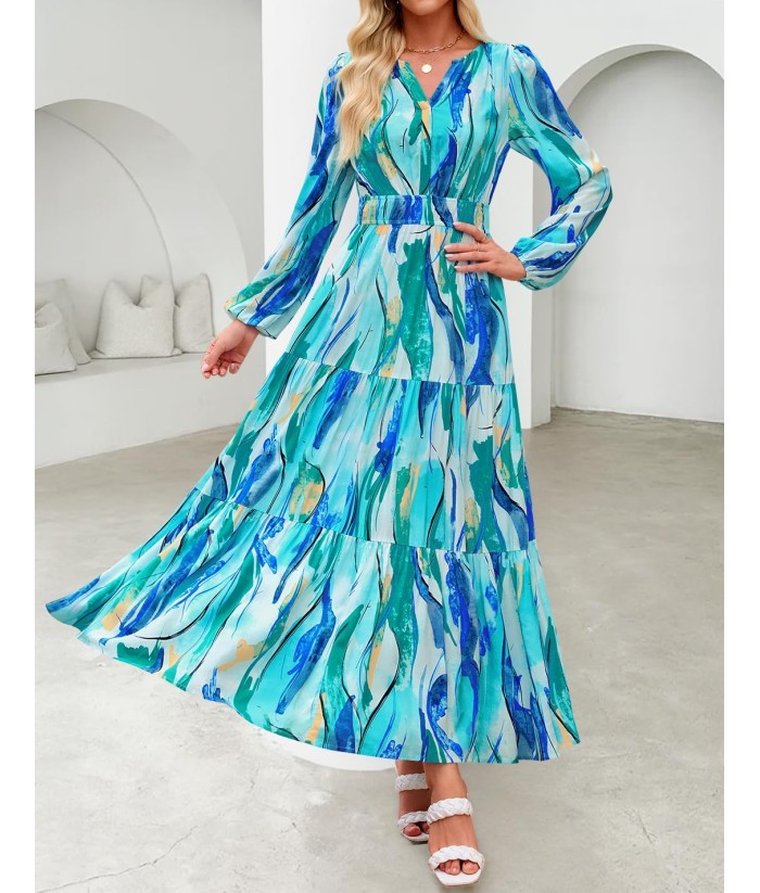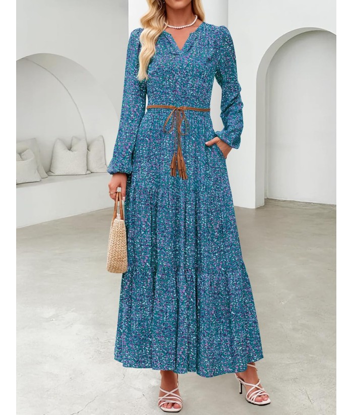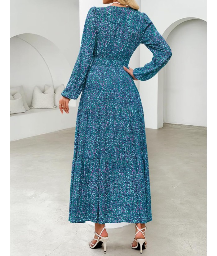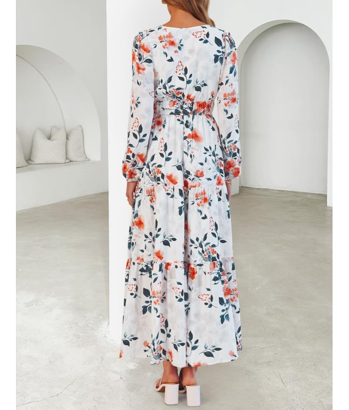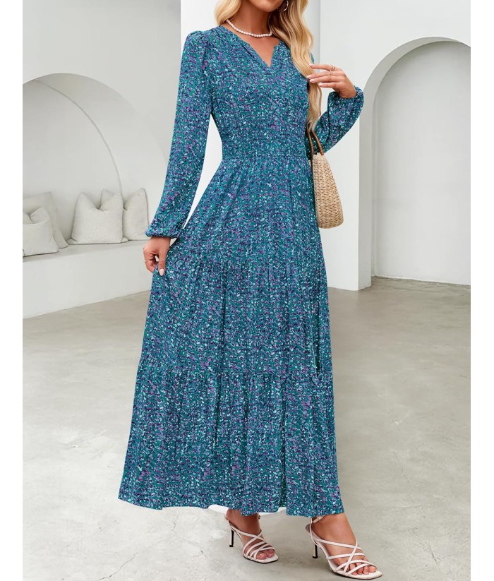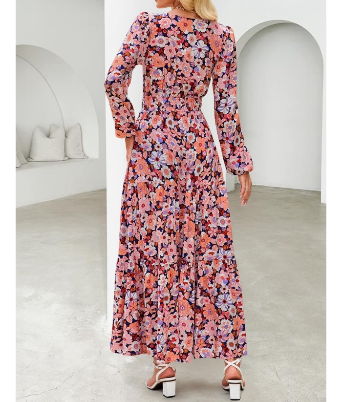 ZESICA Women's 2025 Fall Long Sleeve Maxi Dress Floral Print V Neck Empire Waist A Line Tiered Flowy Boho Party Dresses
