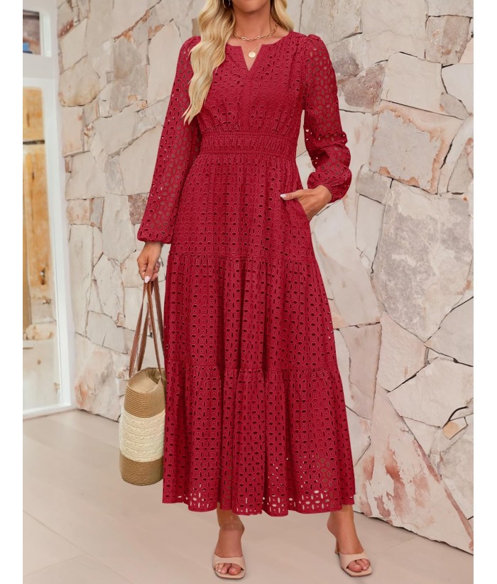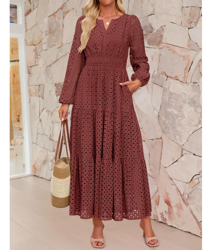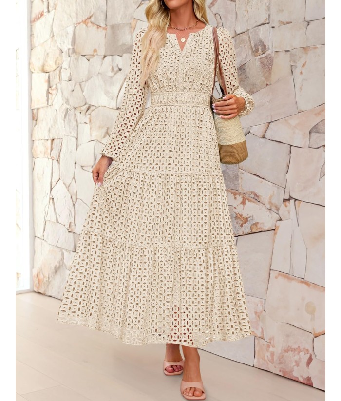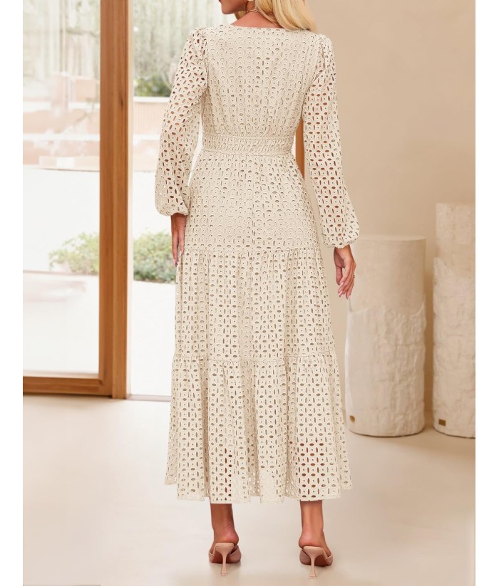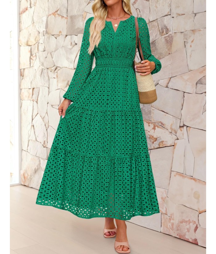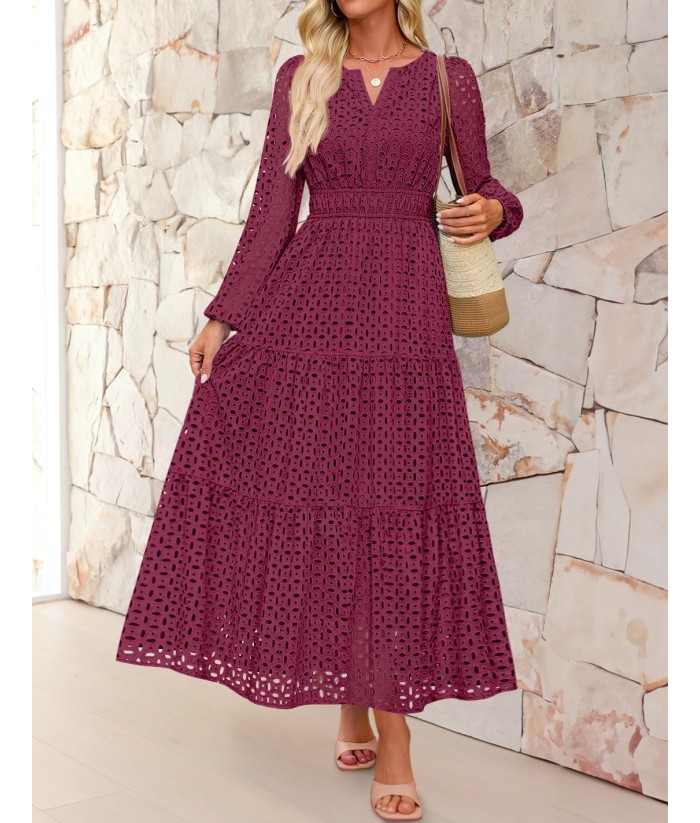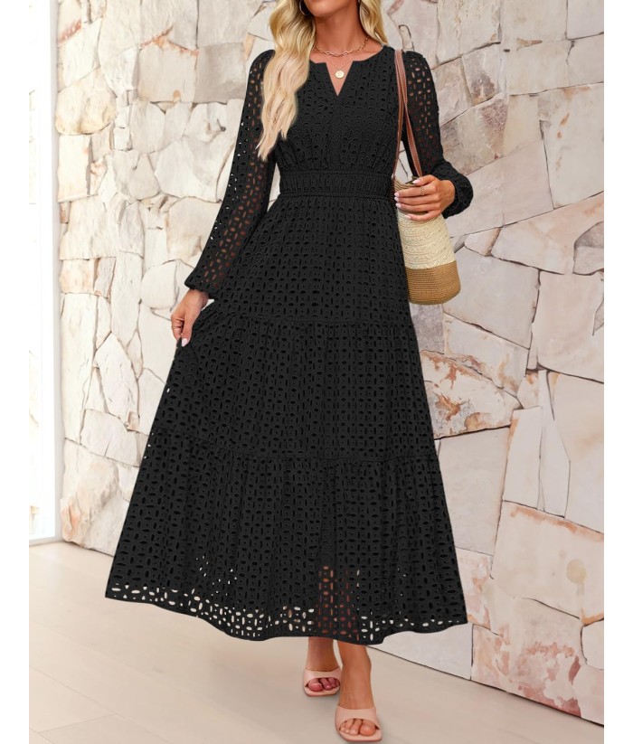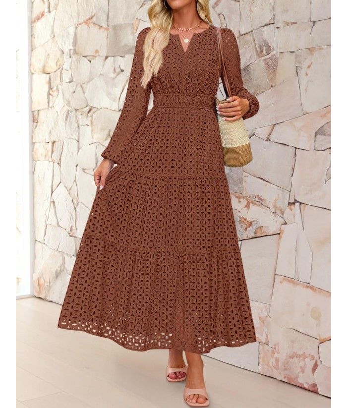 ZESICA Women's 2025 Fall Long Sleeve Maxi Dress V Neck Hollow Out Eyelet A Line Long Flowy Casual Party Dresses