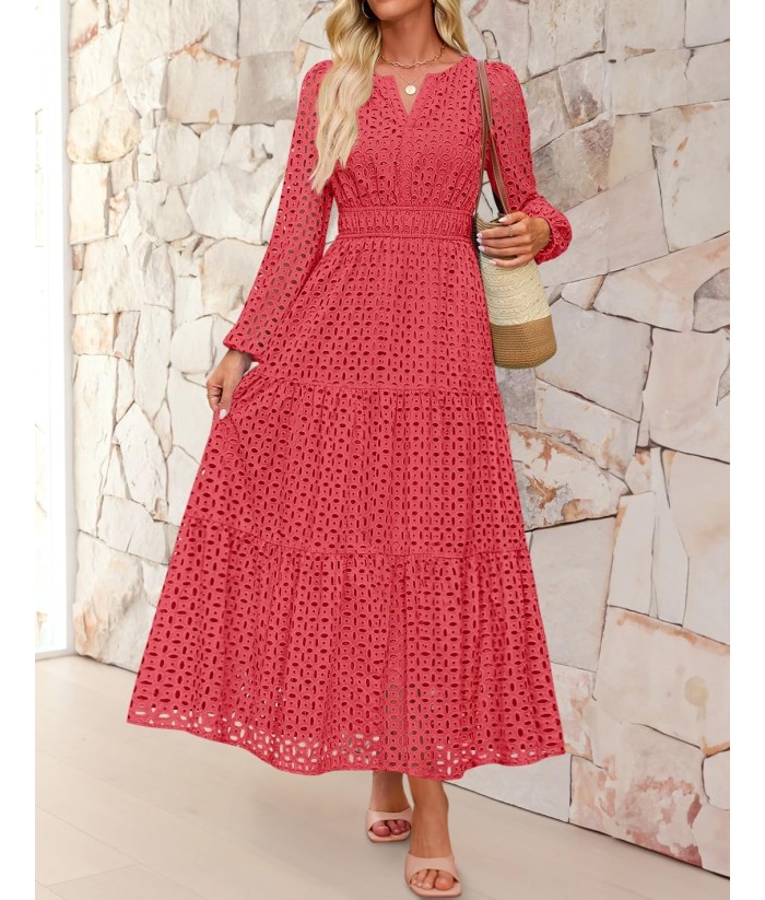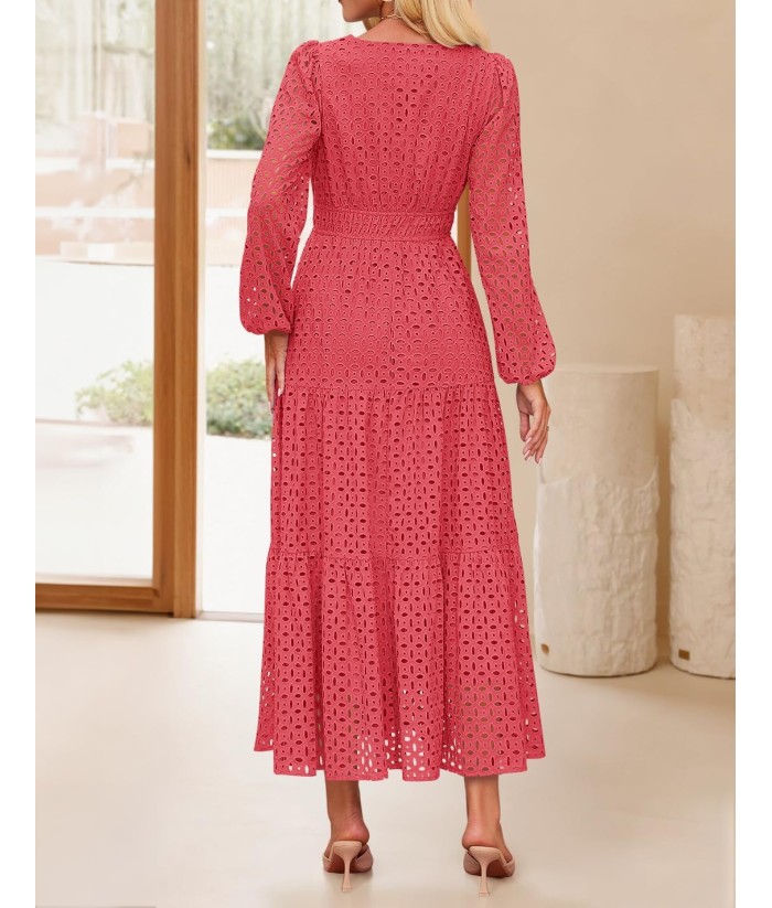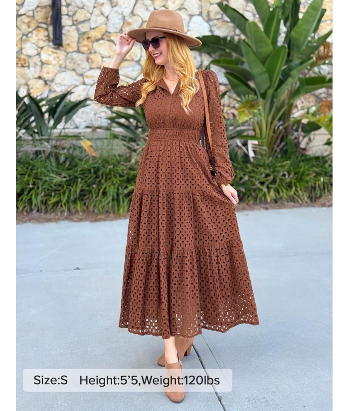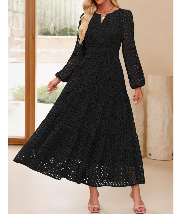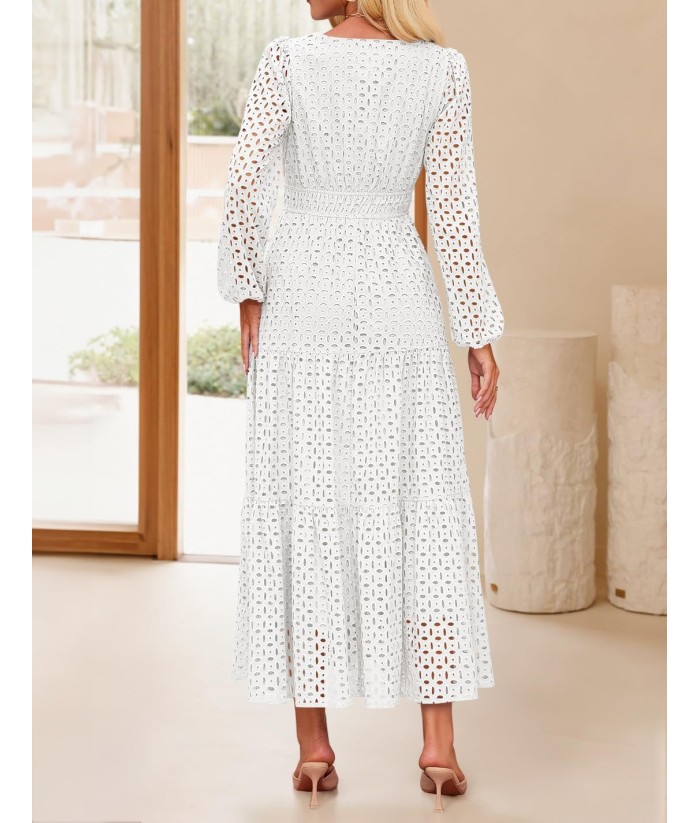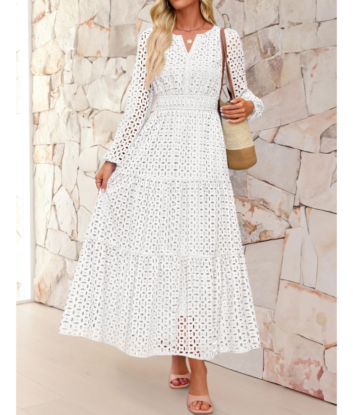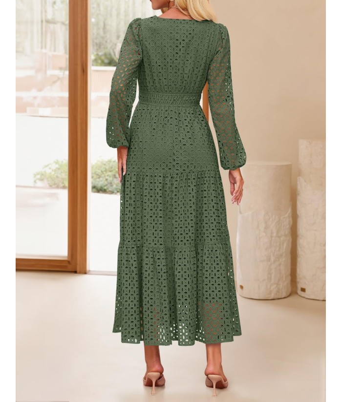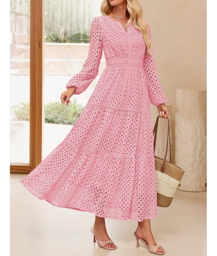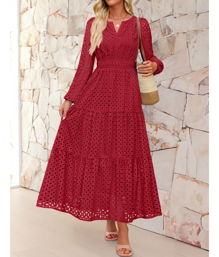 ZESICA Women's 2025 Fall Long Sleeve Maxi Dress V Neck Hollow Out Eyelet A Line Long Flowy Casual Party Dresses