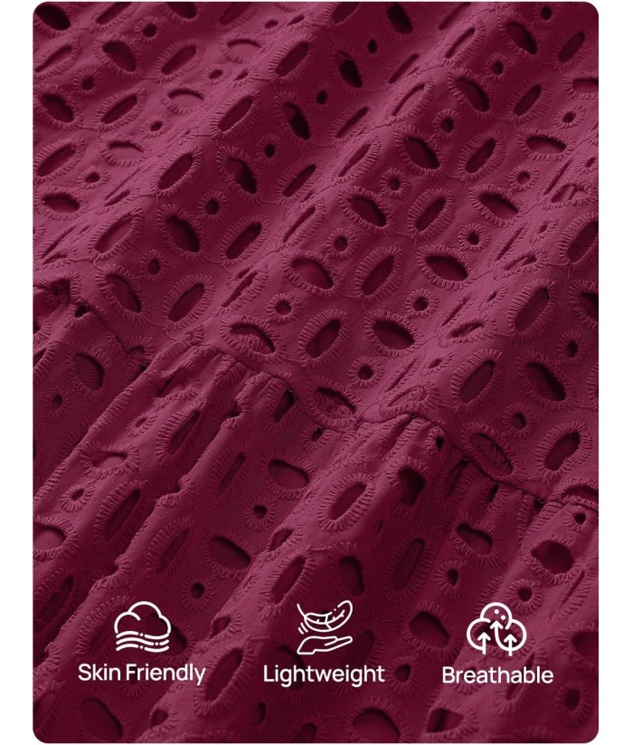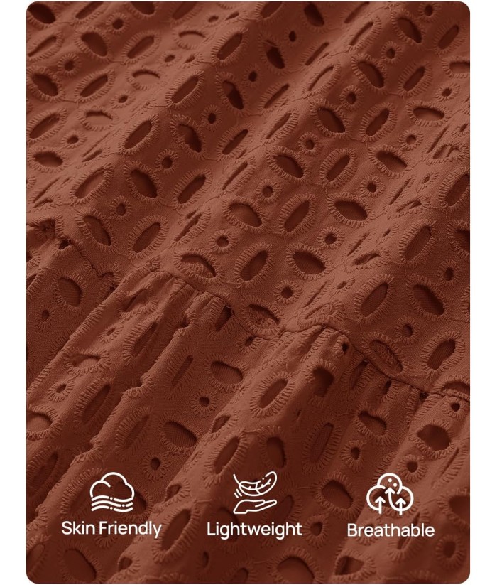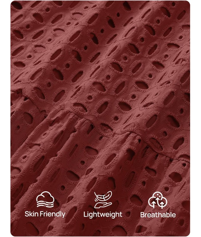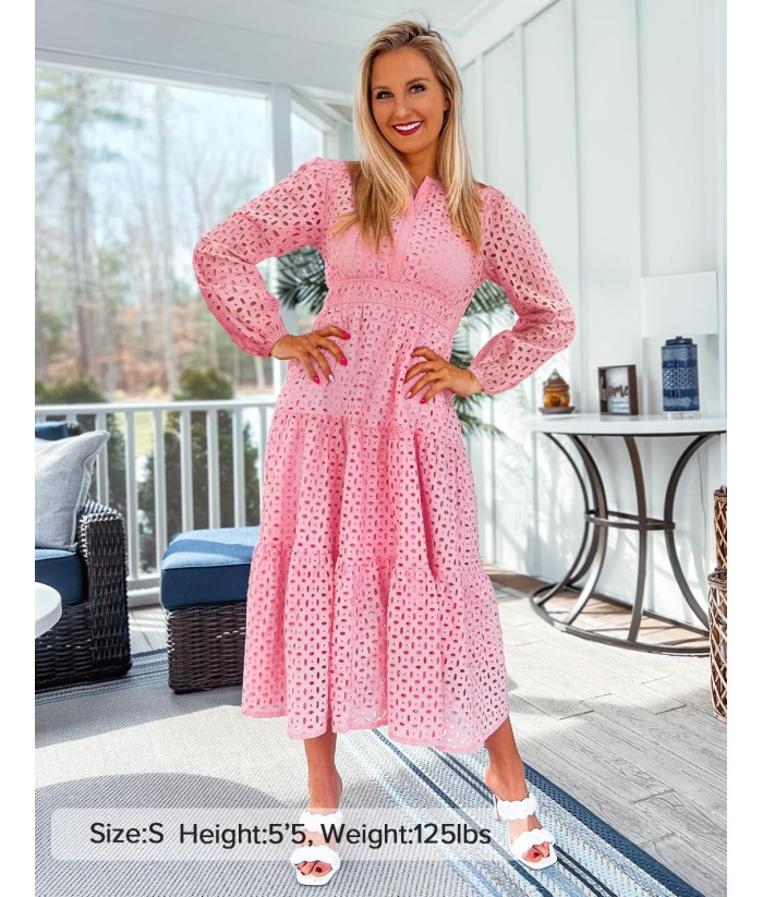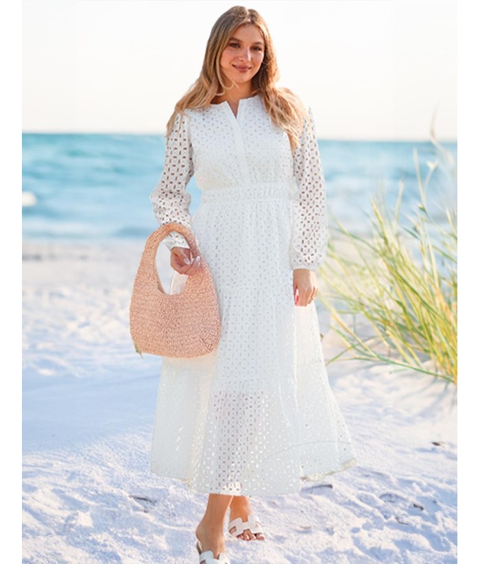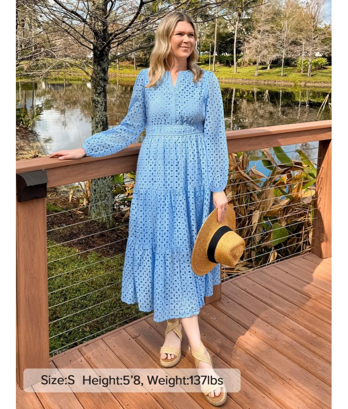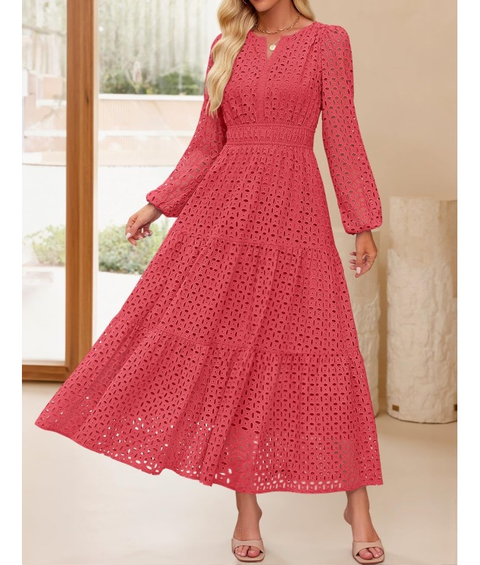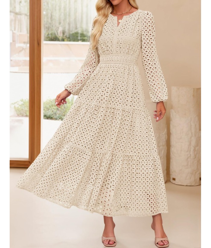 ZESICA Women's 2025 Fall Long Sleeve Maxi Dress V Neck Hollow Out Eyelet A Line Long Flowy Casual Party Dresses
