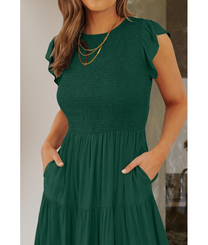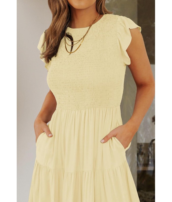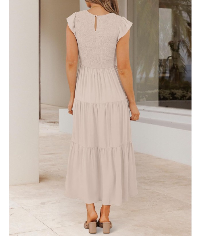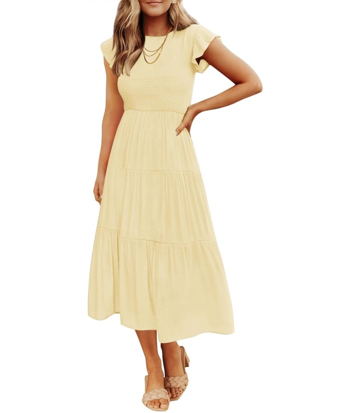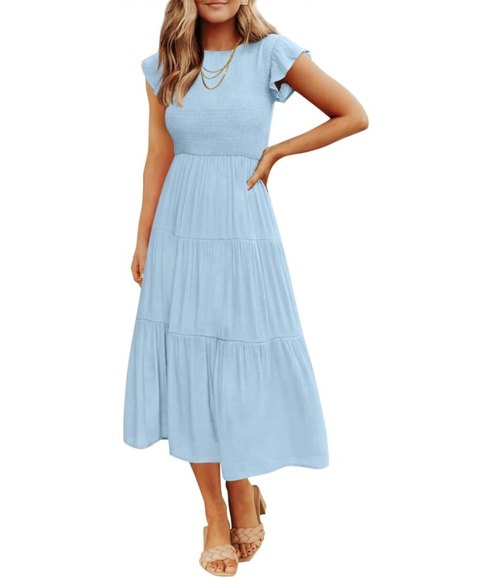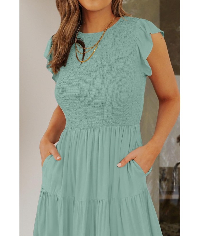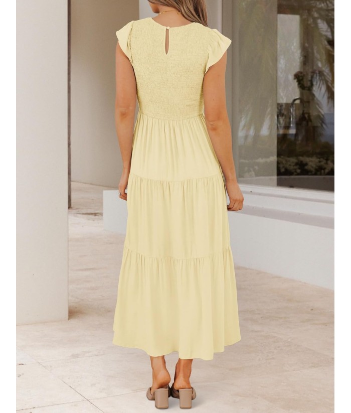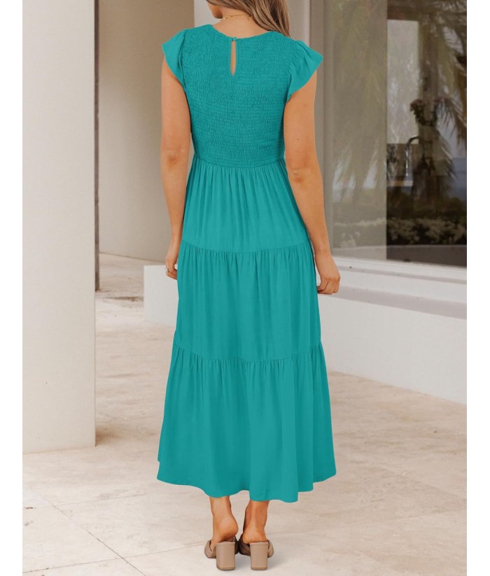 ZESICA Women's 2025 Summer Casual Flutter Short Sleeve Crew Neck Smocked Elastic Waist Tiered Midi Dress