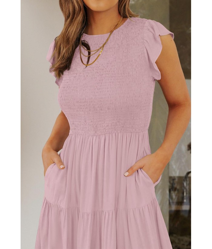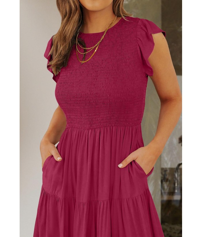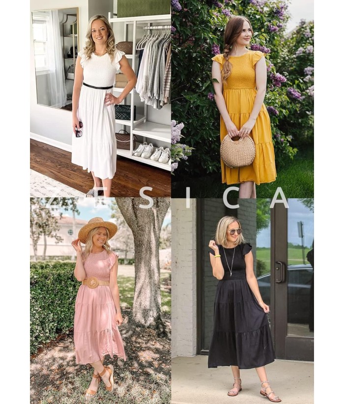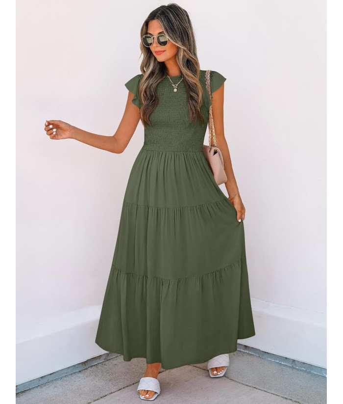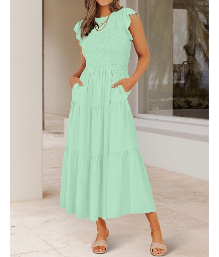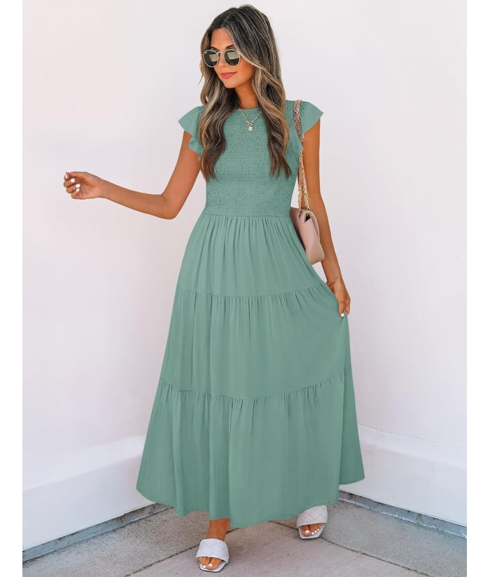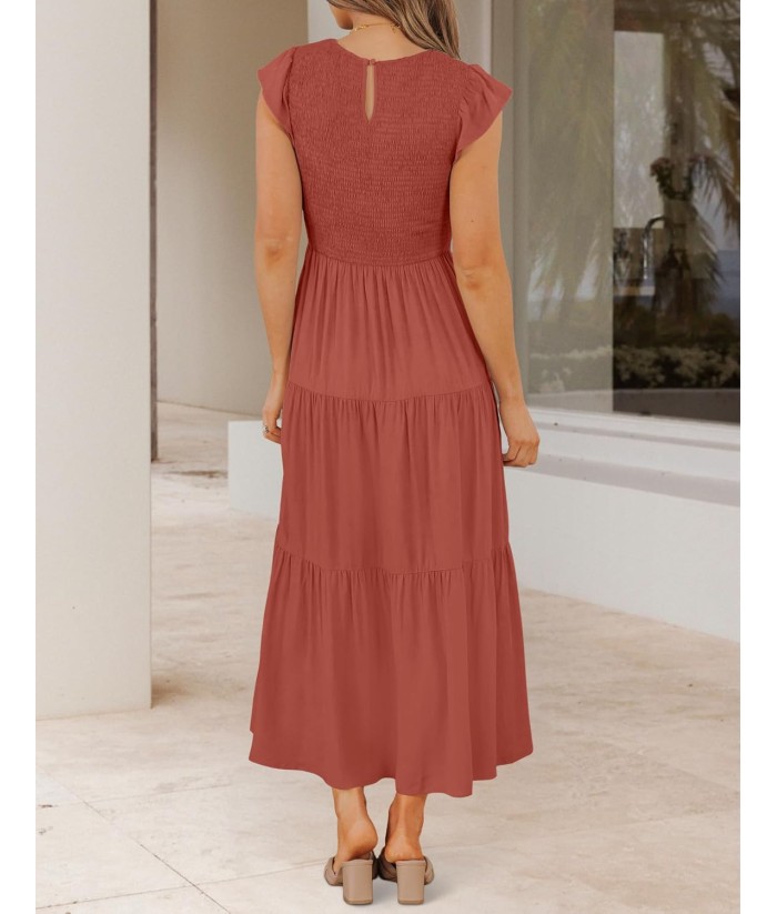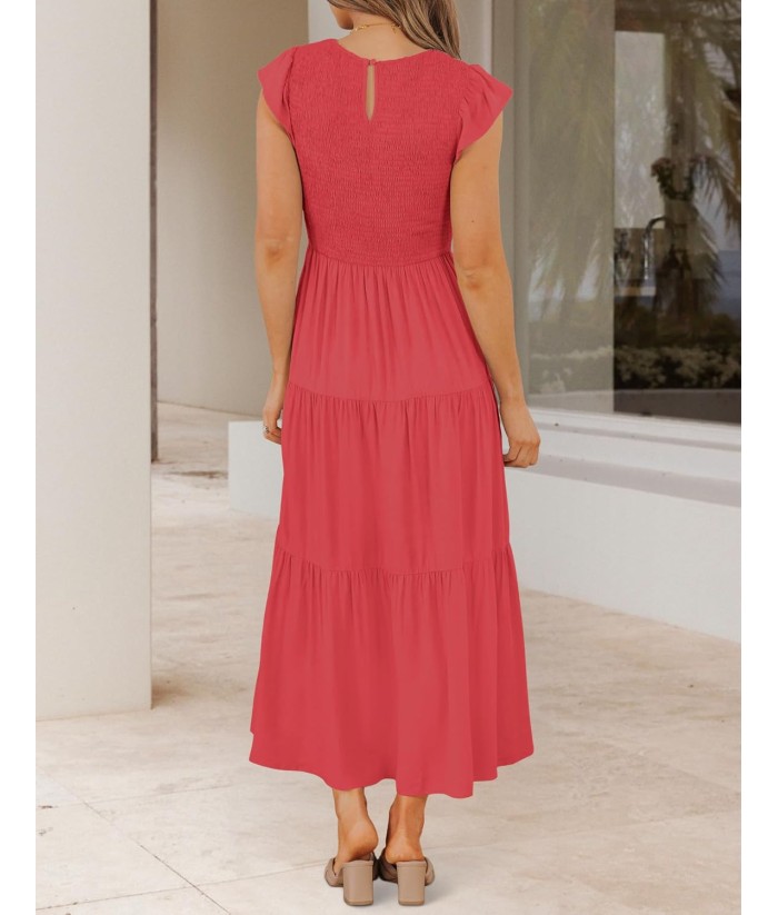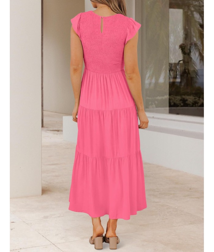ZESICA Women's 2025 Summer Casual Flutter Short Sleeve Crew Neck Smocked Elastic Waist Tiered Midi Dress