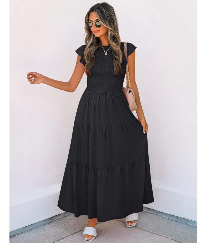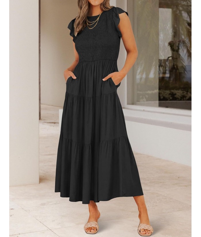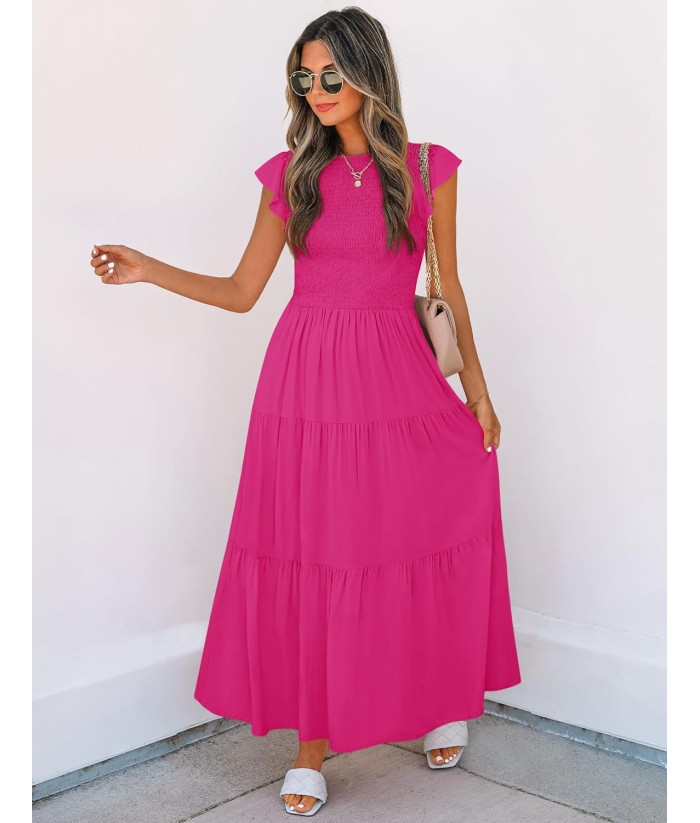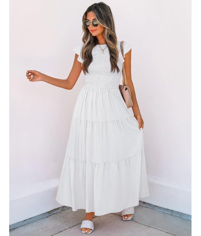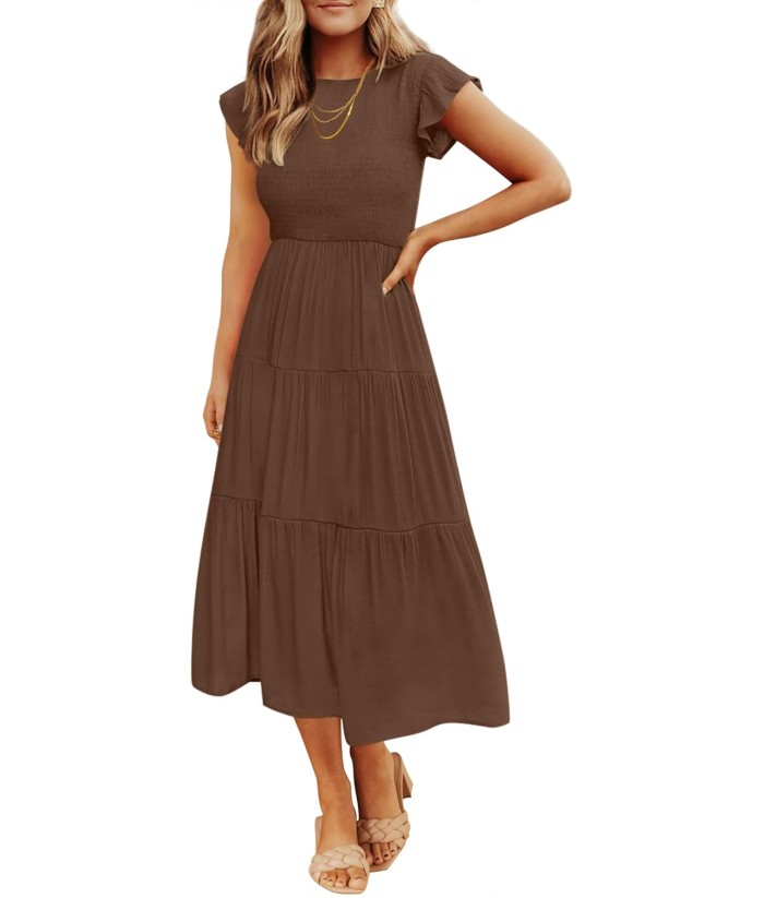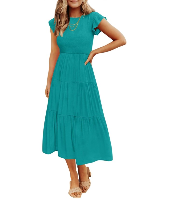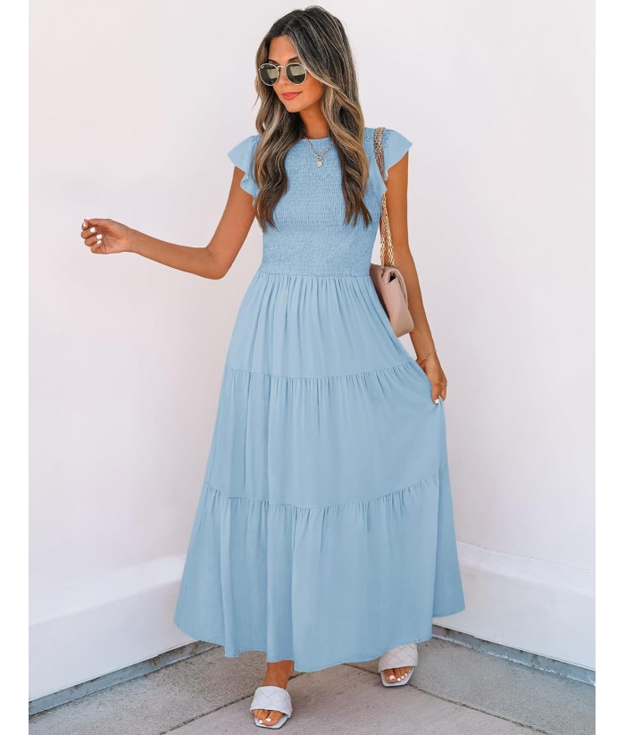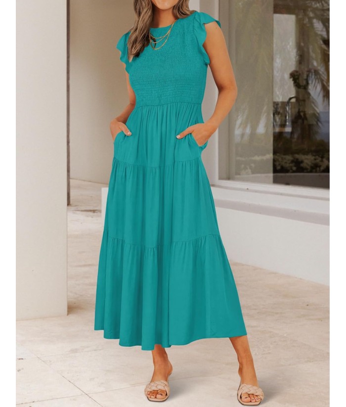 ZESICA Women's 2025 Summer Casual Flutter Short Sleeve Crew Neck Smocked Elastic Waist Tiered Midi Dress