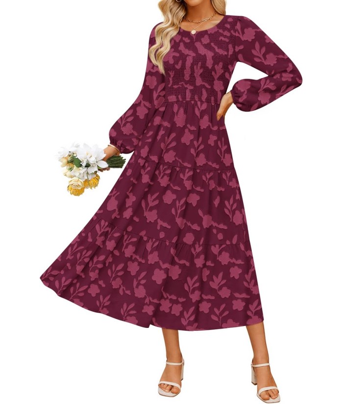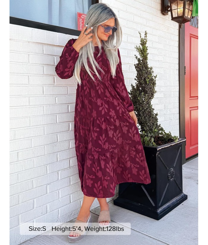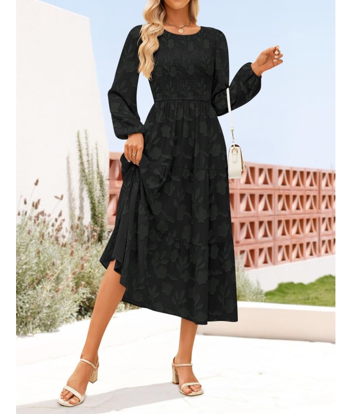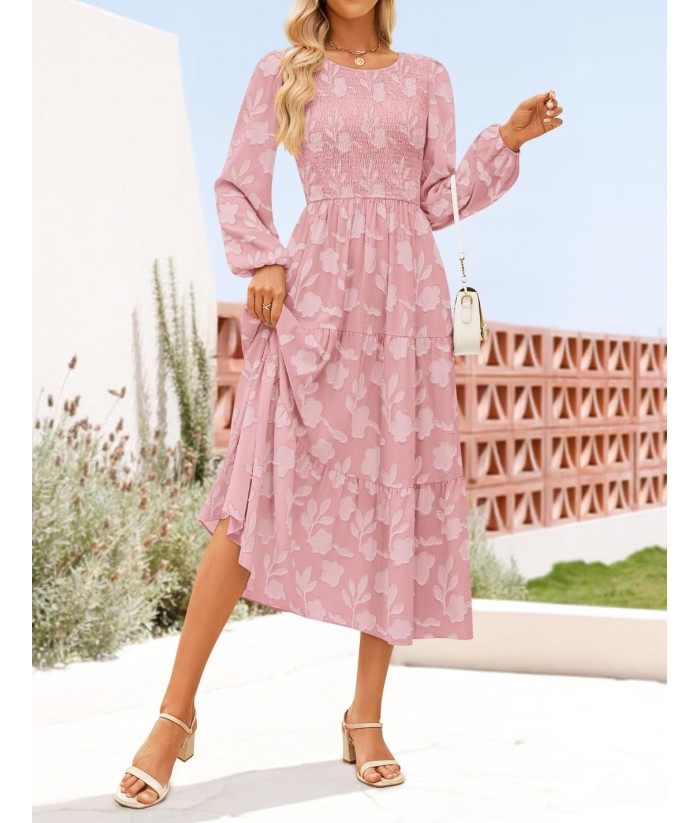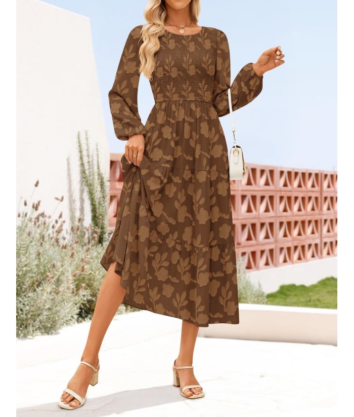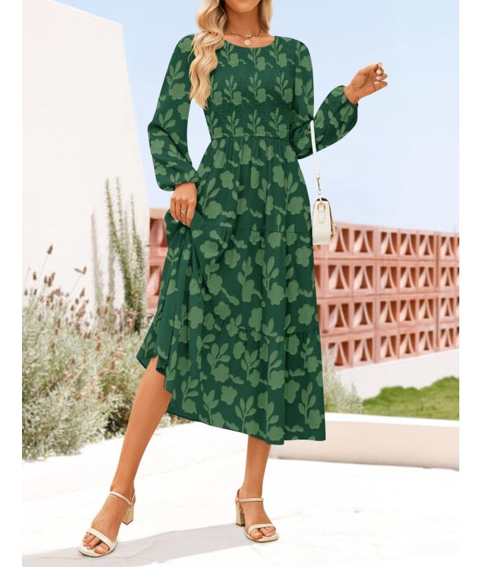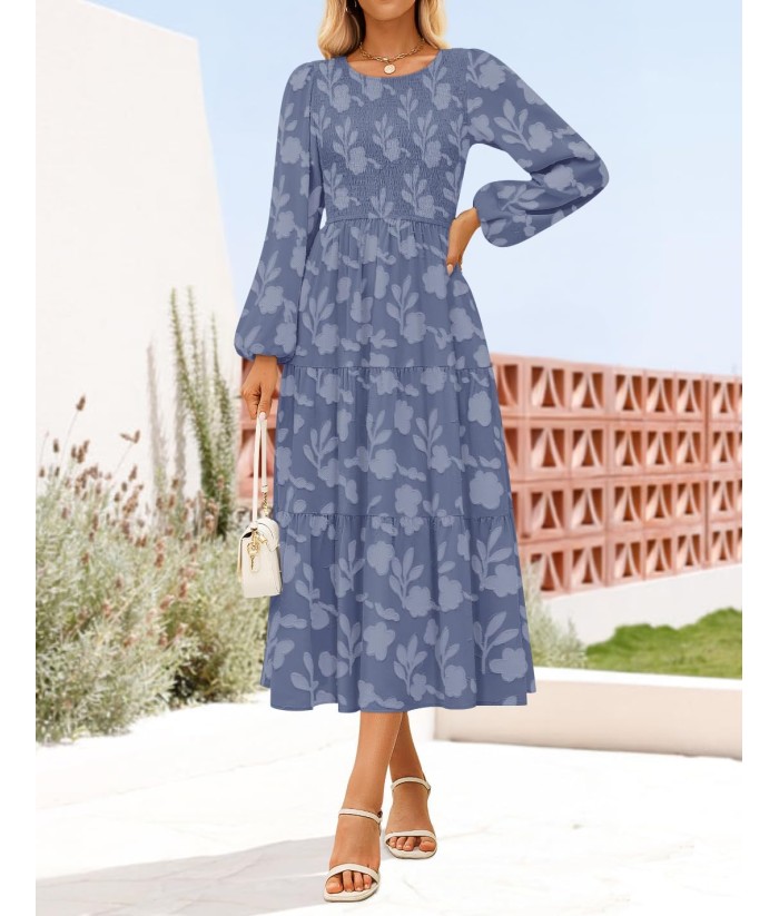 ZESICA Women's Fall Boho Floral Midi Dress 2025 Casual Long Sleeve Crewneck Flowy Wedding Guest Long Dresses