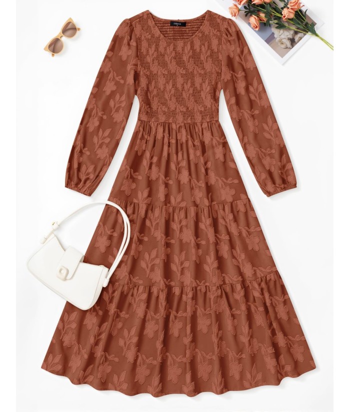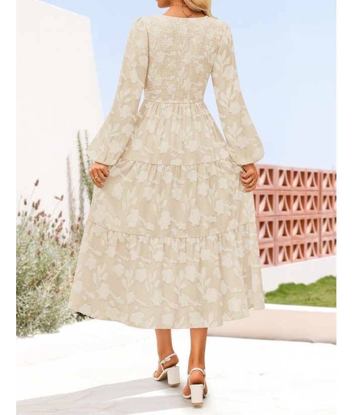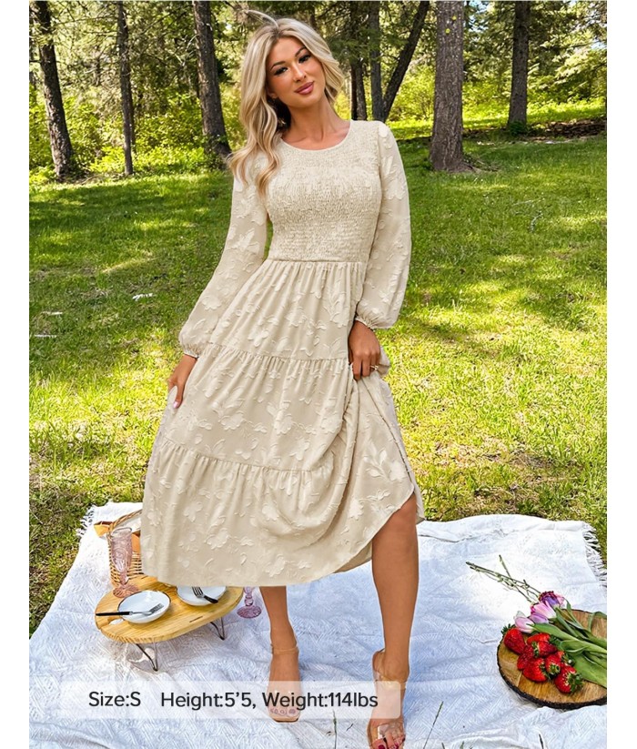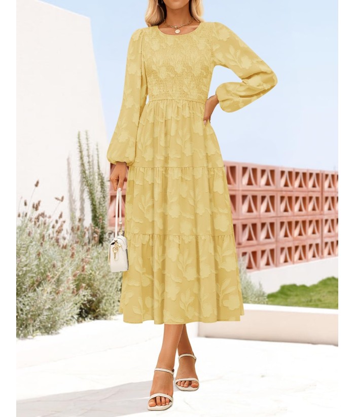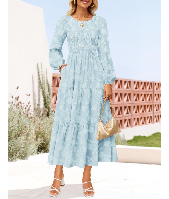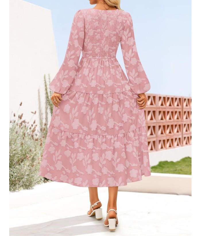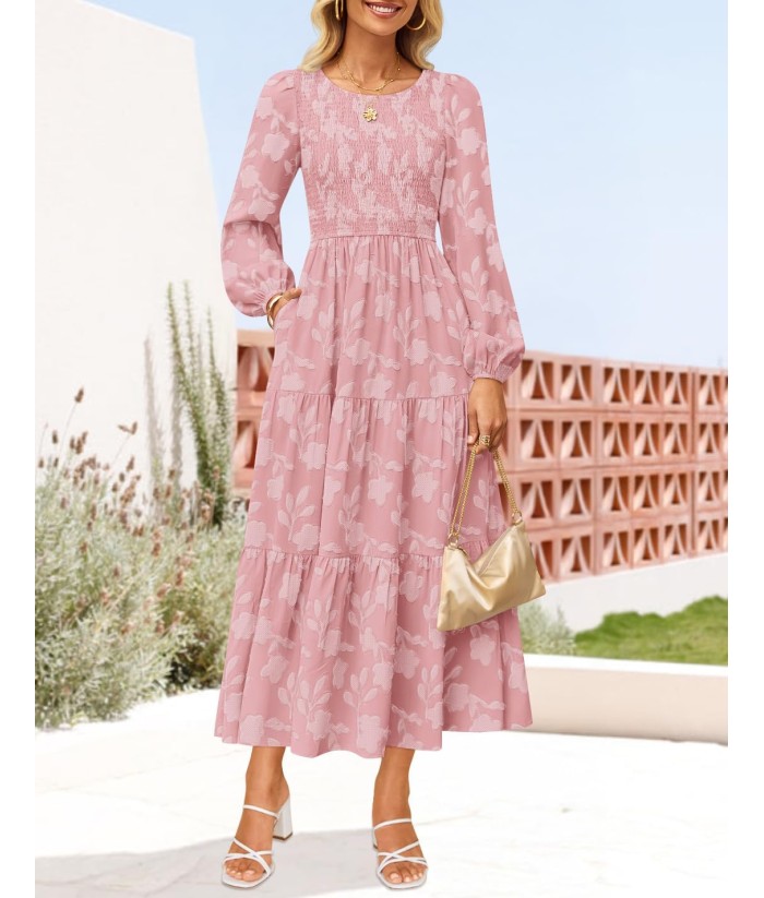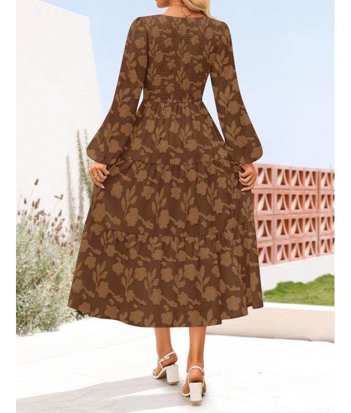ZESICA Women's Fall Boho Floral Midi Dress 2025 Casual Long Sleeve Crewneck Flowy Wedding Guest Long Dresses