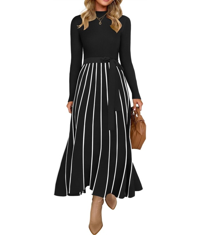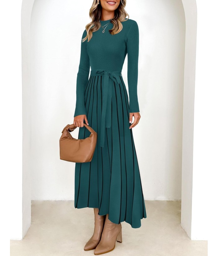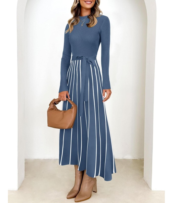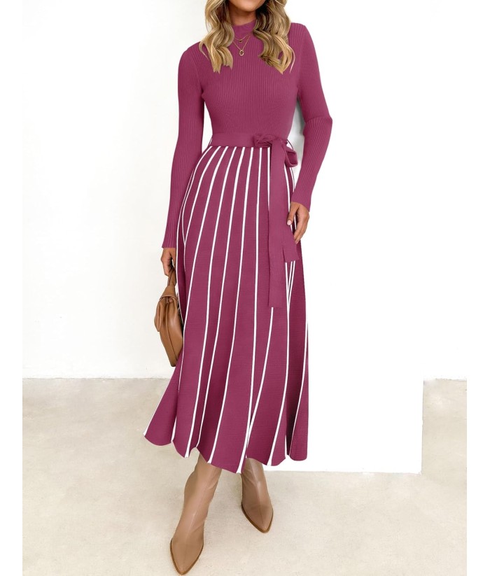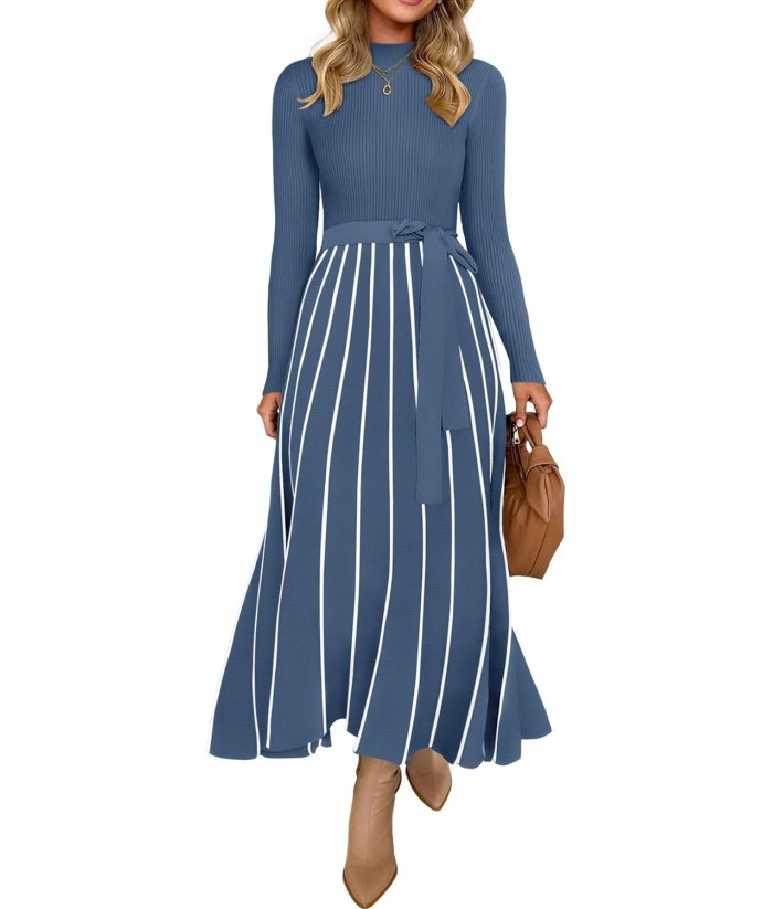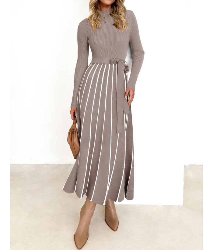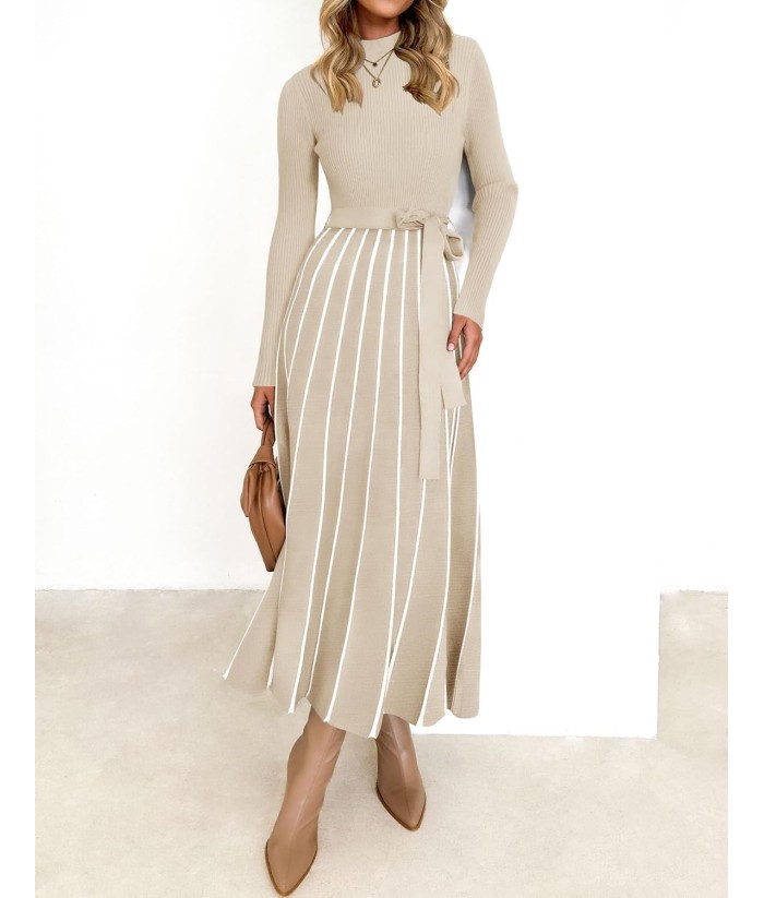 ZESICA Womens 2025 Fall Turtleneck Long Sleeve Sweater Dress Tie Waist Casual Loose Ribbed Knit A Line Midi Dresses